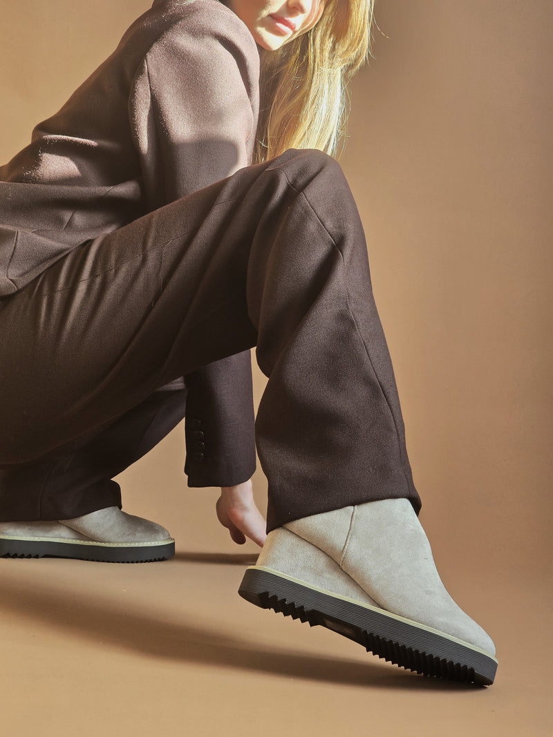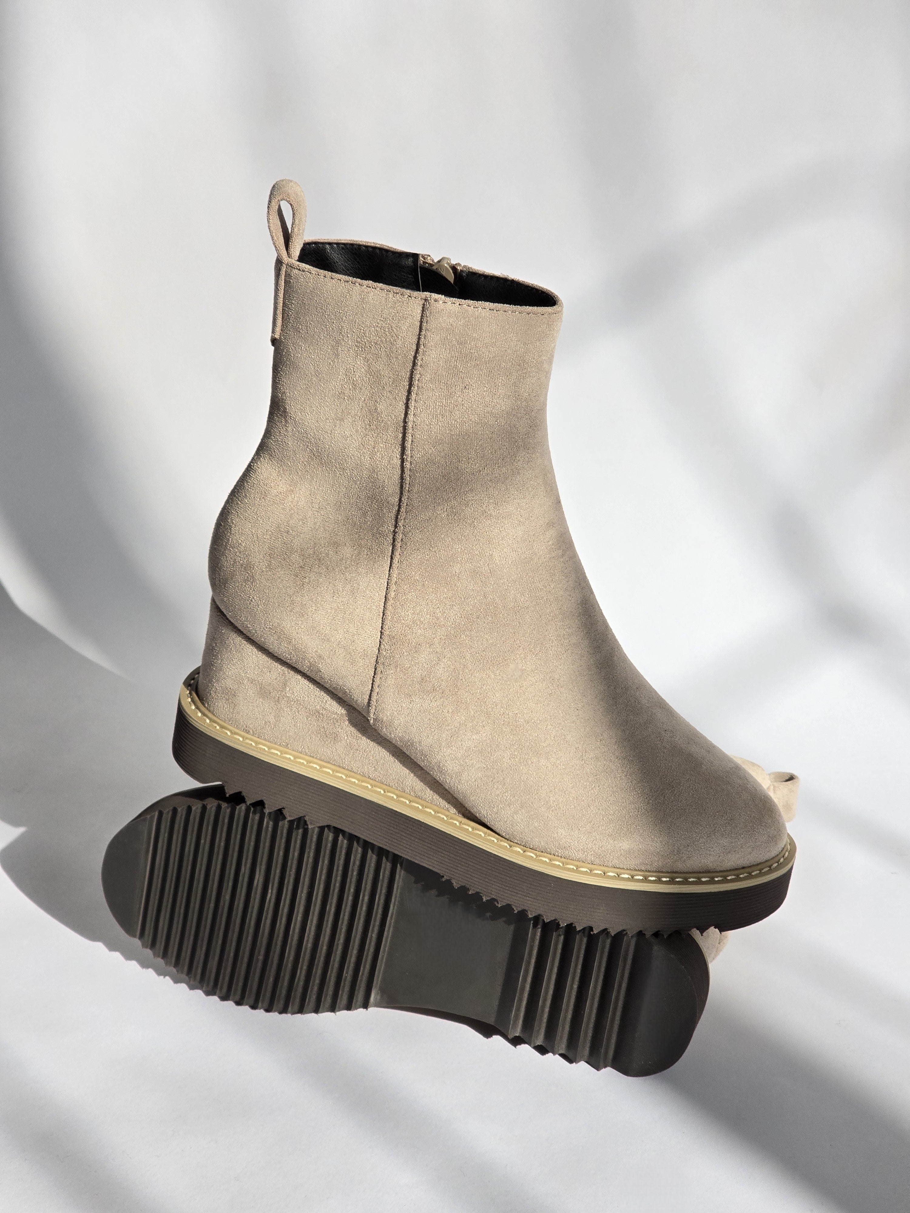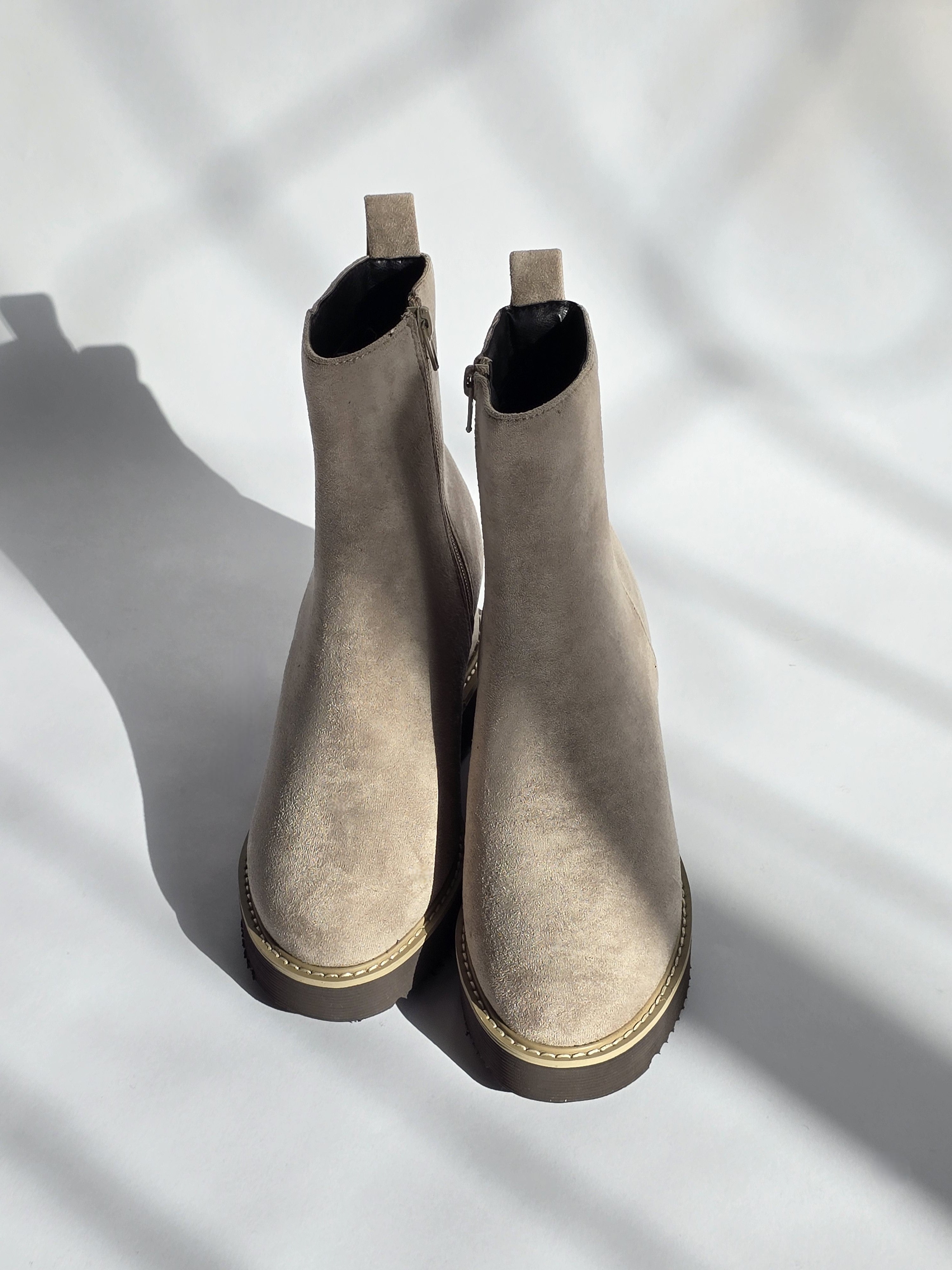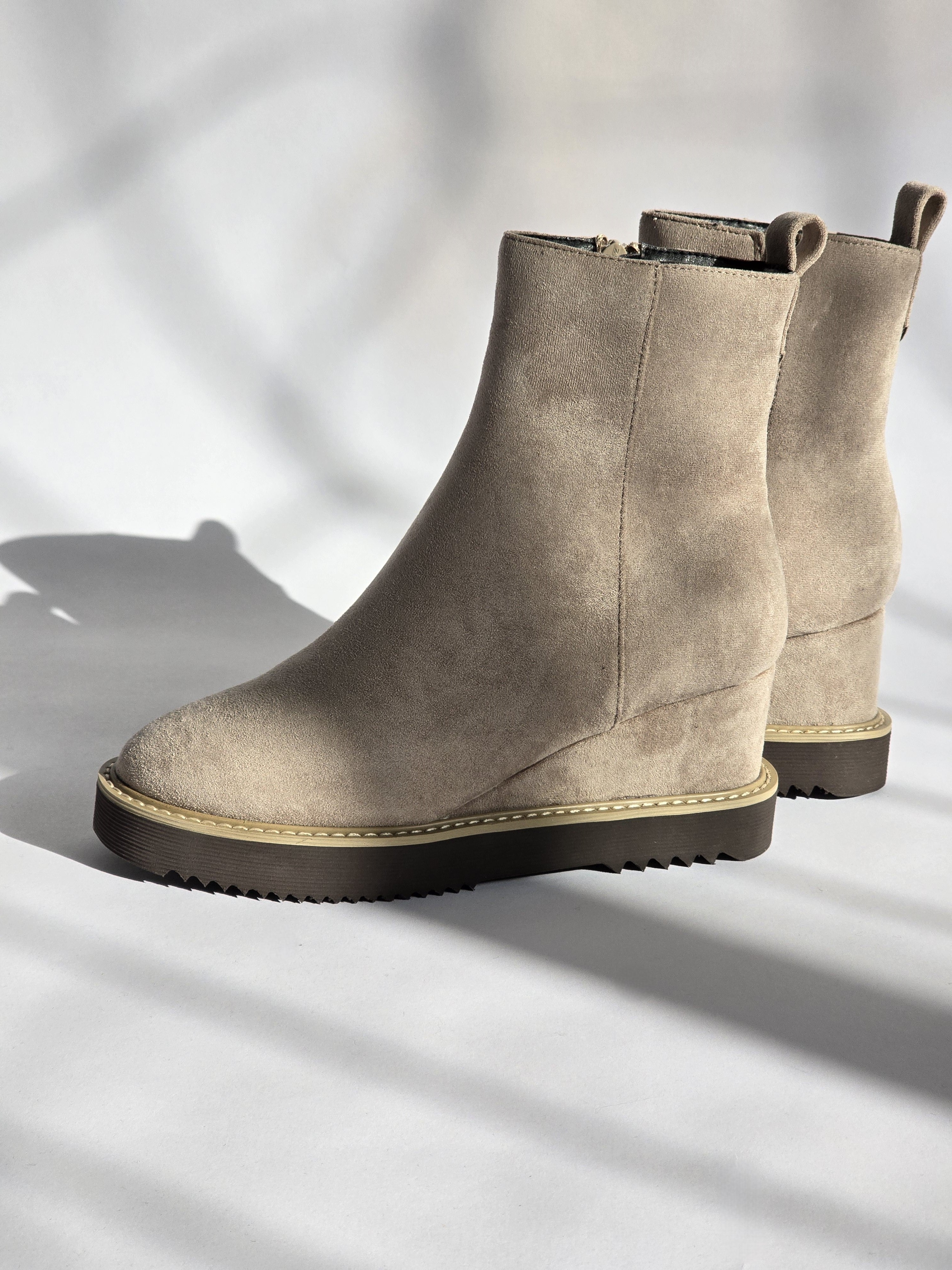 מגפוני זמש בצבע בז' בגזרה נקייה ויציבה, עם סוליה עבה ותפר בהיר שמדגיש את הקו המודרני של הדגם. החרטום המעוגל והגובה הנוח יוצרים מראה יומיומי מאוזן, כזה שמרגיש נכון להליכה ארוכה ולשילוב קל עם כל הופעה.