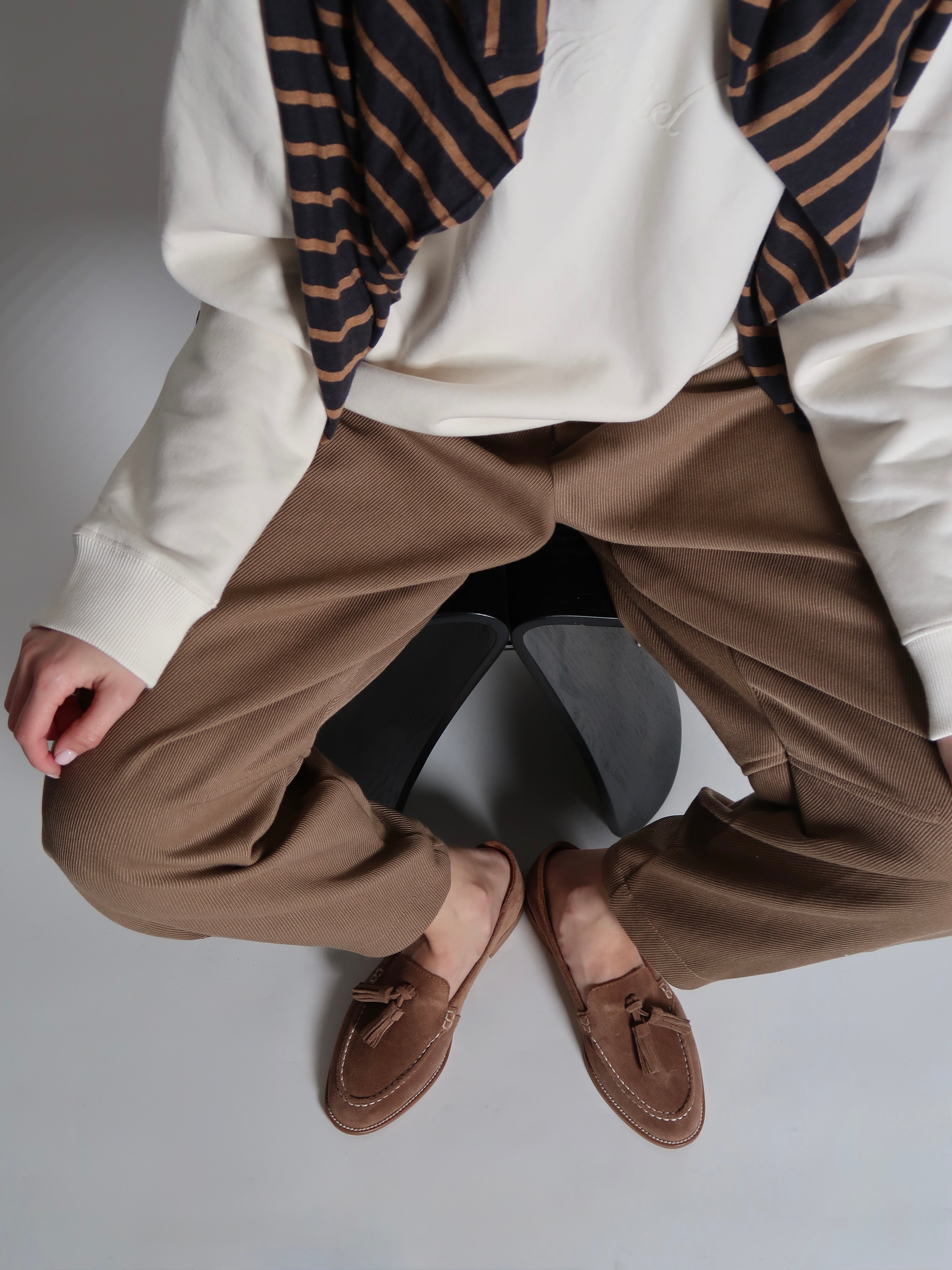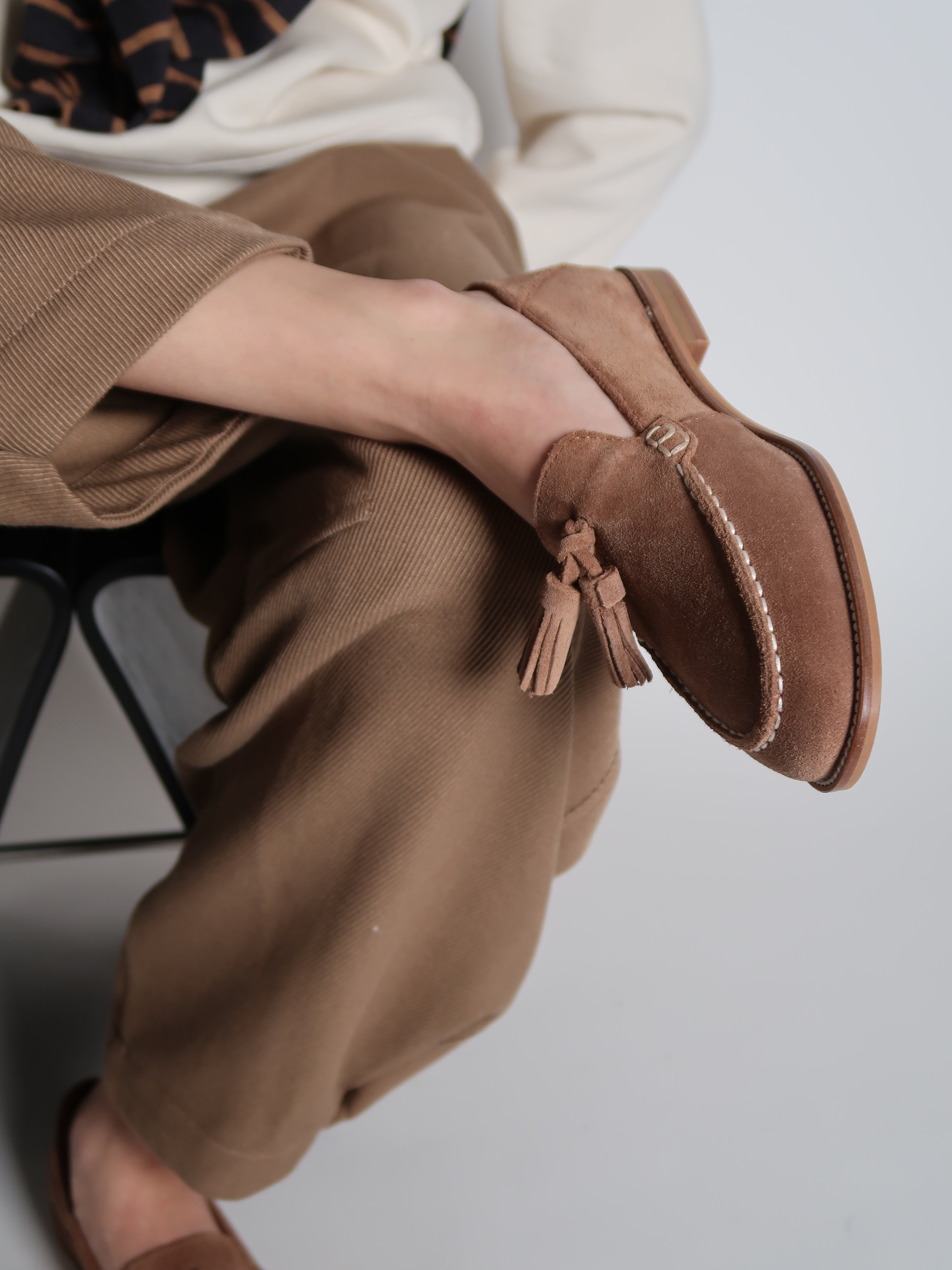 מוקסינים שטוחים מזמש רך בגוון קאמל ניודי, בעיצוב קלאסי ומינימליסטי שמשדר אלגנטיות נינוחה. בחזית - קישוט קשר עם גדילים עדינים, שמוסיף טאץ’ קלאסי ומוקפד. מתאימים בקלות ללוק משרד מתוחכם או סטייל קז’ואל עם טוויסט.