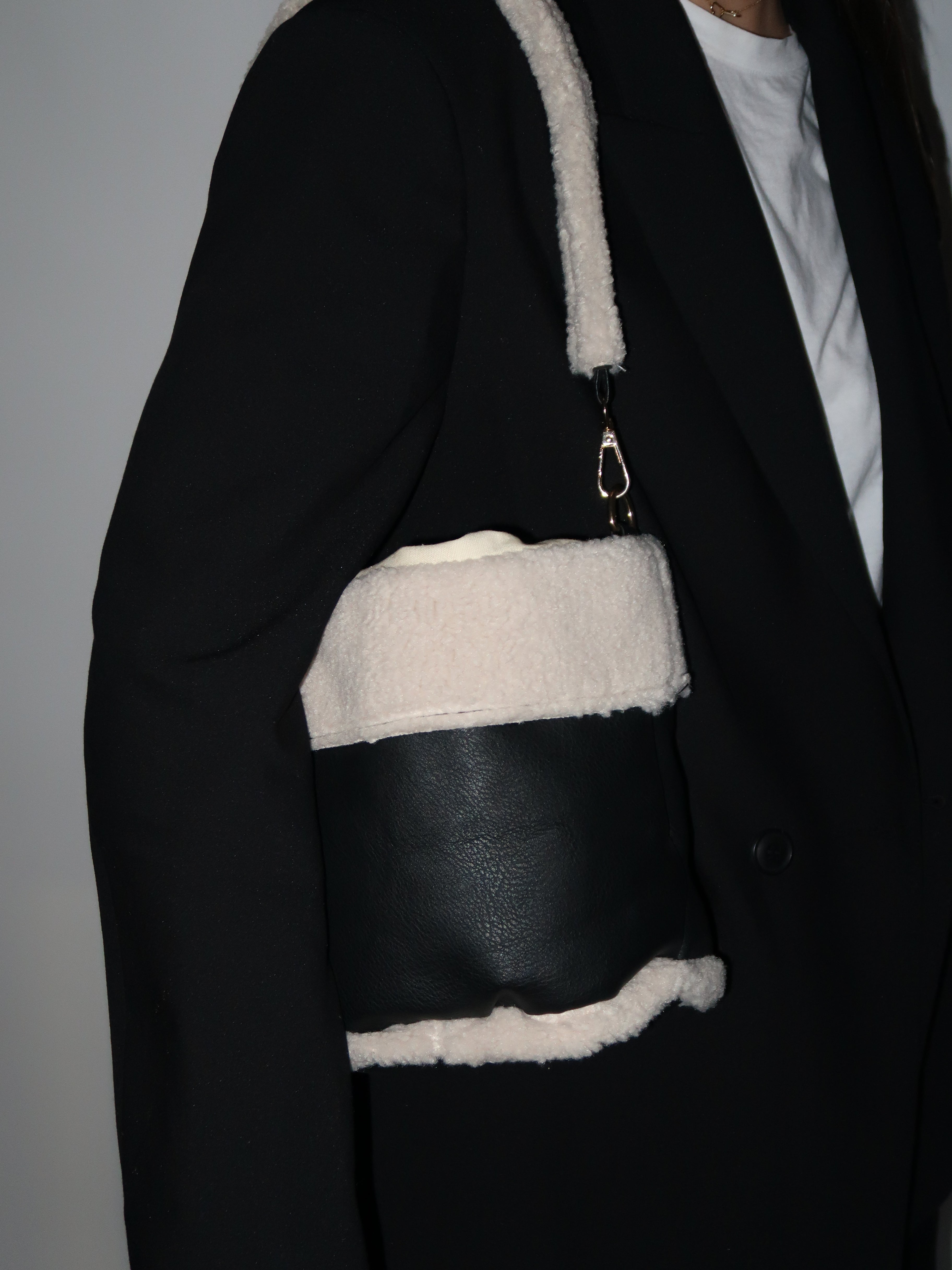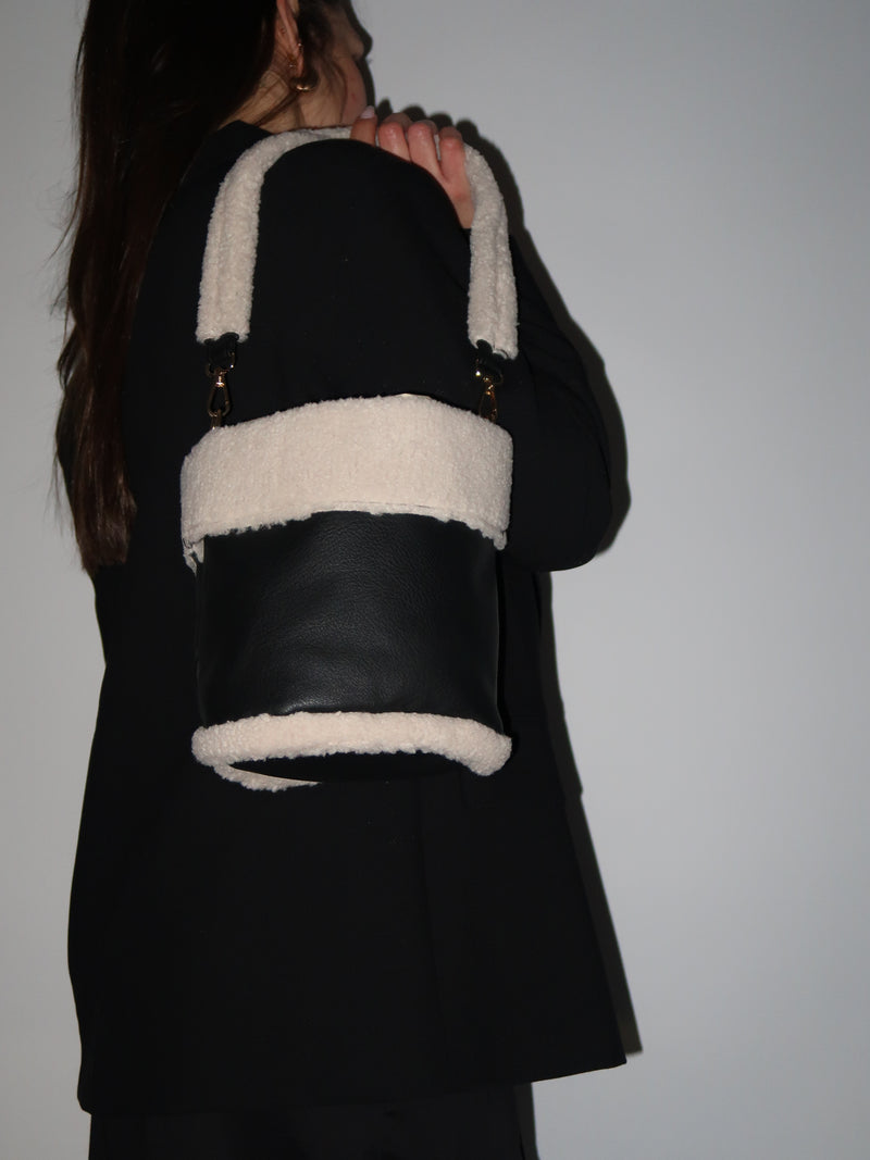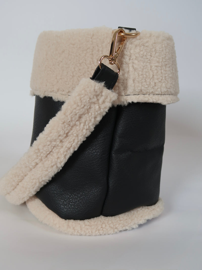 תיק באקט שחור בשילוב טקסטורת טדי פרוותית רכה שמוסיפים טאץ' חורפי ונעים. דגם פרקטי שנכנס בקלות לכל לוק של העונה, בעל 2 רצועות נשיאה באורכים שונים. תא אחד ללא חלוקה נסגר בכיווץ שרוך.