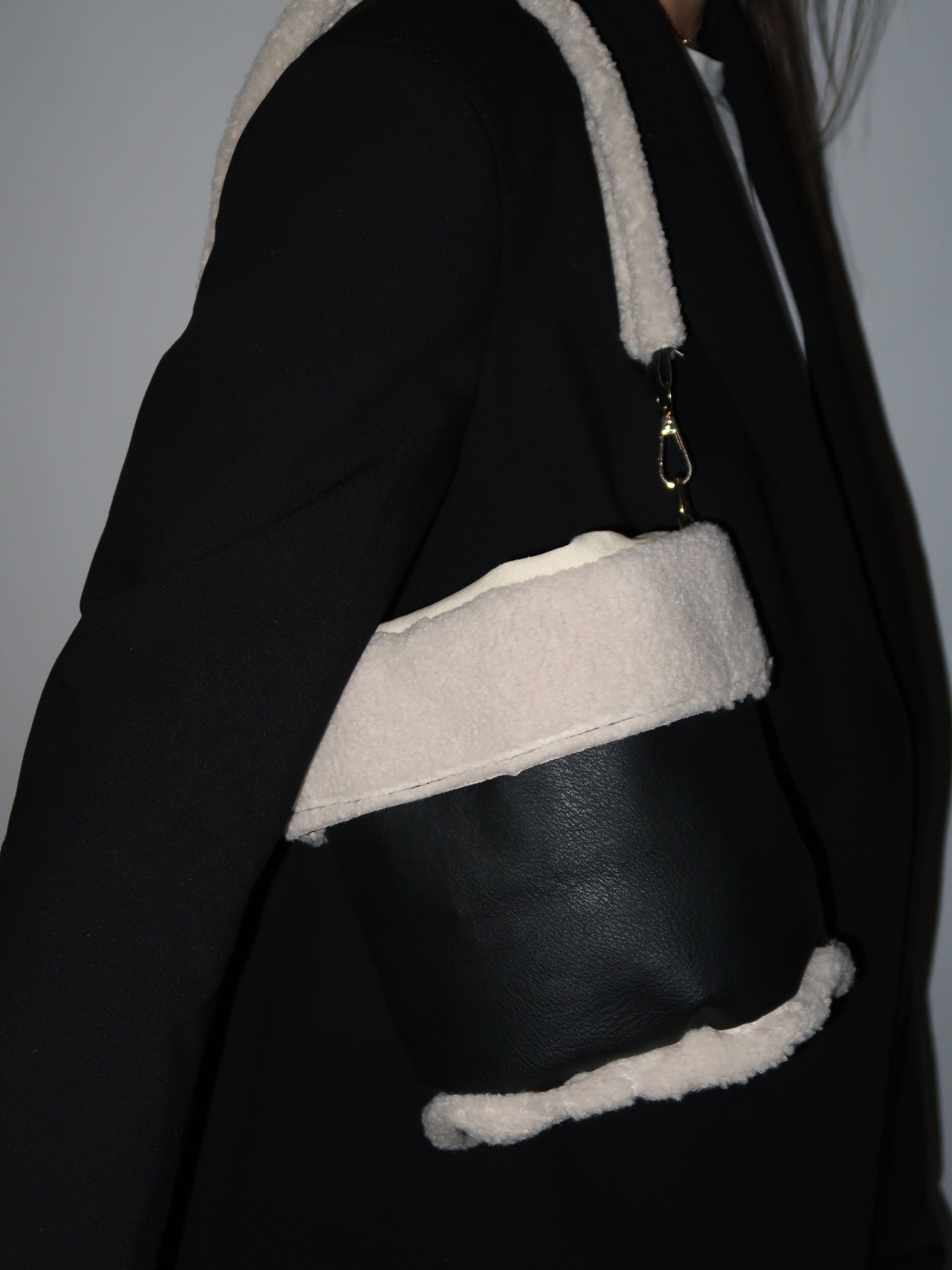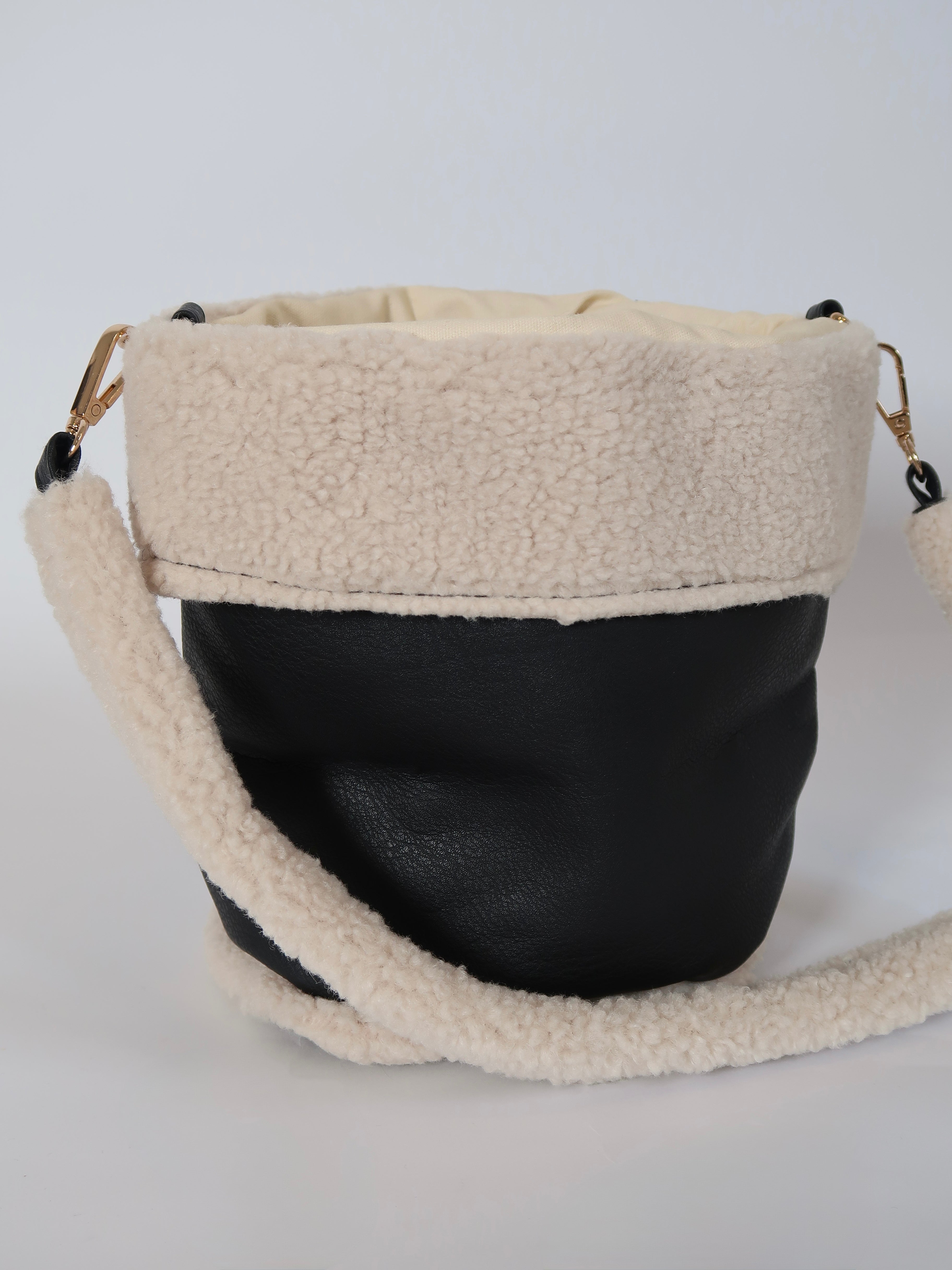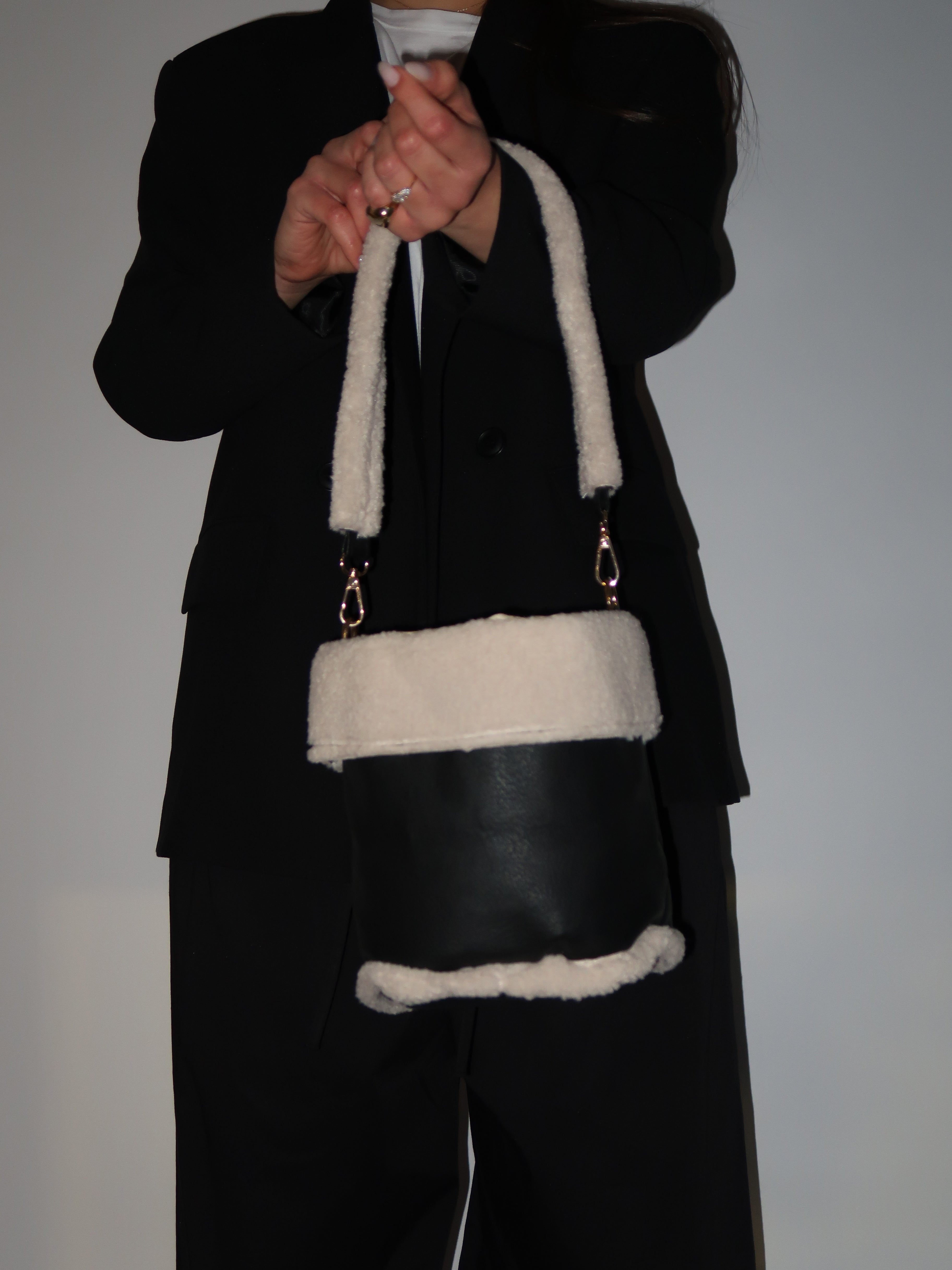 תיק באקט שחור בשילוב טקסטורת טדי פרוותית רכה שמוסיפים טאץ' חורפי ונעים. דגם פרקטי שנכנס בקלות לכל לוק של העונה, בעל 2 רצועות נשיאה באורכים שונים. תא אחד ללא חלוקה נסגר בכיווץ שרוך.