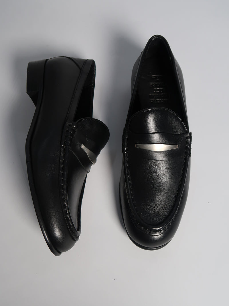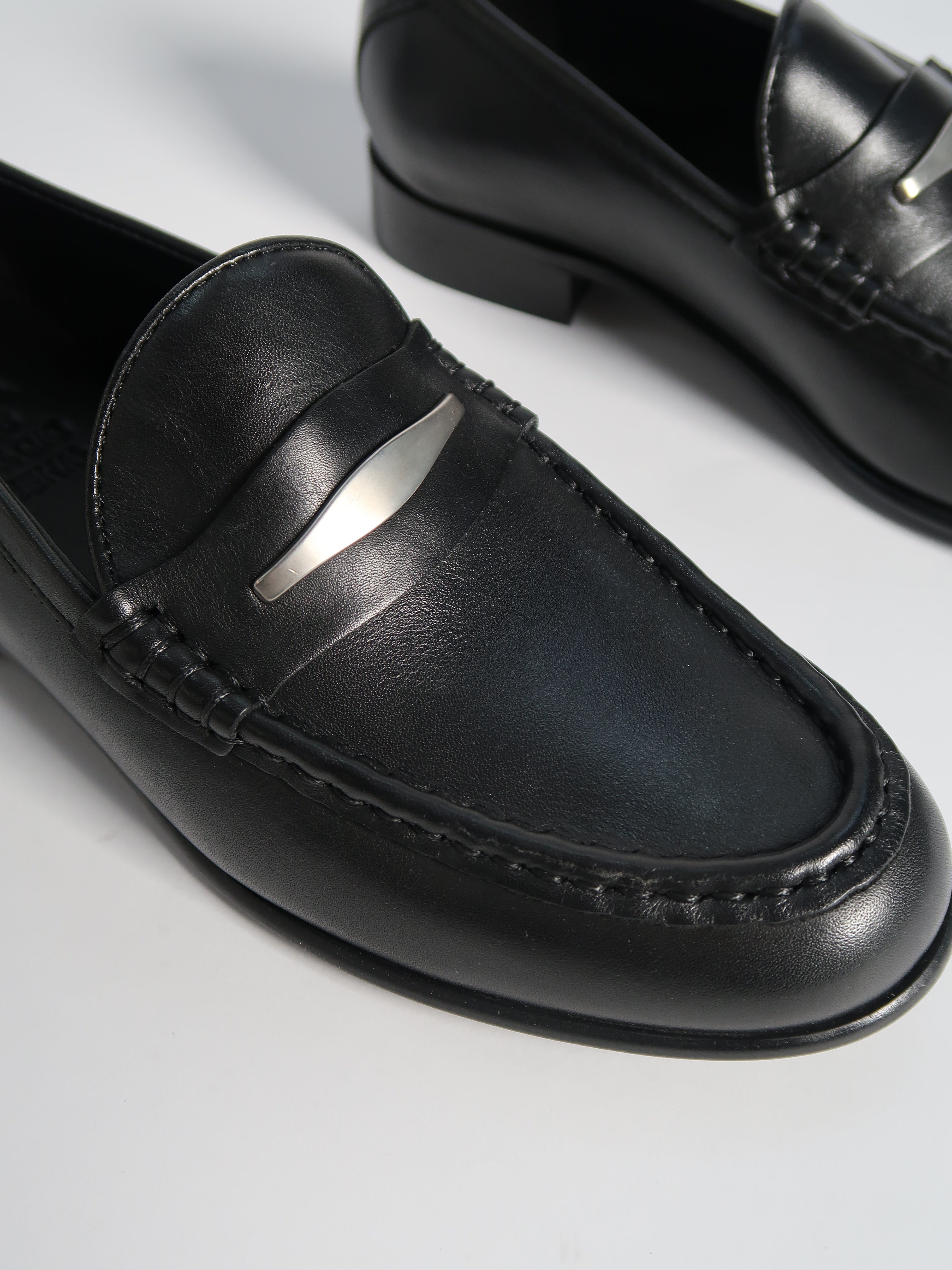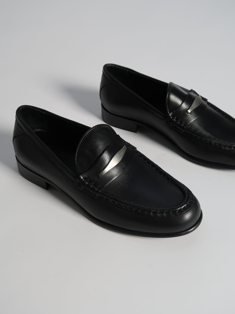 מוקסינים מעור רל בצבע שחור, עם חזית קלאסית ומראה נקי. רצועה רחבה במרכז הנעל בשילוב אלמנט כסוף ותיפורים עדינים לאורך הנעל מוסיפים טאצ’ מתוחכם וקלאסי לעיצוב. מתאימים בקלות ללוק משרדי מתוחכם או סטייל קז’ואל עם טוויסט.