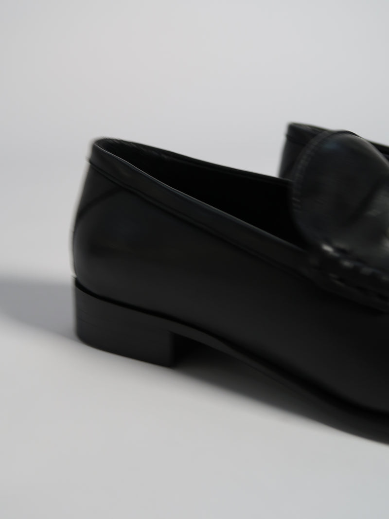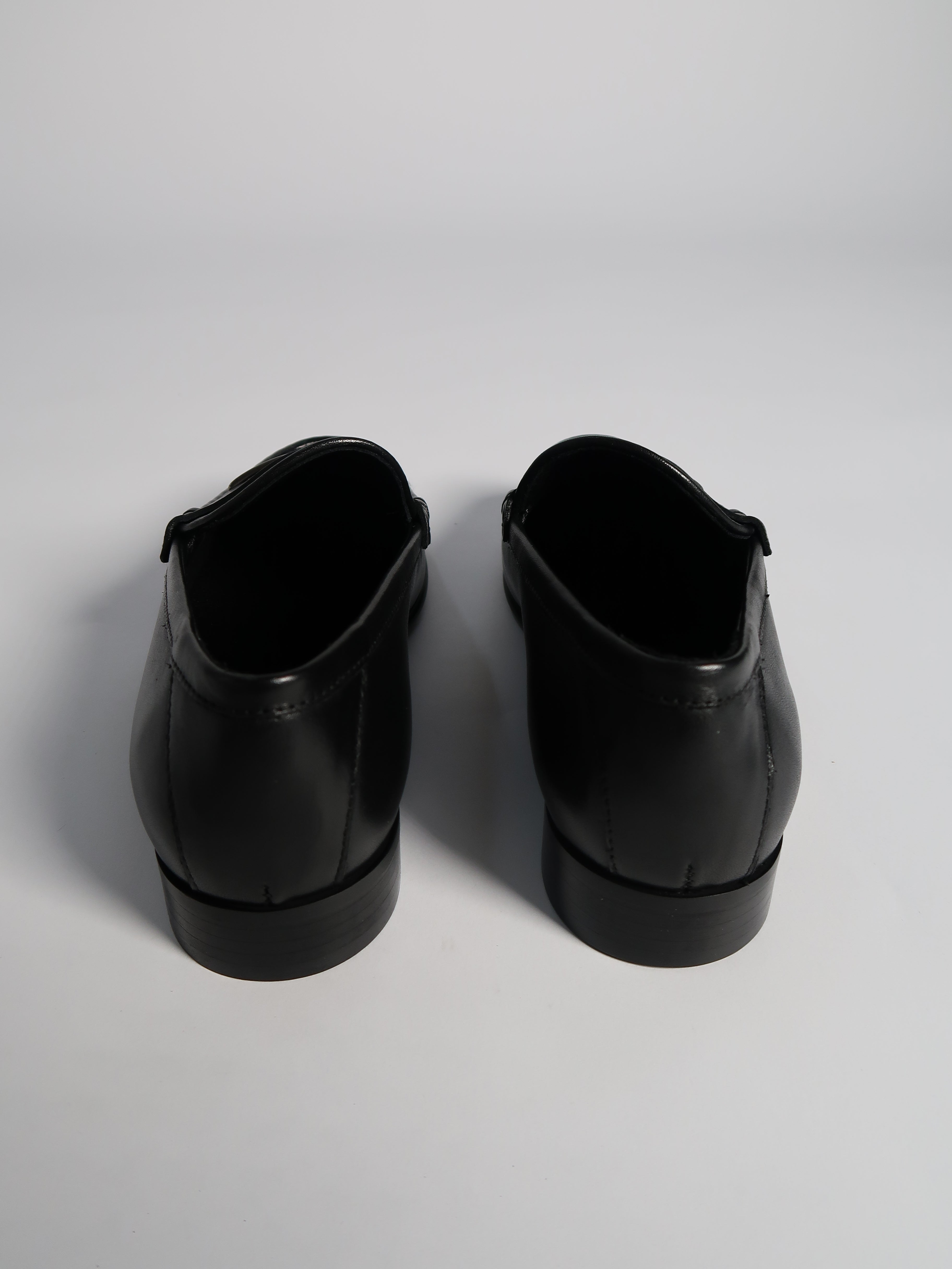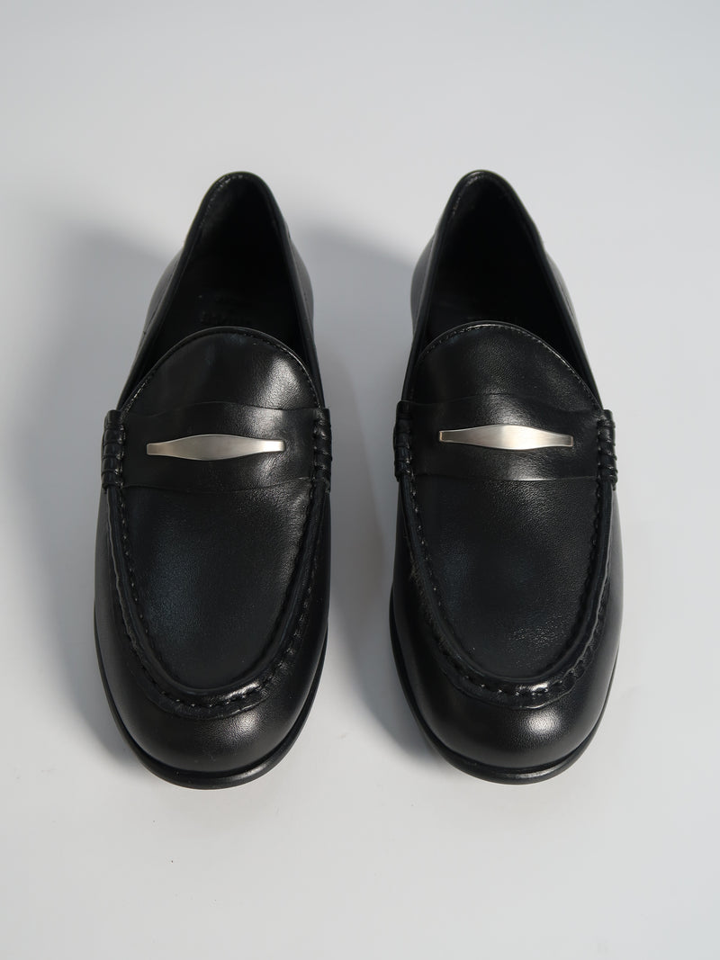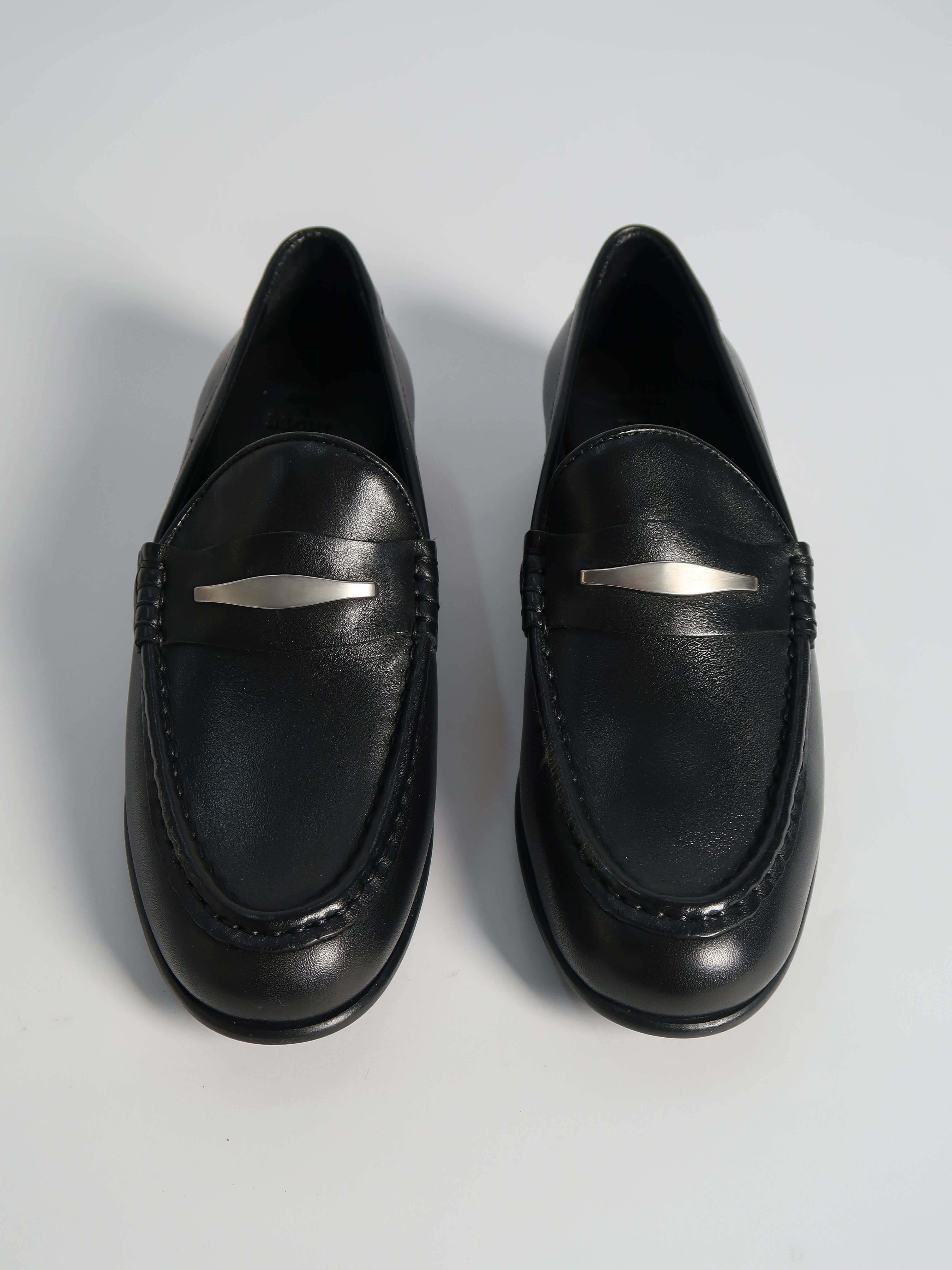 מוקסינים מעור רל בצבע שחור, עם חזית קלאסית ומראה נקי. רצועה רחבה במרכז הנעל בשילוב אלמנט כסוף ותיפורים עדינים לאורך הנעל מוסיפים טאצ’ מתוחכם וקלאסי לעיצוב. מתאימים בקלות ללוק משרדי מתוחכם או סטייל קז’ואל עם טוויסט.