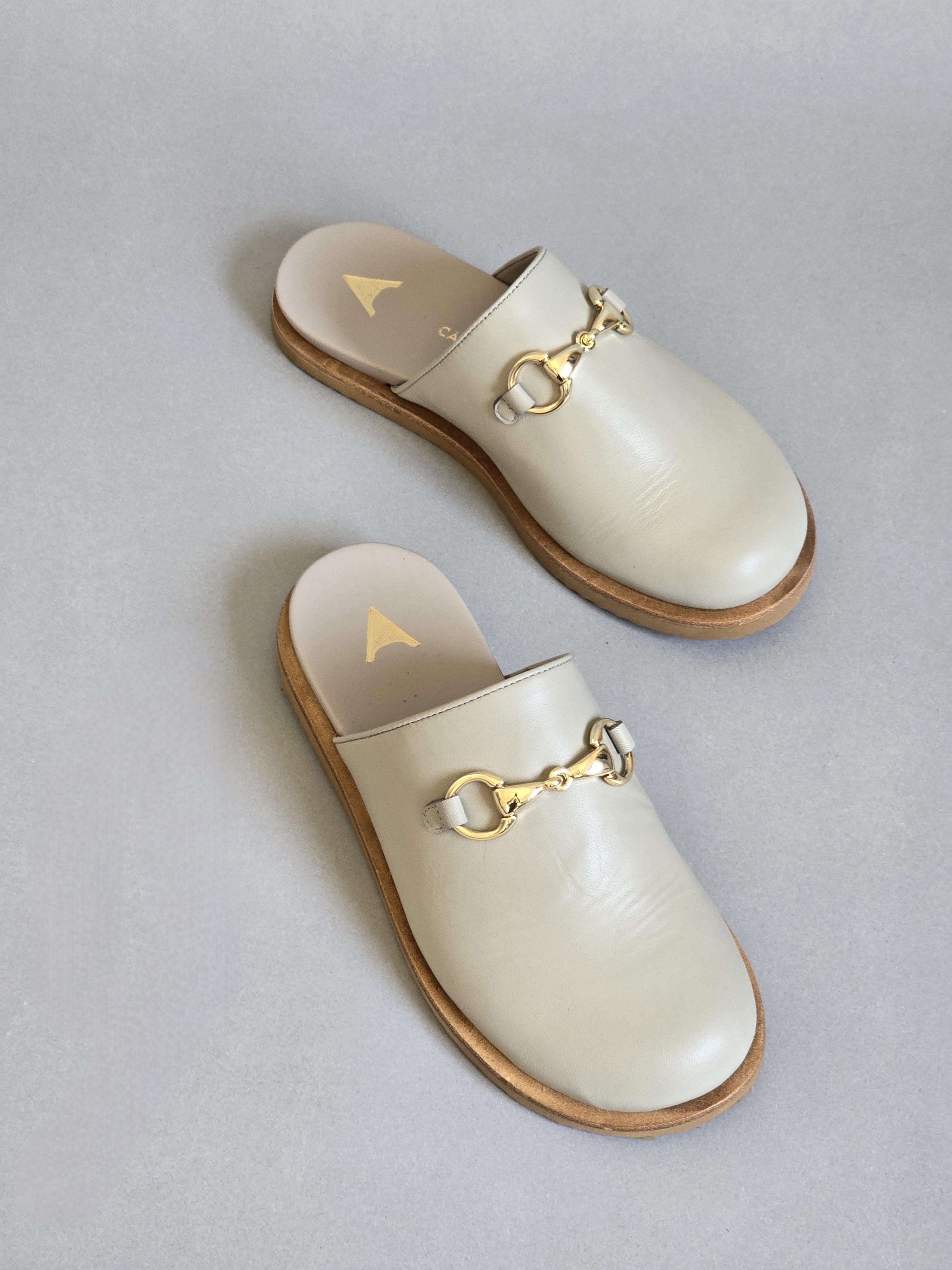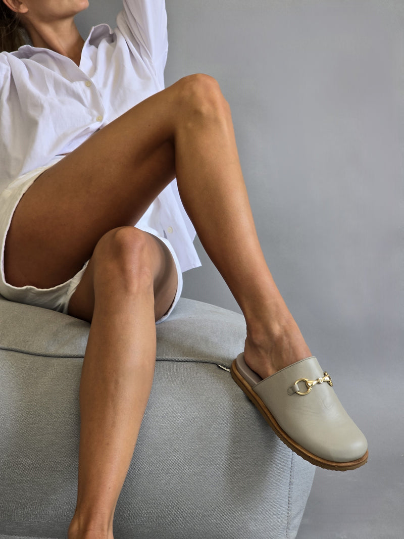 כפכפי מיולס מעור בצבע אפור, סגורים מקדימה בסיומת מעוגלת, אלמנט חוליות מתכת בצבע זהב במרכז; סוליה נוחה במיוחד ומסגרת בגוון חום