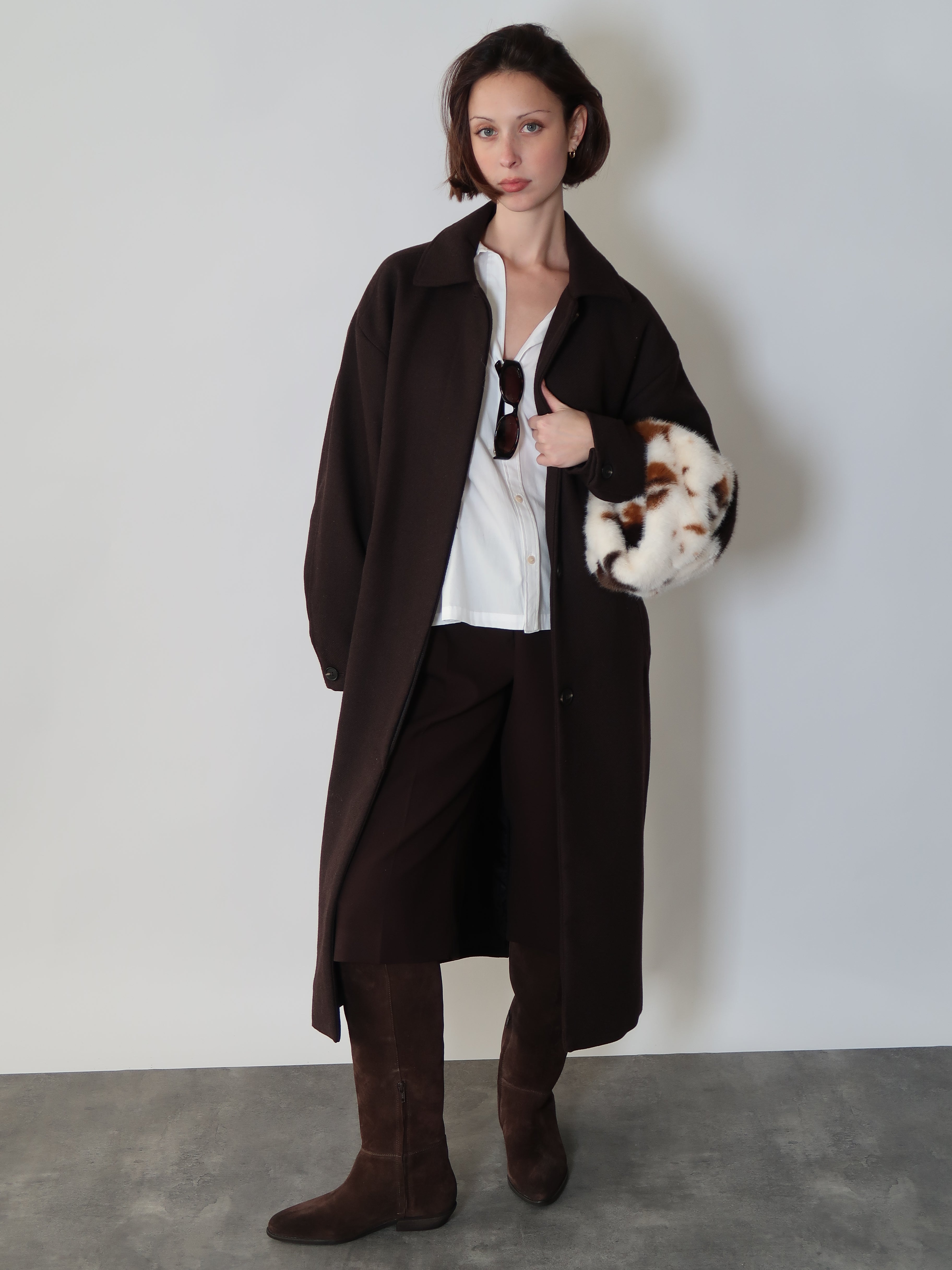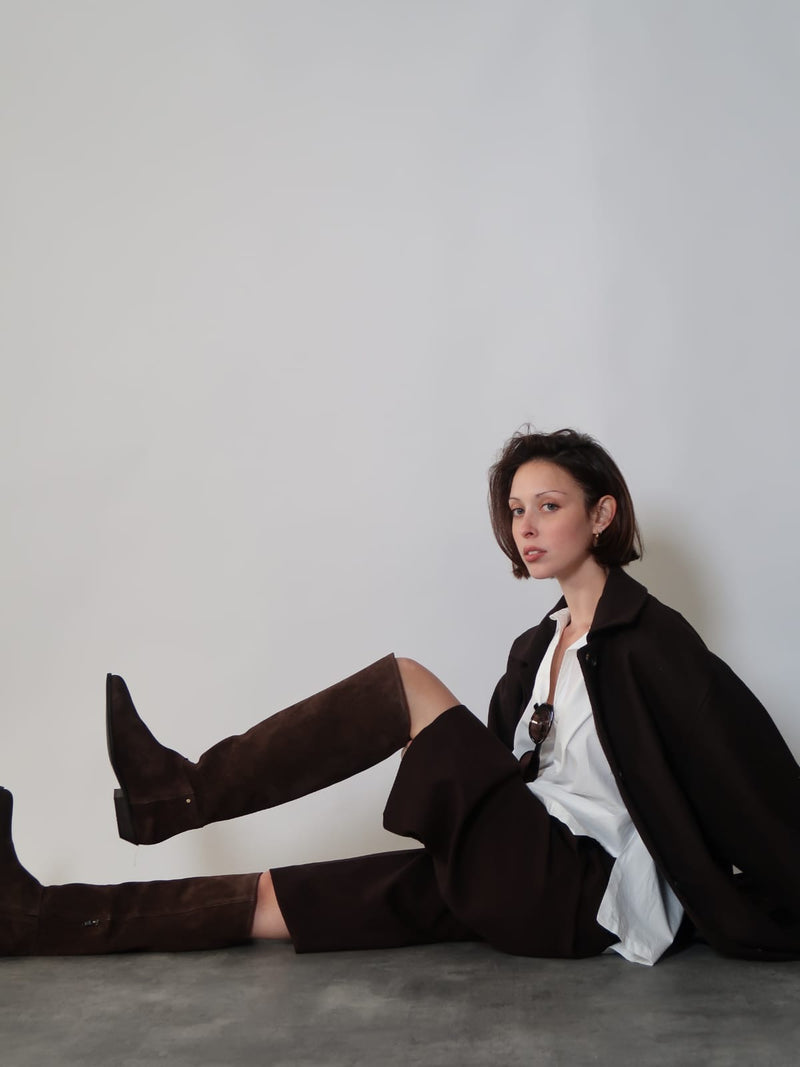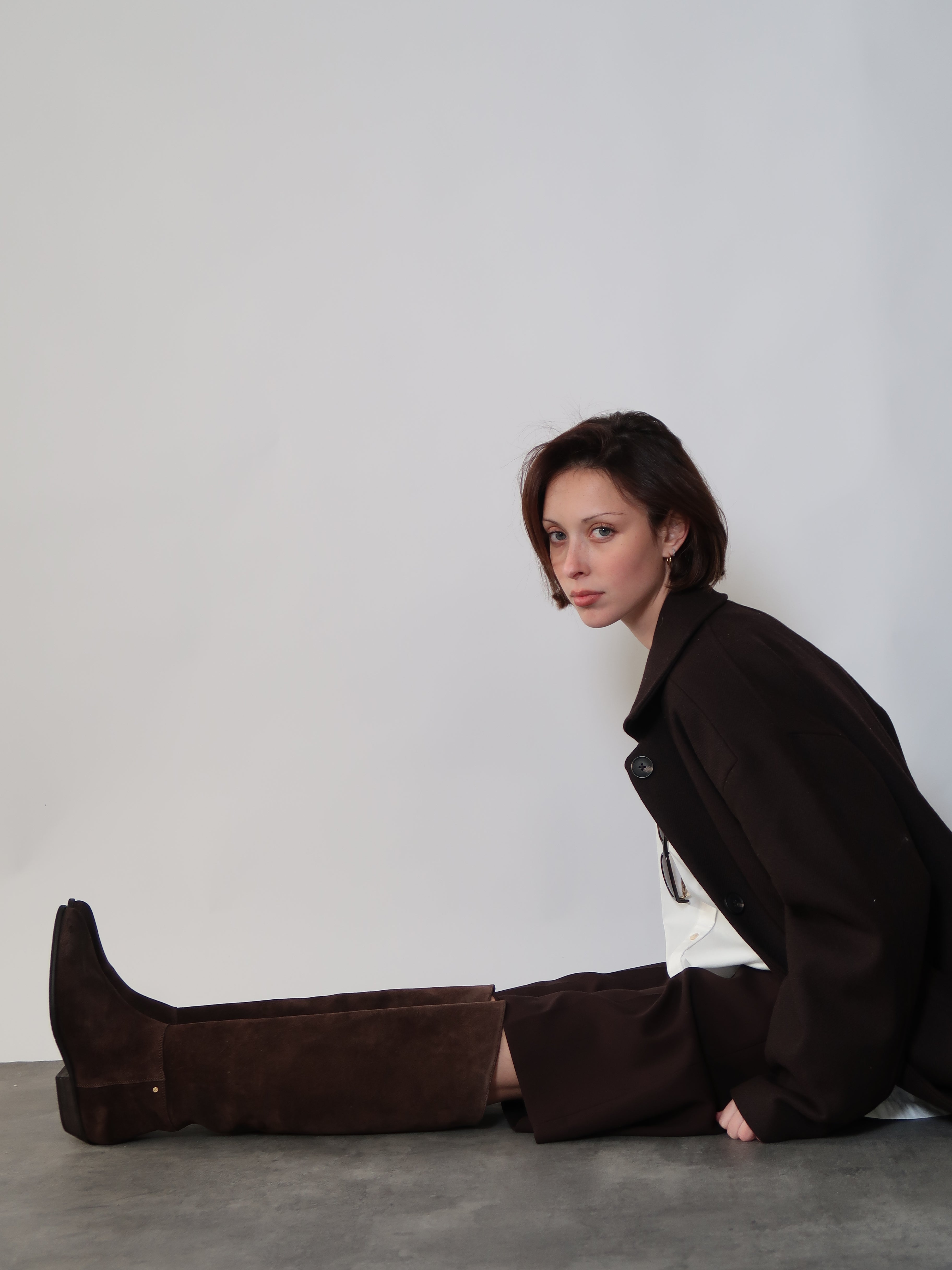 מגפי זמש גבוהים בצבע חום כהה, בסגנון נקי ומינימליסטי עם חזית מחודדת אלגנטית. הגזרה הצמודה לאורך השוק מדגישה קו נשי ואלגנטי, והסוליה השטוחה מוסיפה נוחות יומיומית. דגם קלאסי שמעניק נגיעה עדינה של סטייל מערבי ומתאים לשילובים מגוונים – מג'ינס יומיומי ועד שמלה זורמת לערב.