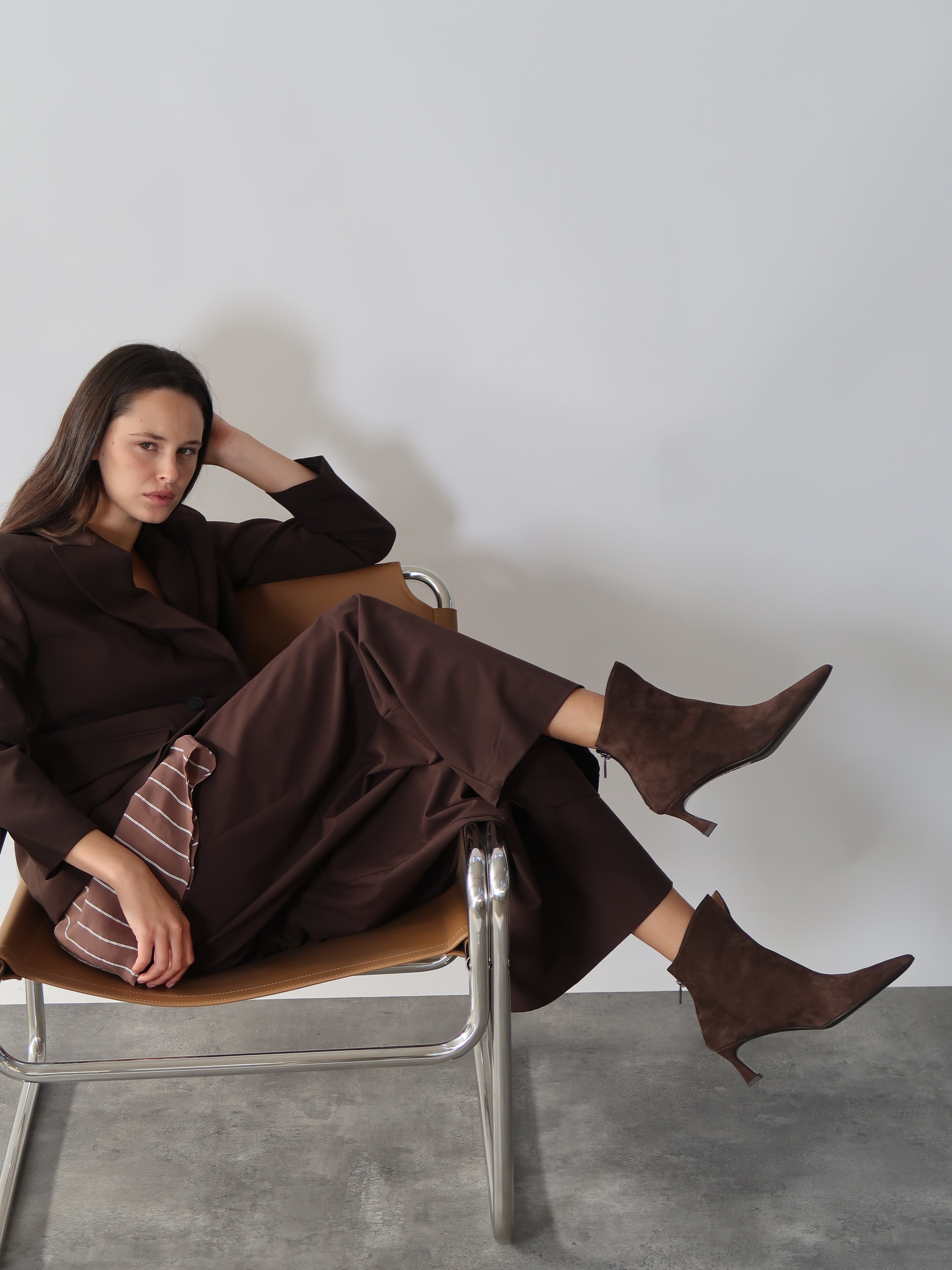 מגפונים קצרים מעל הקרסול מזמש בגוון חום כהה עם רוכסן אחורי, חיותך אלכסוני ייחודי בחלק העליון עם מפתח V מחמיא, עקב יציב בצבע תואם המעניק מראה אלגנטי ונשי וחזית מחודדת שמחמיאה לכל לוק. דגם ייחודי בעל נוכחות לערב או להוספת שיק לאאוטפיט יומיומי.