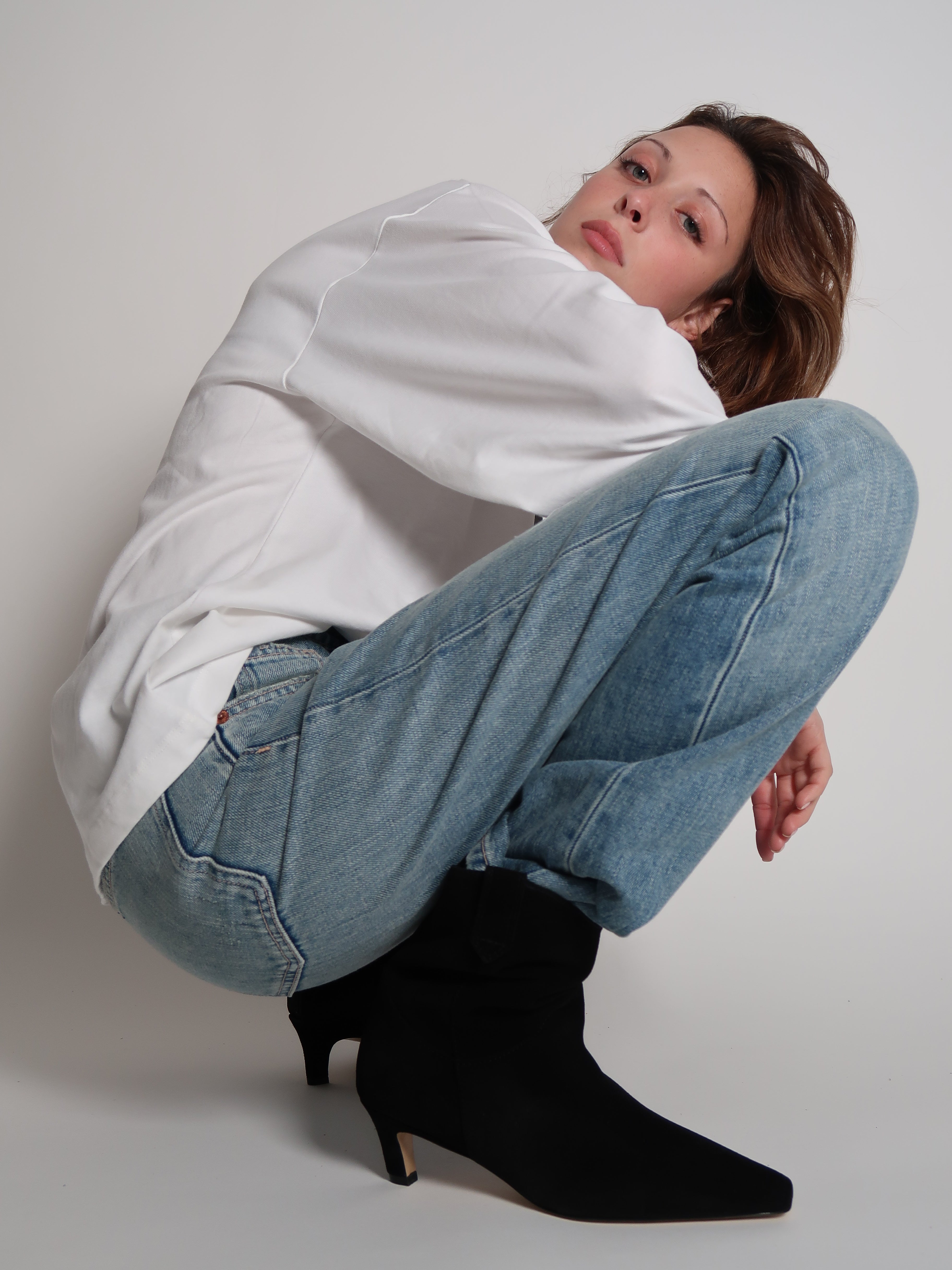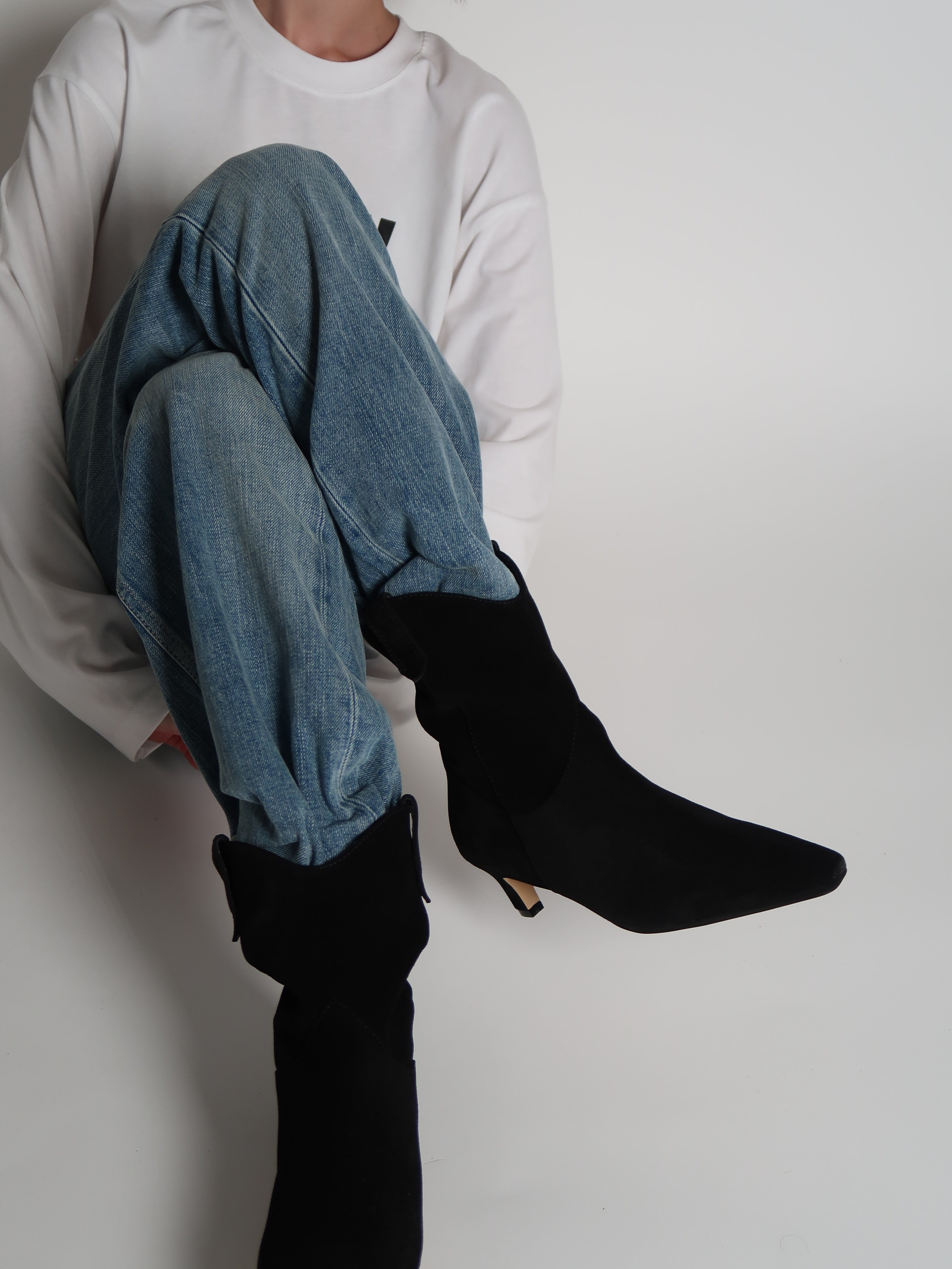 מגפונים מזמש שחור בעיצוב נקי ומעודן, עם חזית מחודדת ועקב קלאסי ונוח שמעניק מראה נשי וקליל. גזרת הבוקרים והגימור הרך יוצרים שילוב מושלם בין קלאסיות לסטייל עכשווי - לזוג שמרים כל לוק בלי מאמץ.
