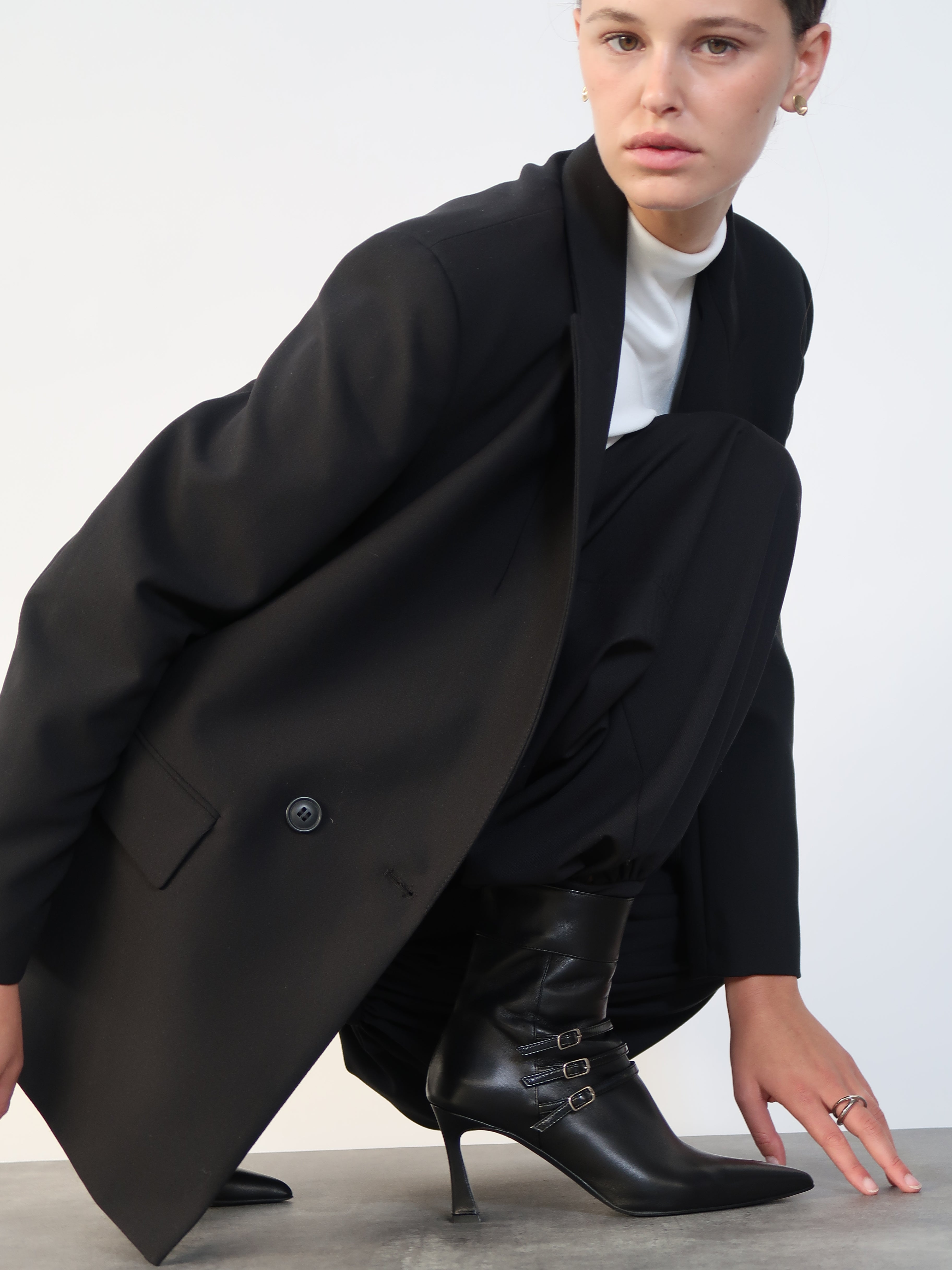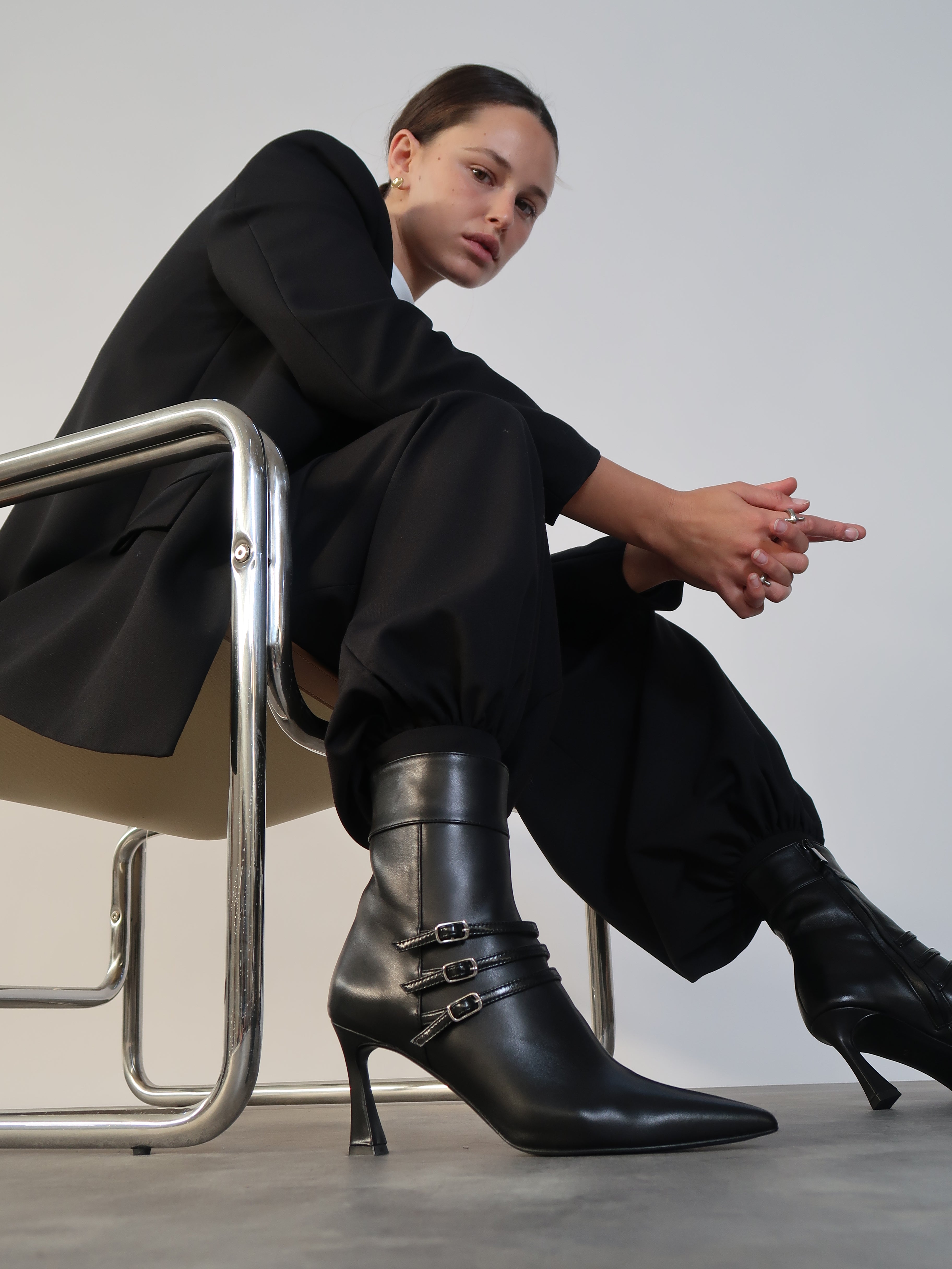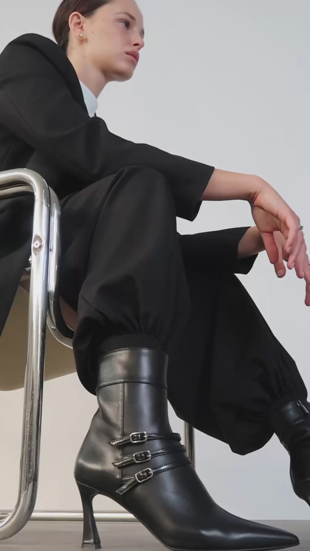 מגפונים קצרים מעור בגוון שחור עם חזית מחודדת מקדימה, שלוש רצועות במרכז עם אבזמים כסופים עדינים בצד. רוכסן בצד הפנימי לנעילה קלה, ועקב יציב בצבע תואם; קווים נקיים, מראה נשי ומעודן. דגם שמוסיף נוכחות מחויטת וקלילה.