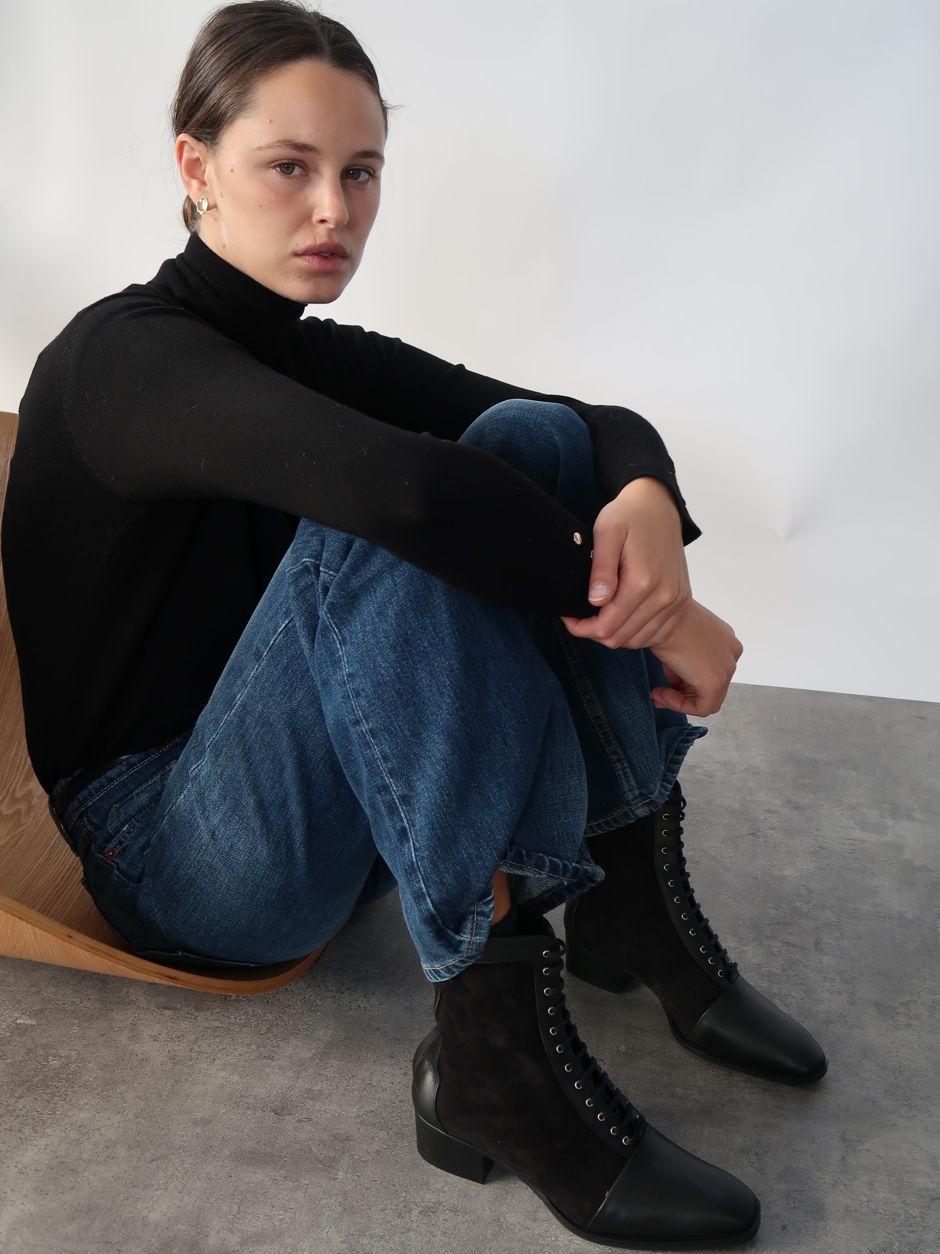 מגפונים בצבע שחור בשילוב עור וזמש, שרוכים קדמיים לכל האורך ורוכסן אחורי לנוחות מקסימלית. חזית מלבנית עדינה ועקב יציב המעניקים מראה אלגנטי. הזוג שאת צריכה בארון לכל לוק שתבחרי!