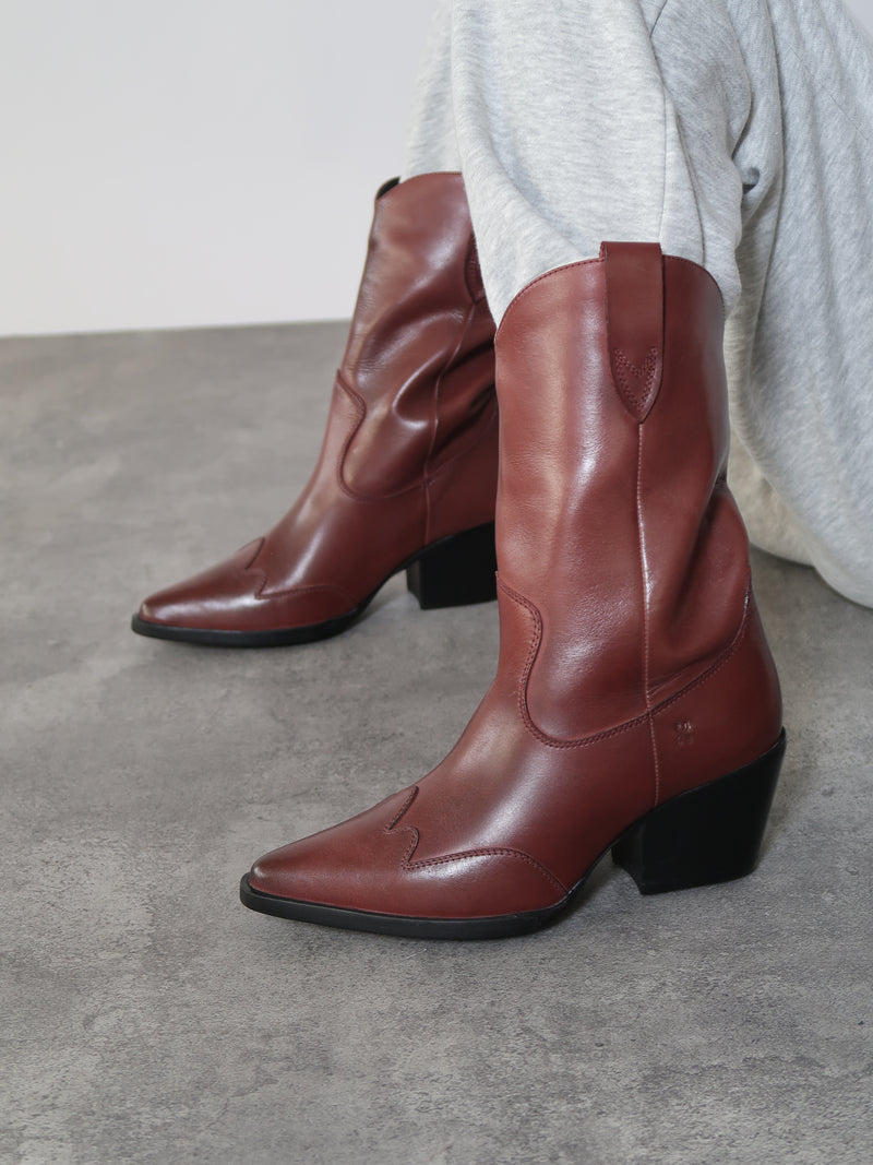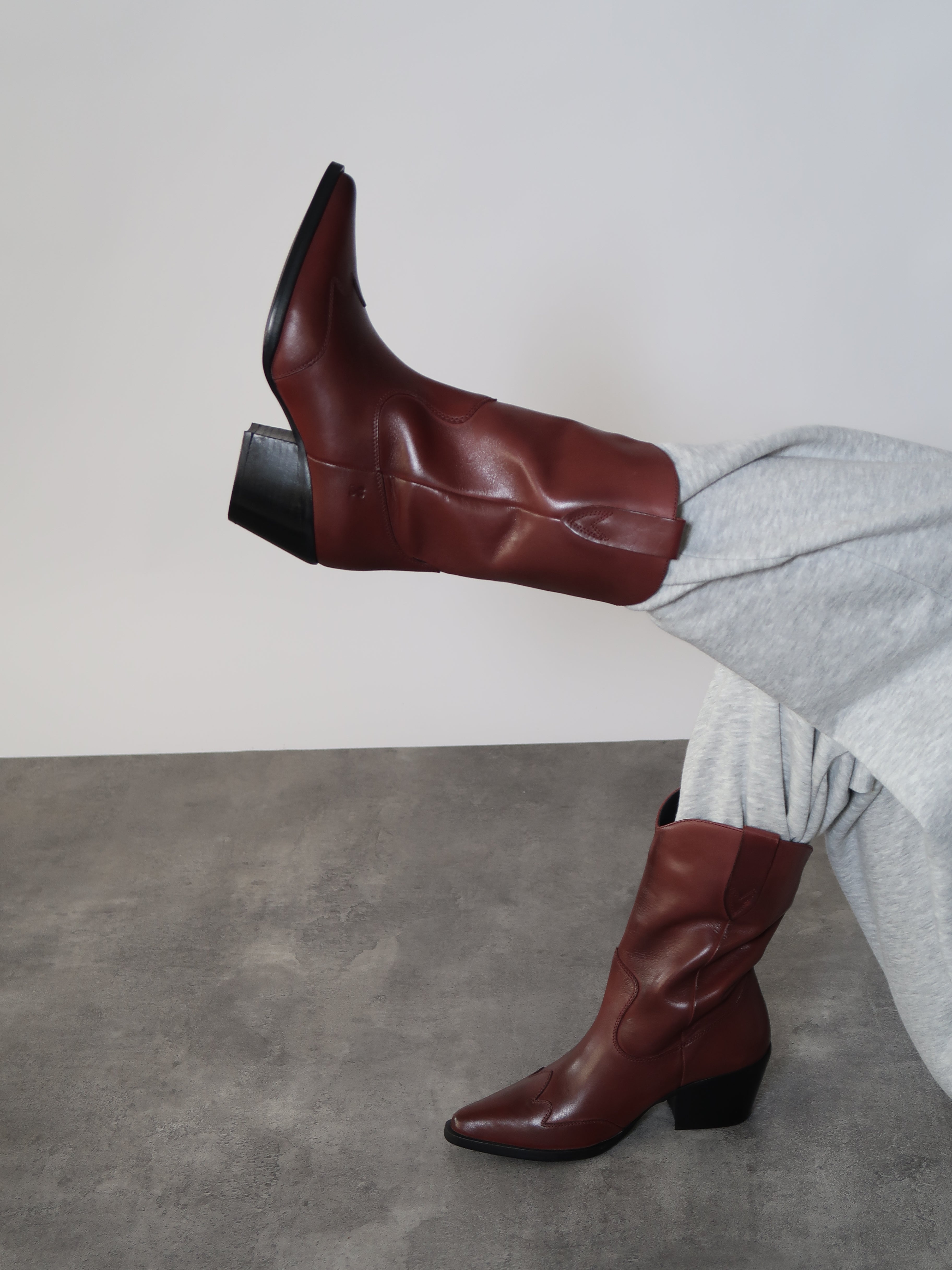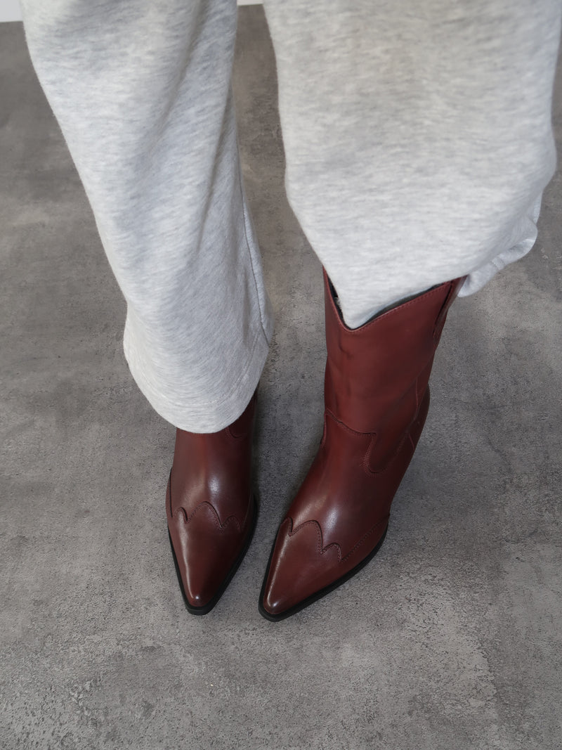 מגפי עור בגוון בורדו בסגנון בוקרים עדין – עם שפיץ חד ותפרים דקורטיביים שמעוצבים בדיוק במקום הנכון, כדי להוסיף אופי ונוכחות. הגזרה הצרה מחמיאה לרגל, והעקב הבינוני מעניק איזון מושלם בין נוחות לסטייל. אלה המגפיים שילוו אותך מהבוקר עד הערב – עם ג’ינס, שמלה או חצאית – ויעניקו לכל הופעה טאץ’ מערבי אלגנטי שלא מתאמץ.