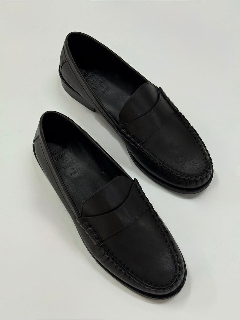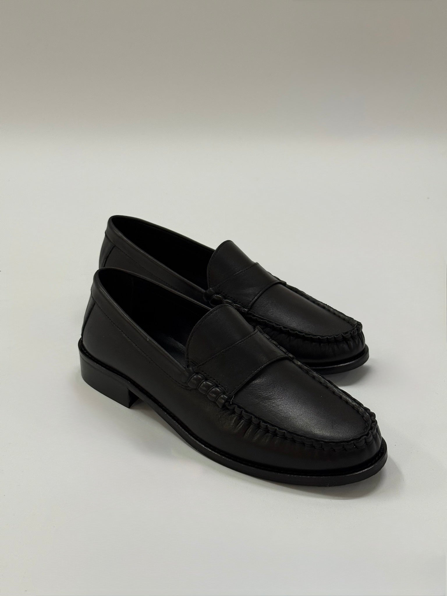 מוקסינים מעור רך בצבע שחור, עם חזית קלאסית ומראה נקי. רצועה רחבה במרכז הנעל ותיפורים עדינים לאורך הנעל מוסיפים טאצ’ מתוחכם וקלאסי לעיצוב. מתאימים בקלות ללוק משרדי מתוחכם או סטייל קז’ואל עם טוויסט.