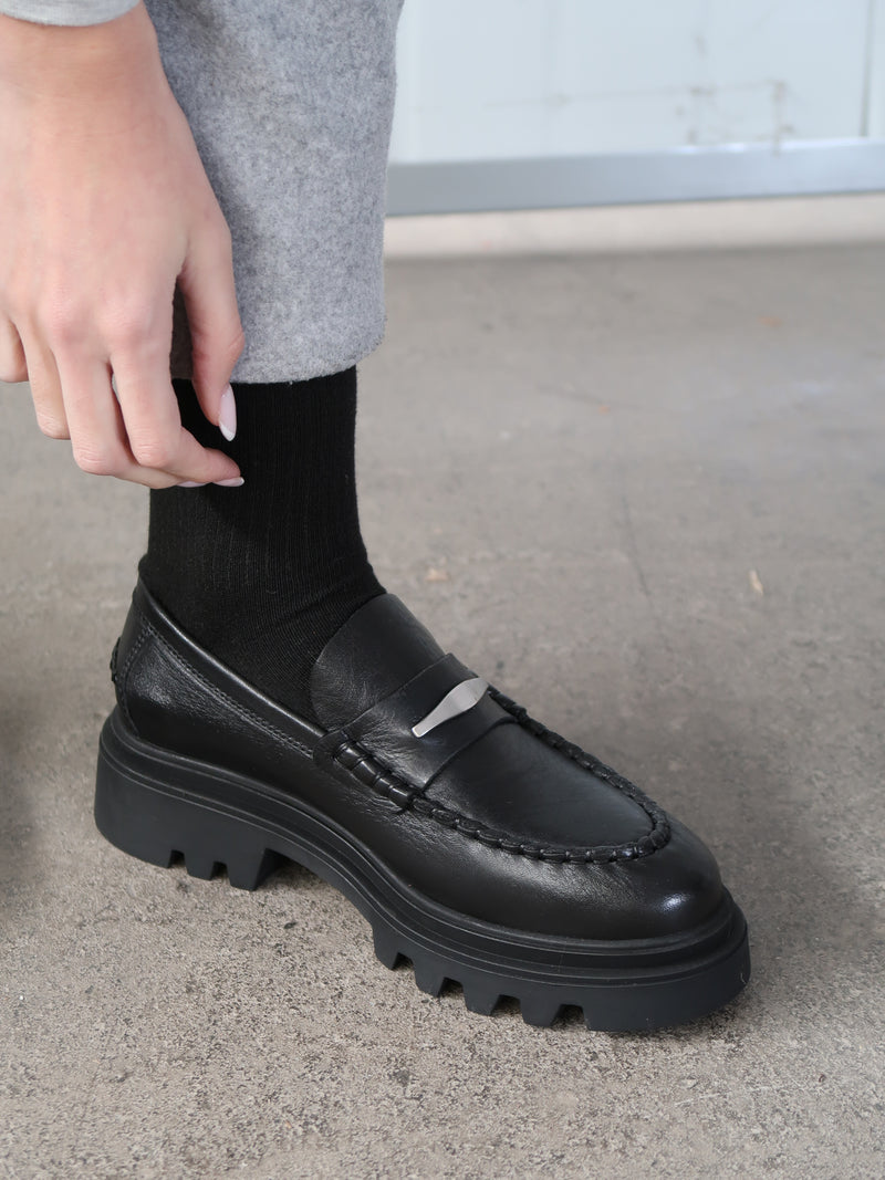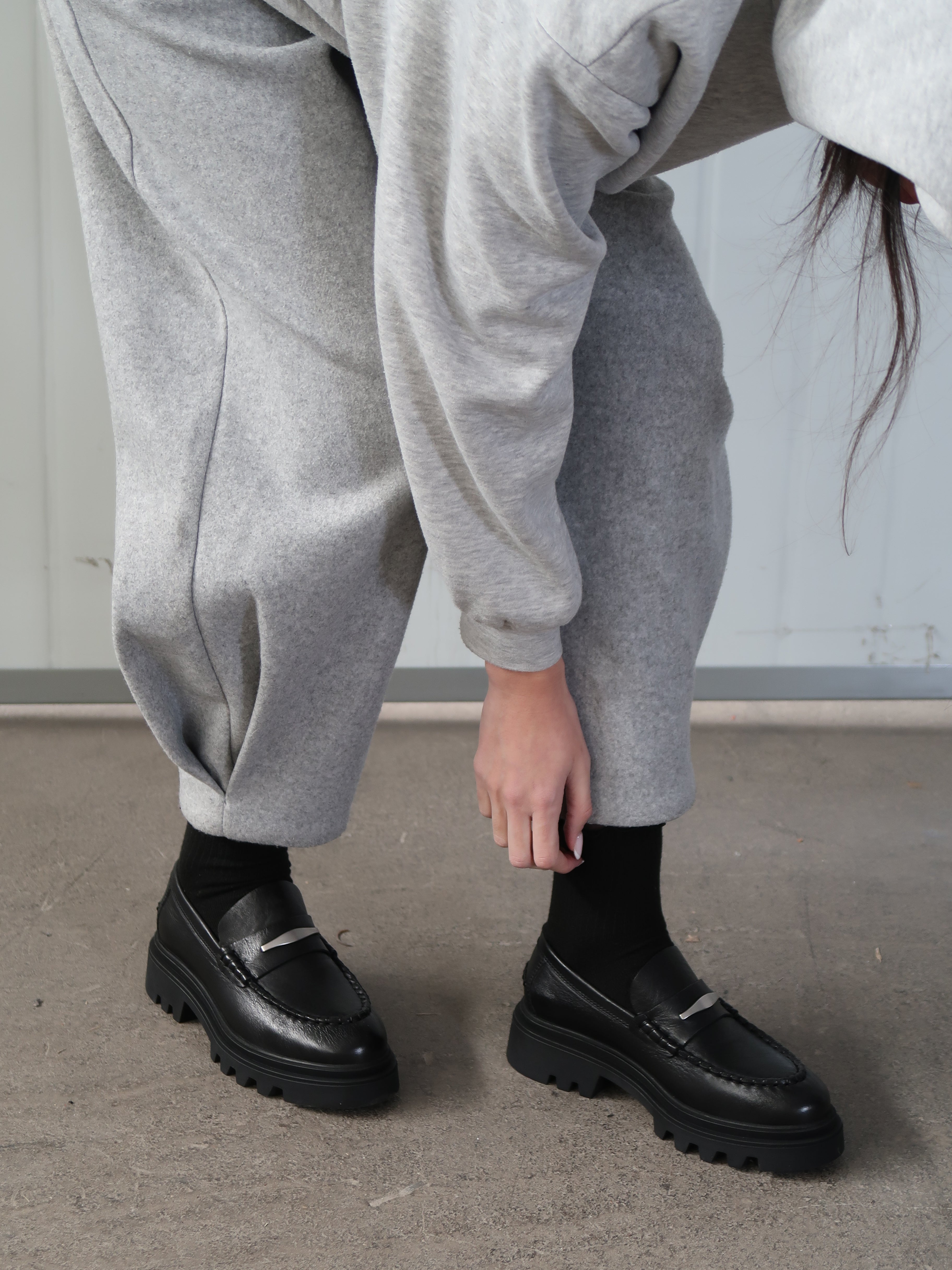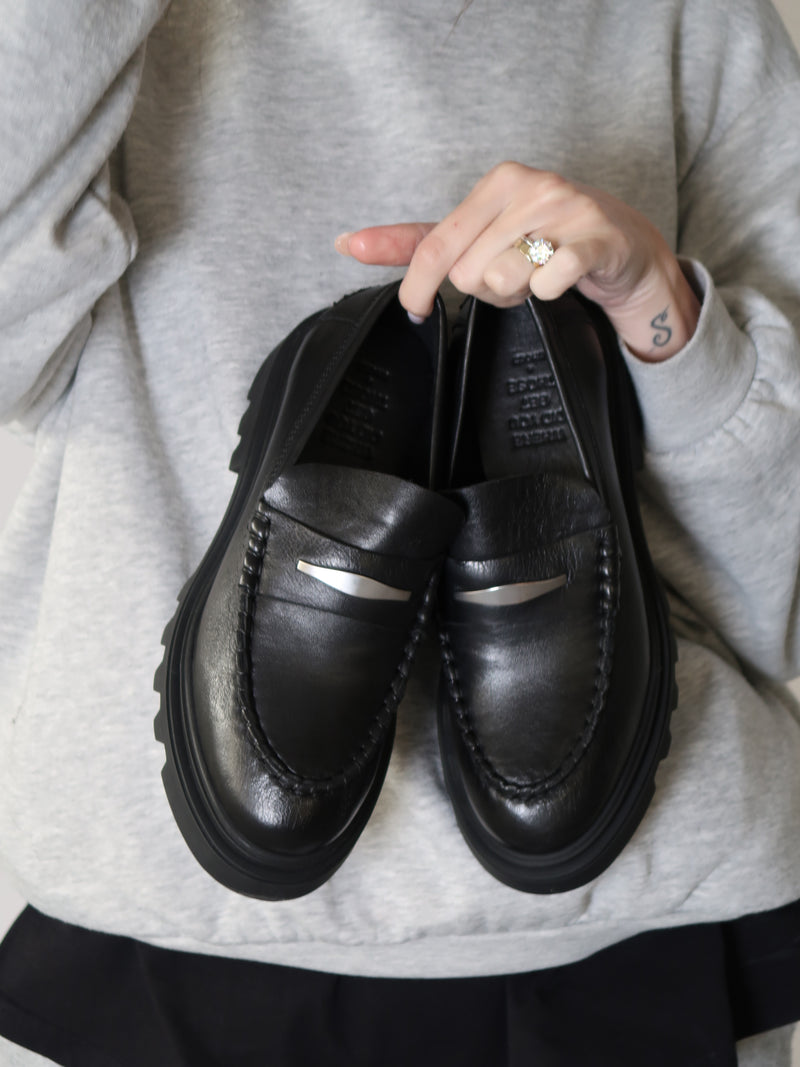 נעלי אוקספורד פלטפורמה מעור שחור ורך, צללית קלאסית עם תיפור ורצועה רוחבית, משודרגת עם דיטייל מתכת כסוף; טוויסט של סוליית פלטפורמה בצבע תואם, מוגבהת ונוחה. מושלם לכל אאוטפיט!