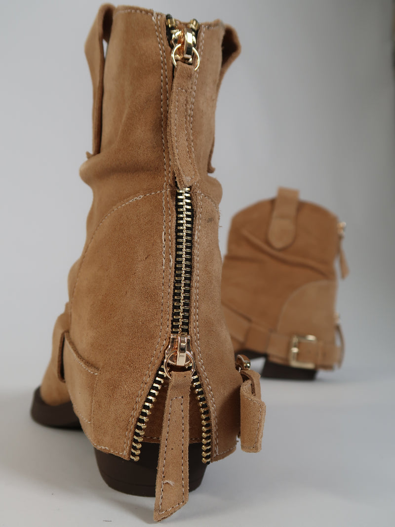 מגפוני בוקרים מזמש בגוון קאמל, עם רצועה ואבזם צדדי שמוסיפים להם נגיעה מחוספסת ועדינה בו־זמנית. סוליית גומי גמישה ונוחה והעקב הרחב מעניק תחושה יציבה וקלילה. רוכסן בצד הפנימי לנעילה מהירה וקלה. דגם שמתחבר בקלות לכל לוק — מג’ינס פשוט ועד שמלה רכה