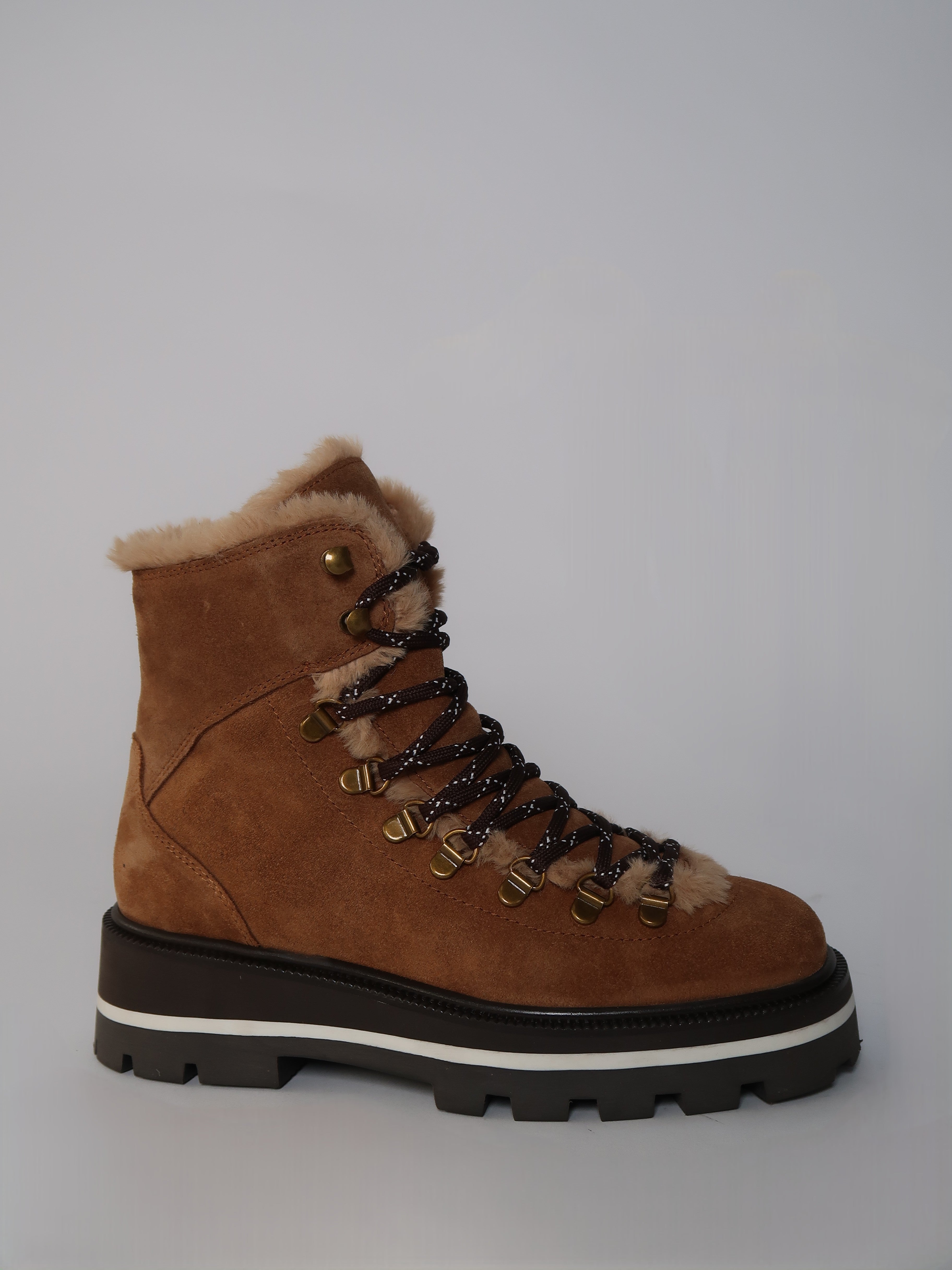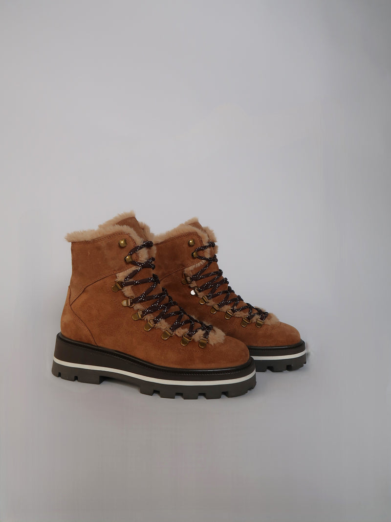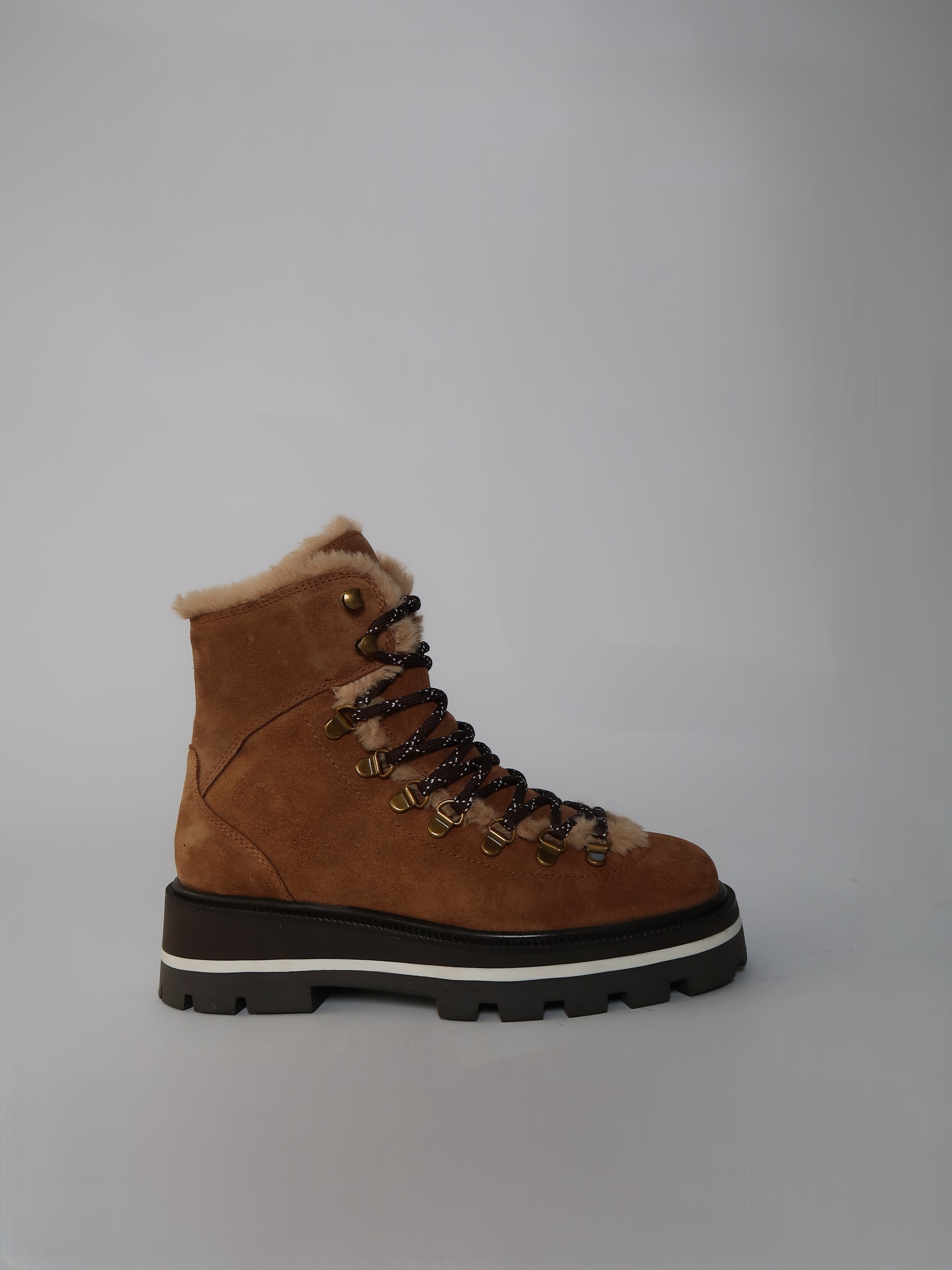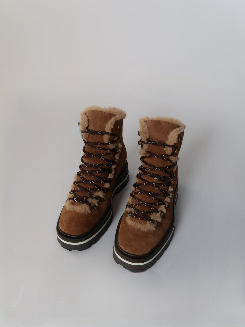 מגפוני טדי עשויים זמש בגוון חום בגימור בטנה במרקם פרוותי-שאגי רך. שרוכים בזיגזג משולבים באבזמים זהובים, סוליה מוגבהת ונוחה