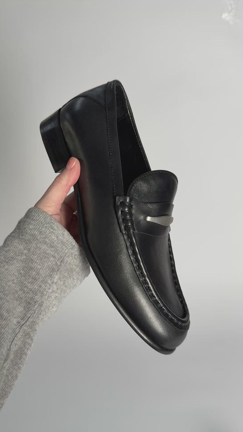 מוקסינים מעור רל בצבע שחור, עם חזית קלאסית ומראה נקי. רצועה רחבה במרכז הנעל בשילוב אלמנט כסוף ותיפורים עדינים לאורך הנעל מוסיפים טאצ’ מתוחכם וקלאסי לעיצוב. מתאימים בקלות ללוק משרדי מתוחכם או סטייל קז’ואל עם טוויסט.