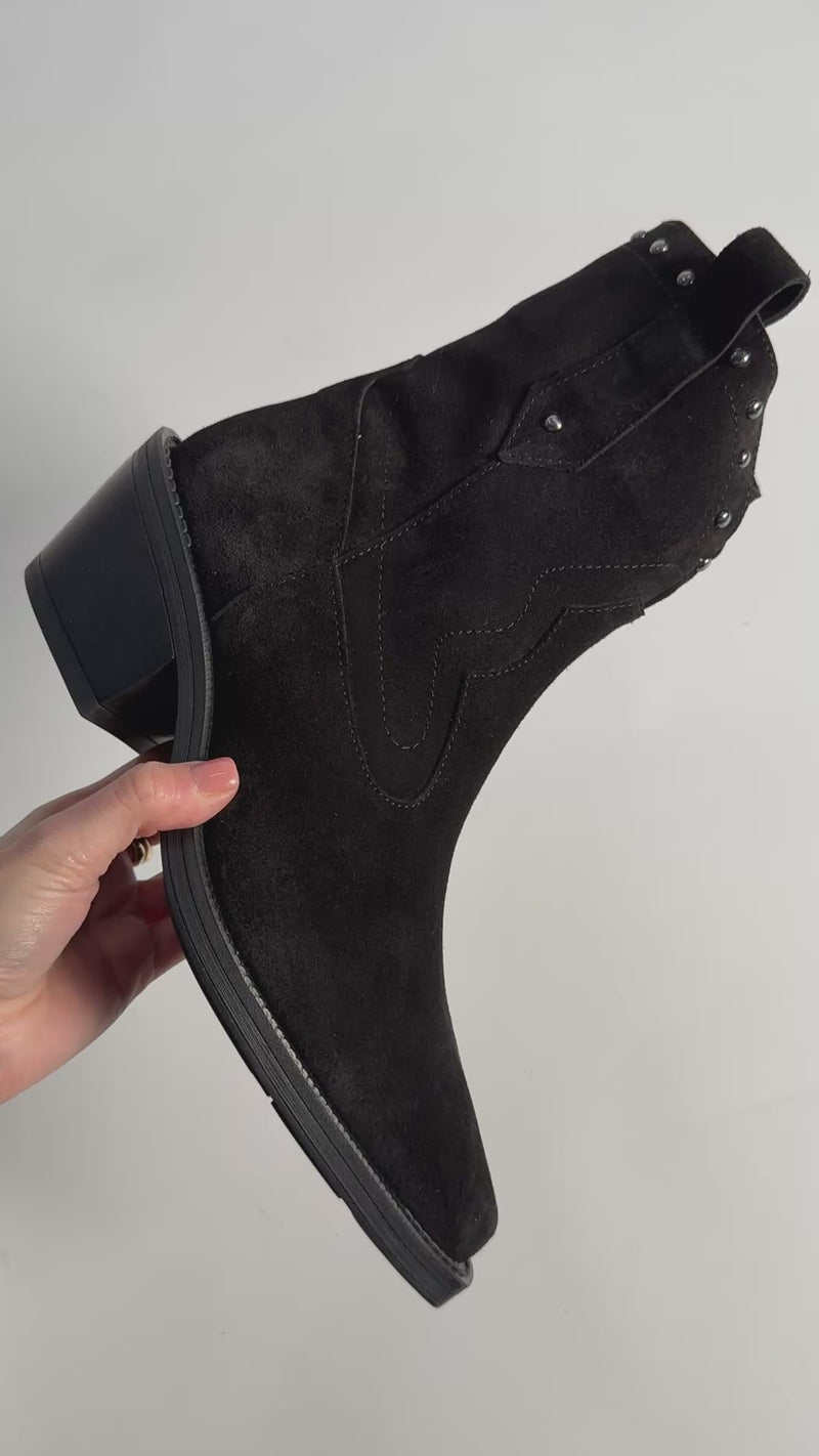 מגפוני בוקרים מזמש שחור, עם ניטים עדינים לצד התפרים שמוסיפים נקודת אור ומעניקים לדגם אופי. החרטום המעודן והעקב הרחב שומרים על קו אלגנטי ונגיש, והגזרה האמצעית משתלבת בקלות עם לוקים יומיומיים ועם הופעות ערב קלילות.