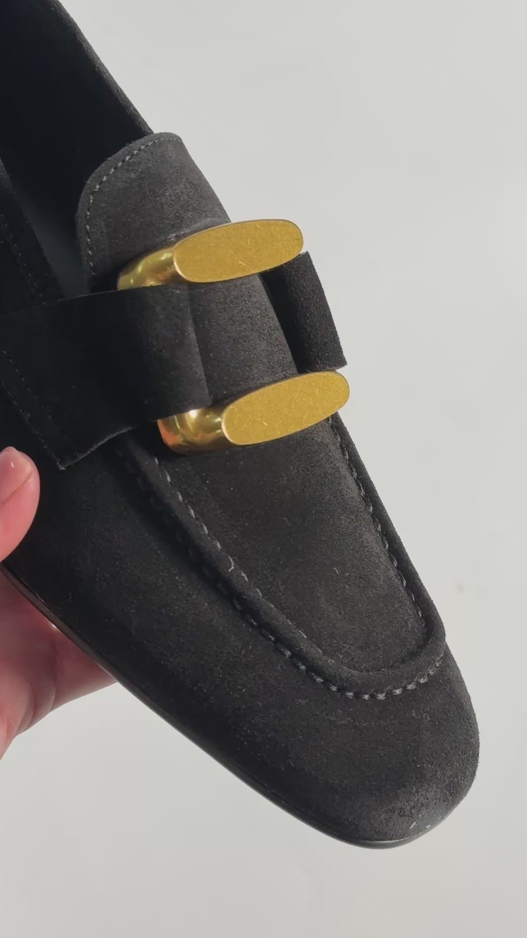 מוקסינים מזמש שחור, עם אלמנט מרכזי זהב שמוסיף נוכחות מדויקת ואלגנטית. הגזרה מלבנית עם קו מודרני ונקי, והסוליה השטוחה שומרת על תחושת נוחות לאורך כל היום. דגם שמשלב בין קלאסיות לרעננות עכשווית — מושלם למראה יומיומי מתוחכם.