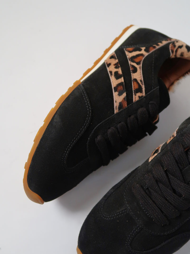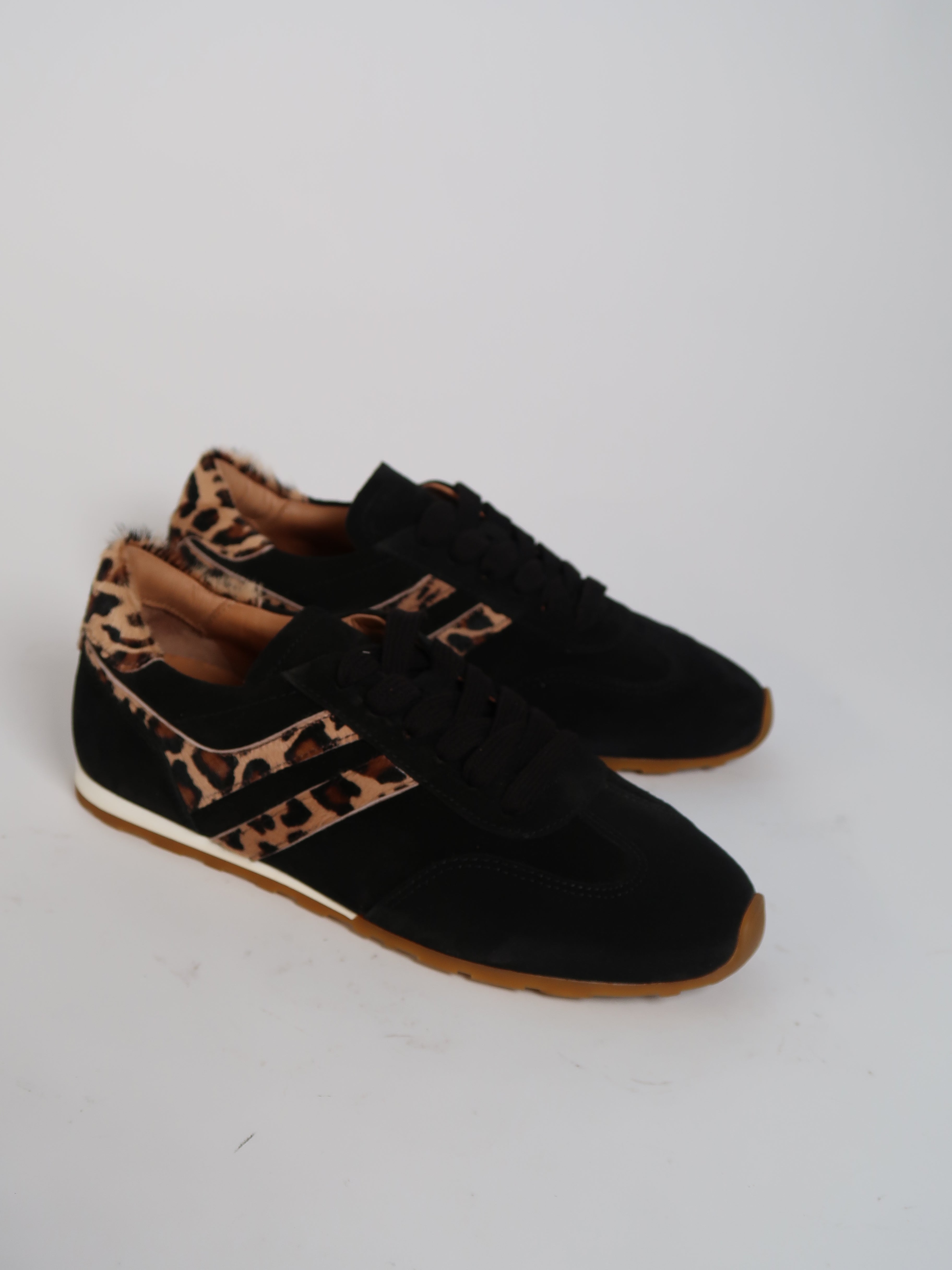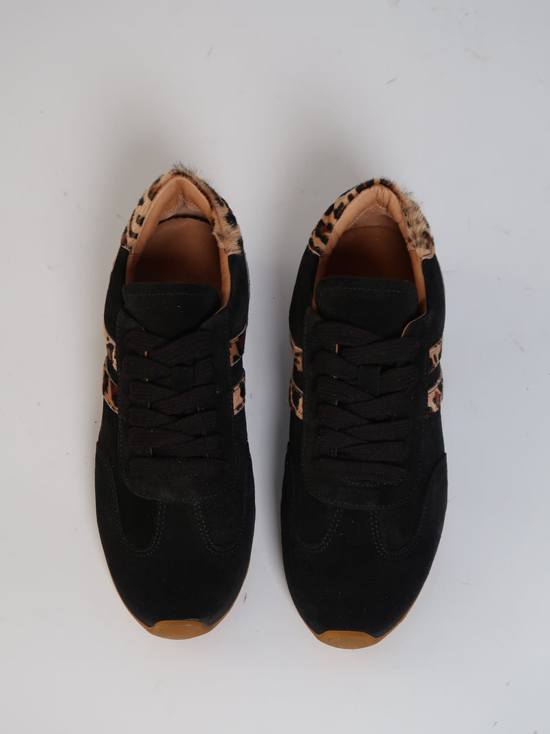 סניקרס מזמש בצבע שחור בשילוב פרינט מנומר, שרוכים לבנים. סוליית גומי בצבע לבן עם פס חום.