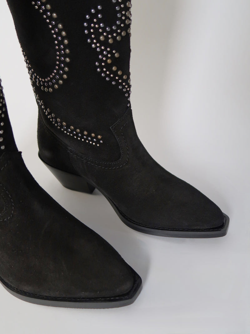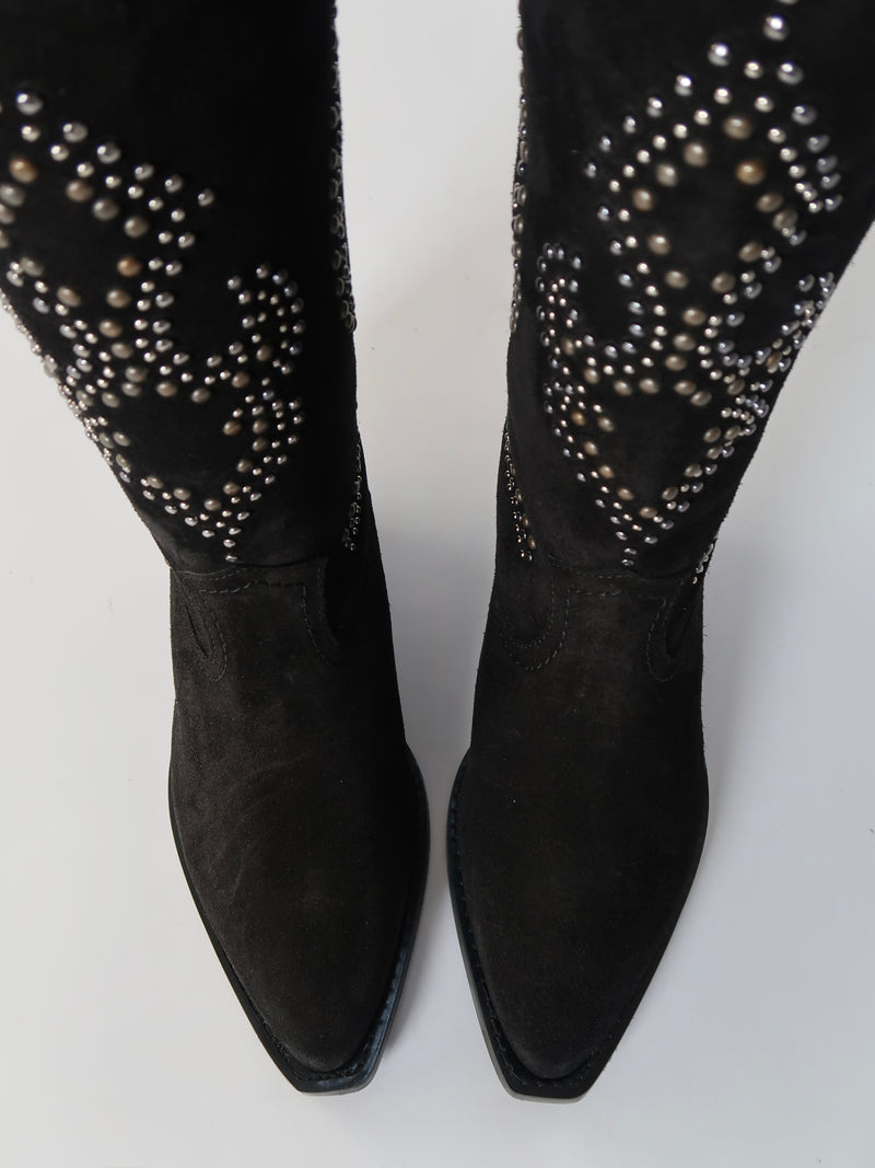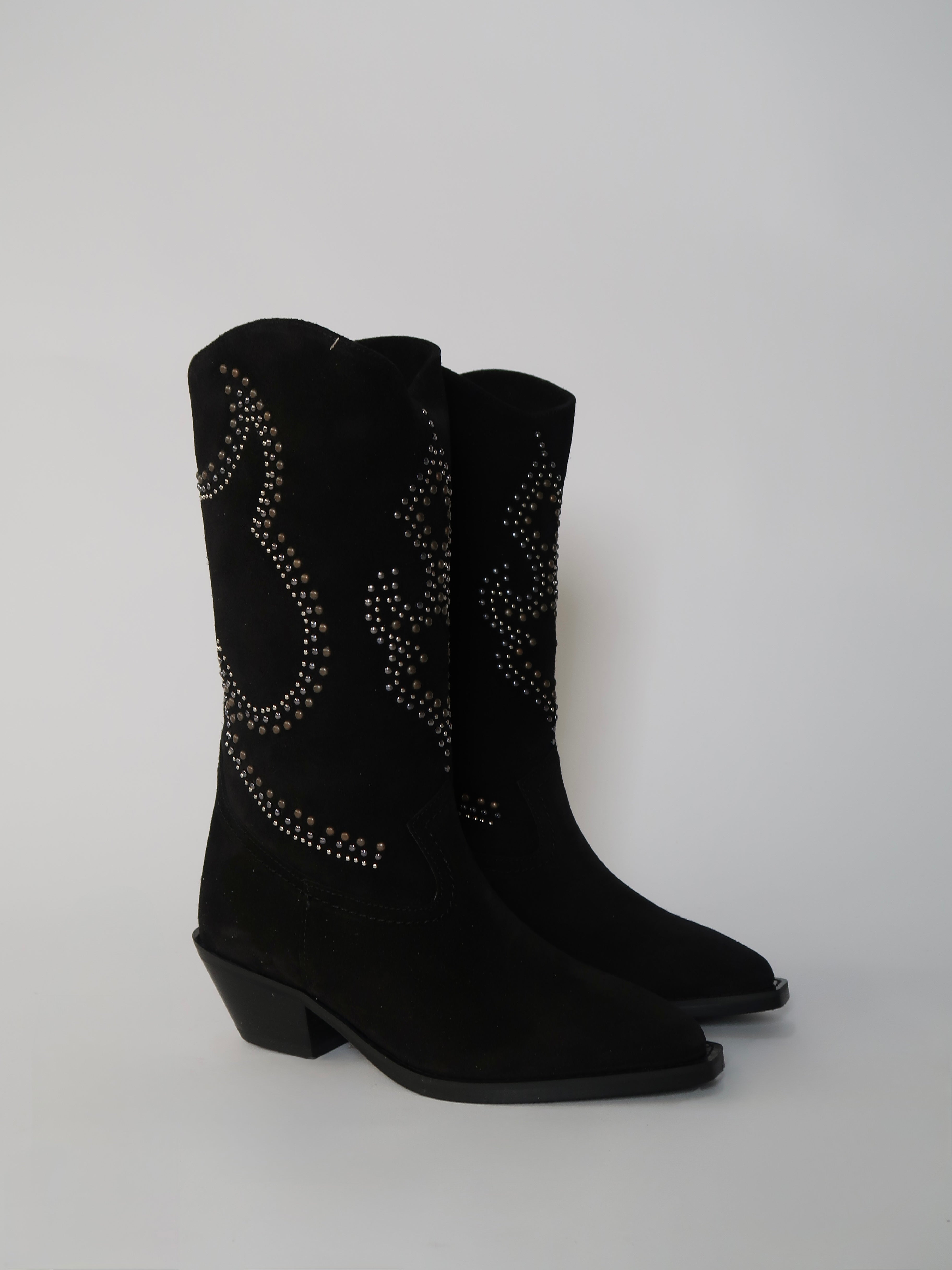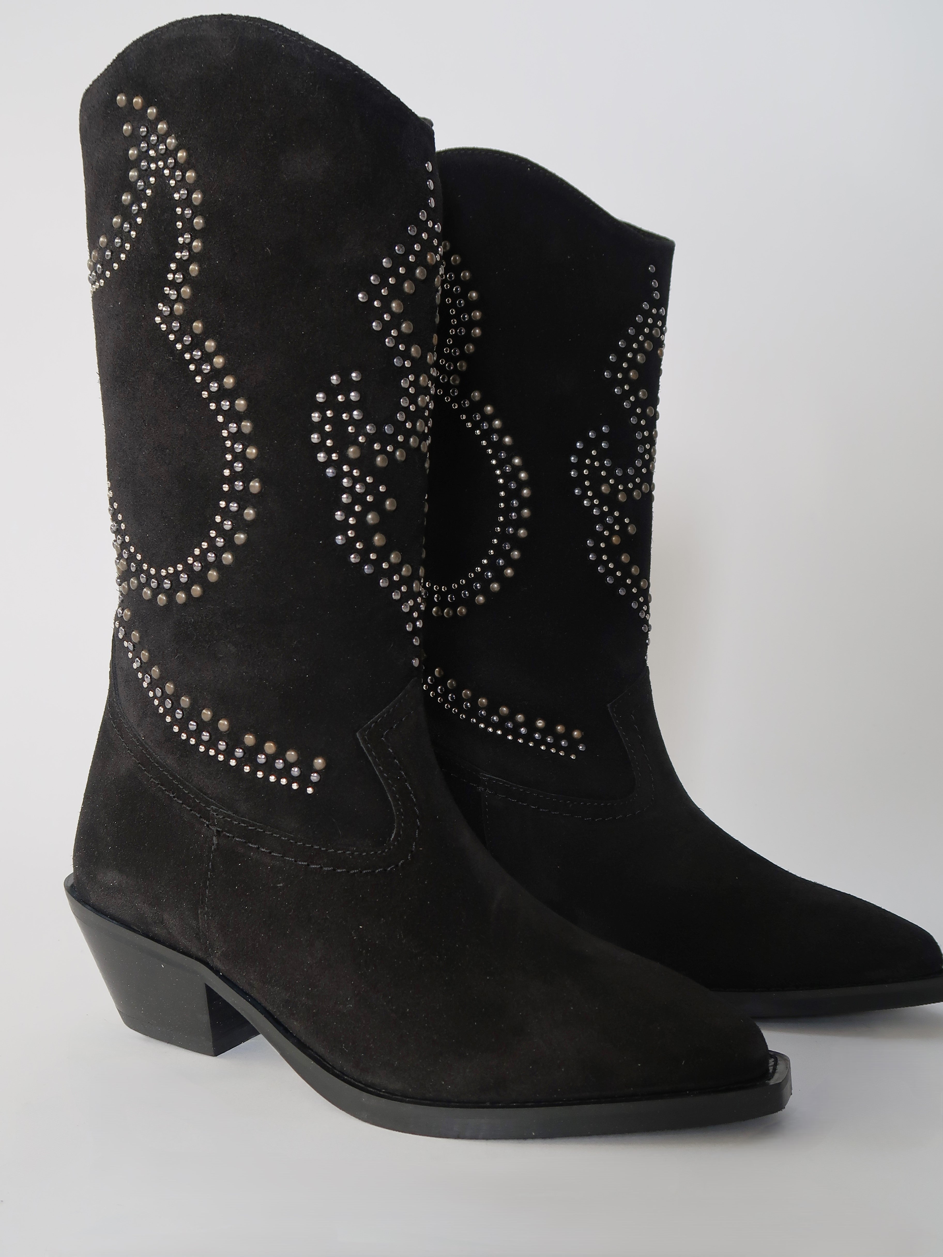 מגפי בוקרים מזמש שחור, עקב יציב ונוח, תיפורים עדינים בחזית, עיטורי ניטים מטאליים לאורך המגף שמייצרים דוגמת פייזלי קלאסית, ומוסיפים טאצ' ייחודי ומלא אופי.