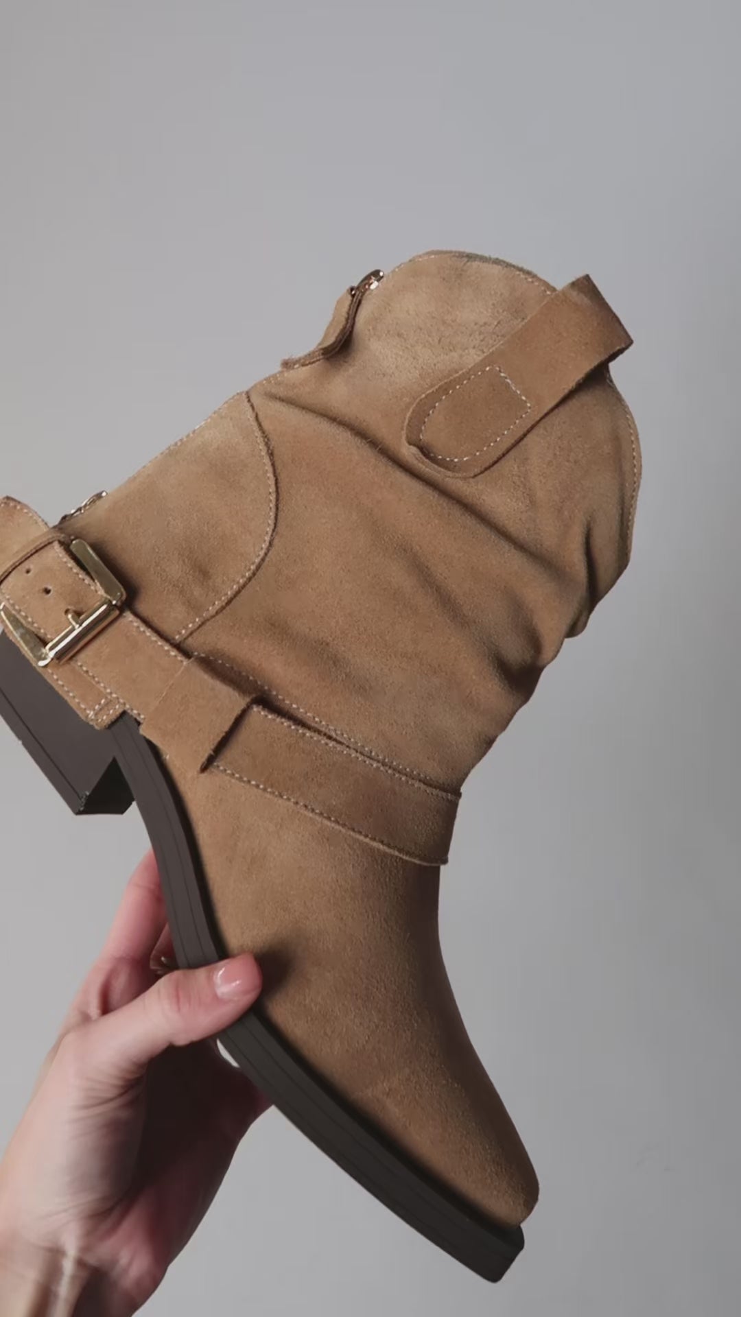 מגפוני בוקרים מזמש בגוון קאמל, עם רצועה ואבזם צדדי שמוסיפים להם נגיעה מחוספסת ועדינה בו־זמנית. סוליית גומי גמישה ונוחה והעקב הרחב מעניק תחושה יציבה וקלילה. רוכסן בצד הפנימי לנעילה מהירה וקלה. דגם שמתחבר בקלות לכל לוק — מג’ינס פשוט ועד שמלה רכה