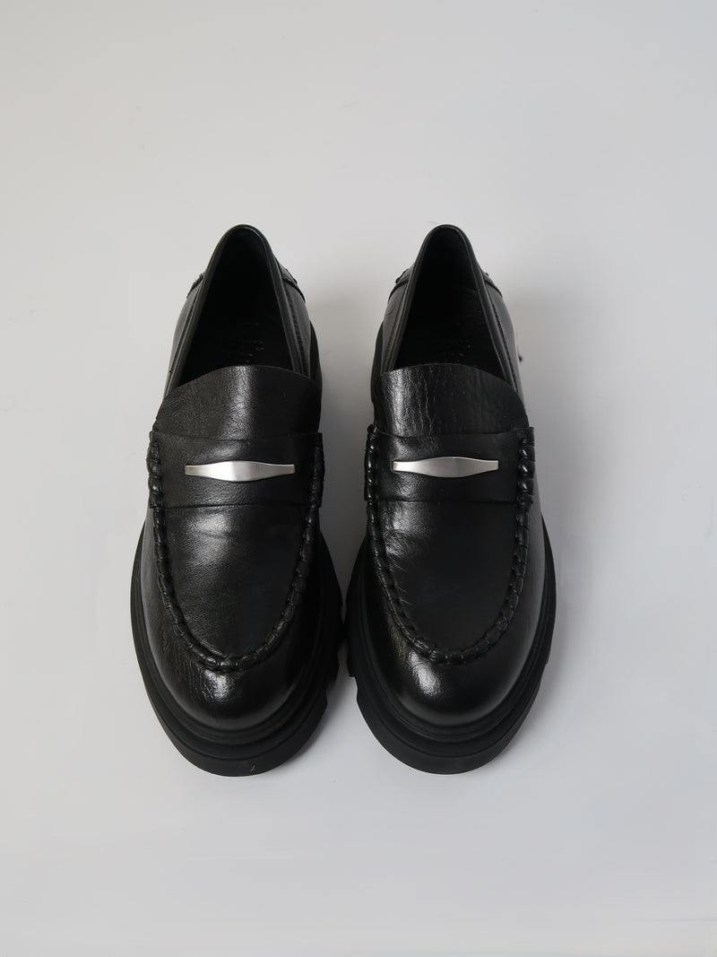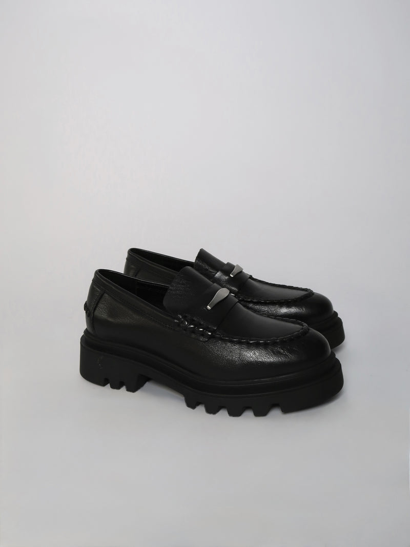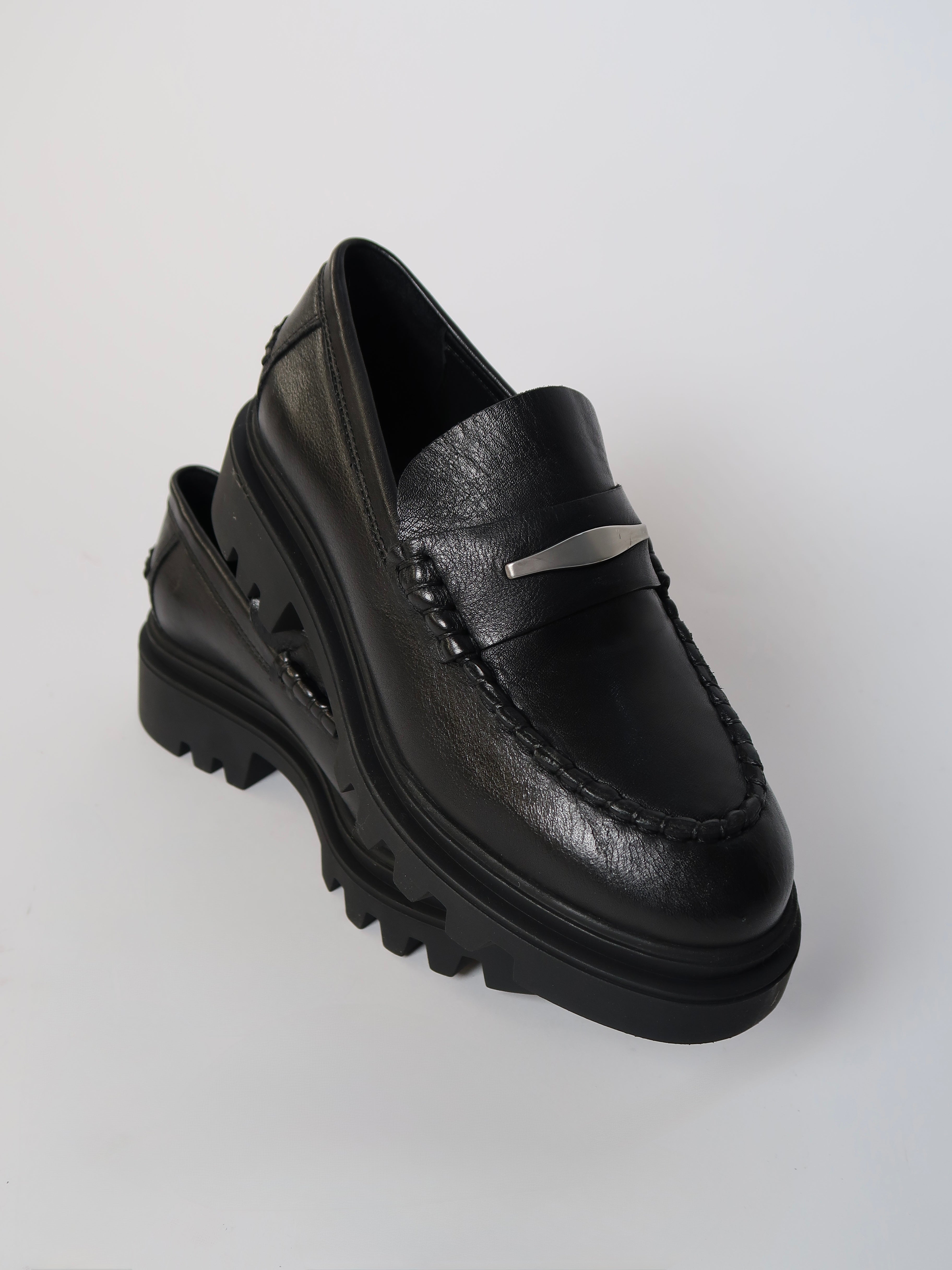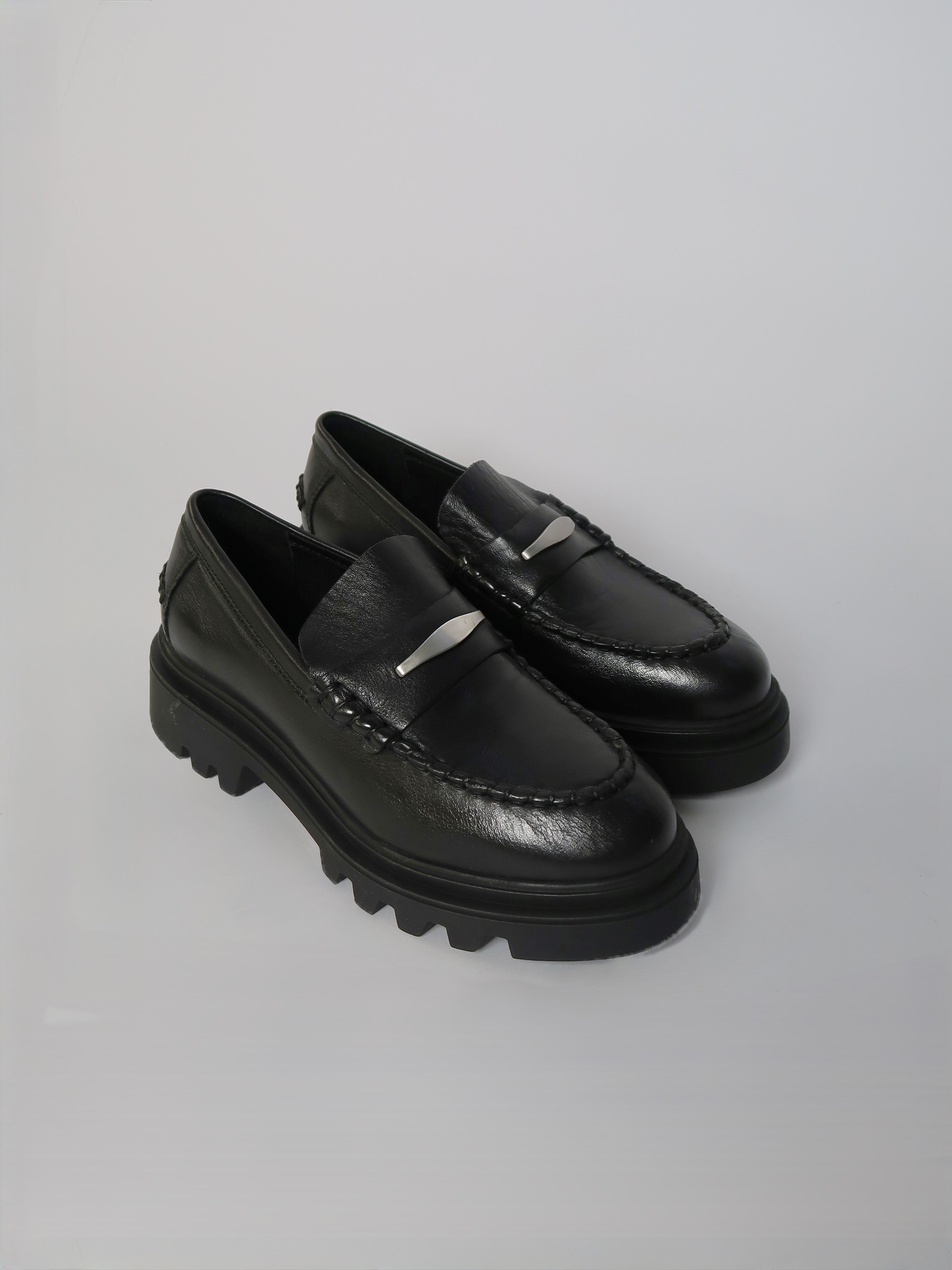 נעלי אוקספורד פלטפורמה מעור שחור ורך, צללית קלאסית עם תיפור ורצועה רוחבית, משודרגת עם דיטייל מתכת כסוף; טוויסט של סוליית פלטפורמה בצבע תואם, מוגבהת ונוחה. מושלם לכל אאוטפיט!