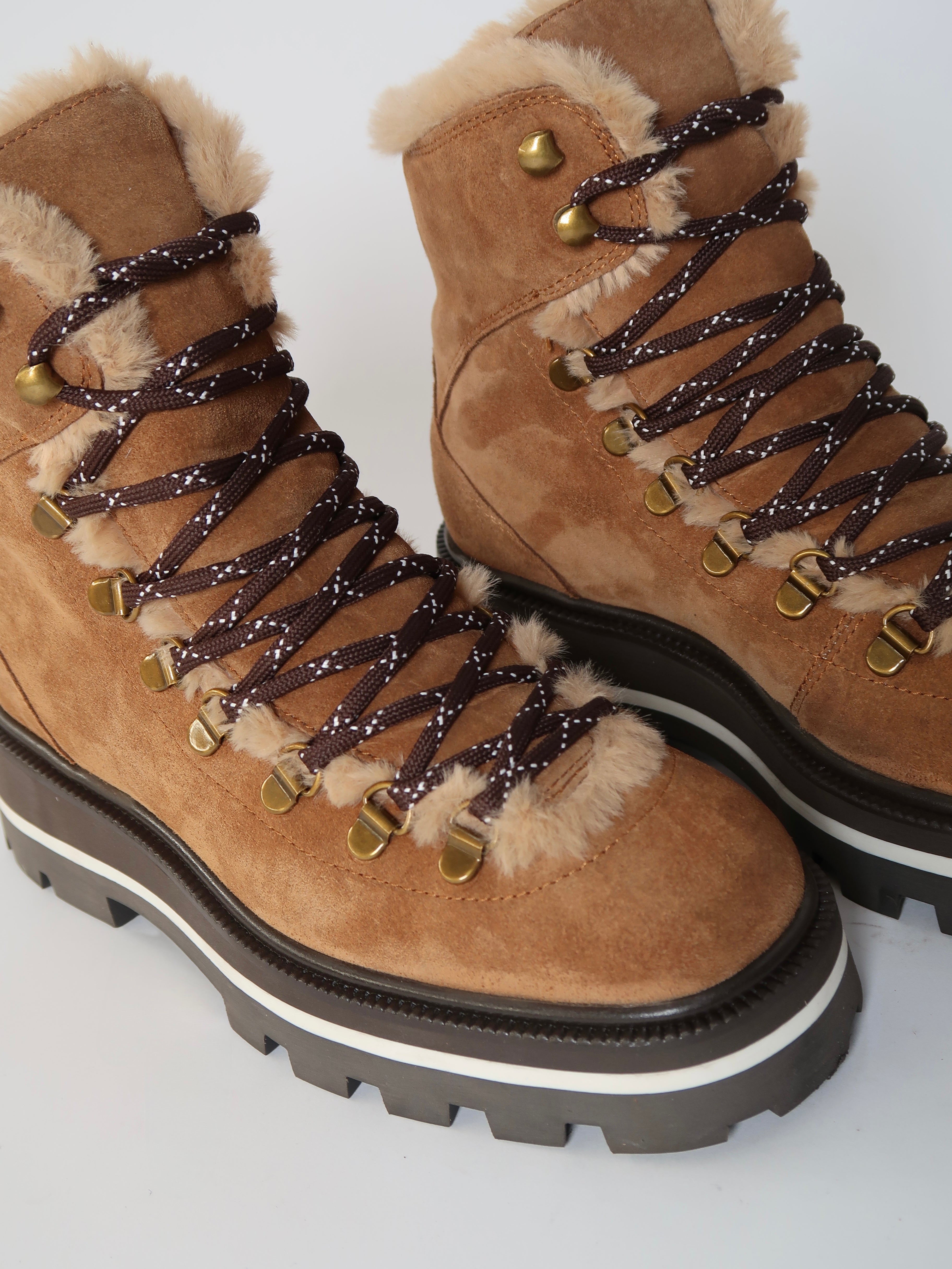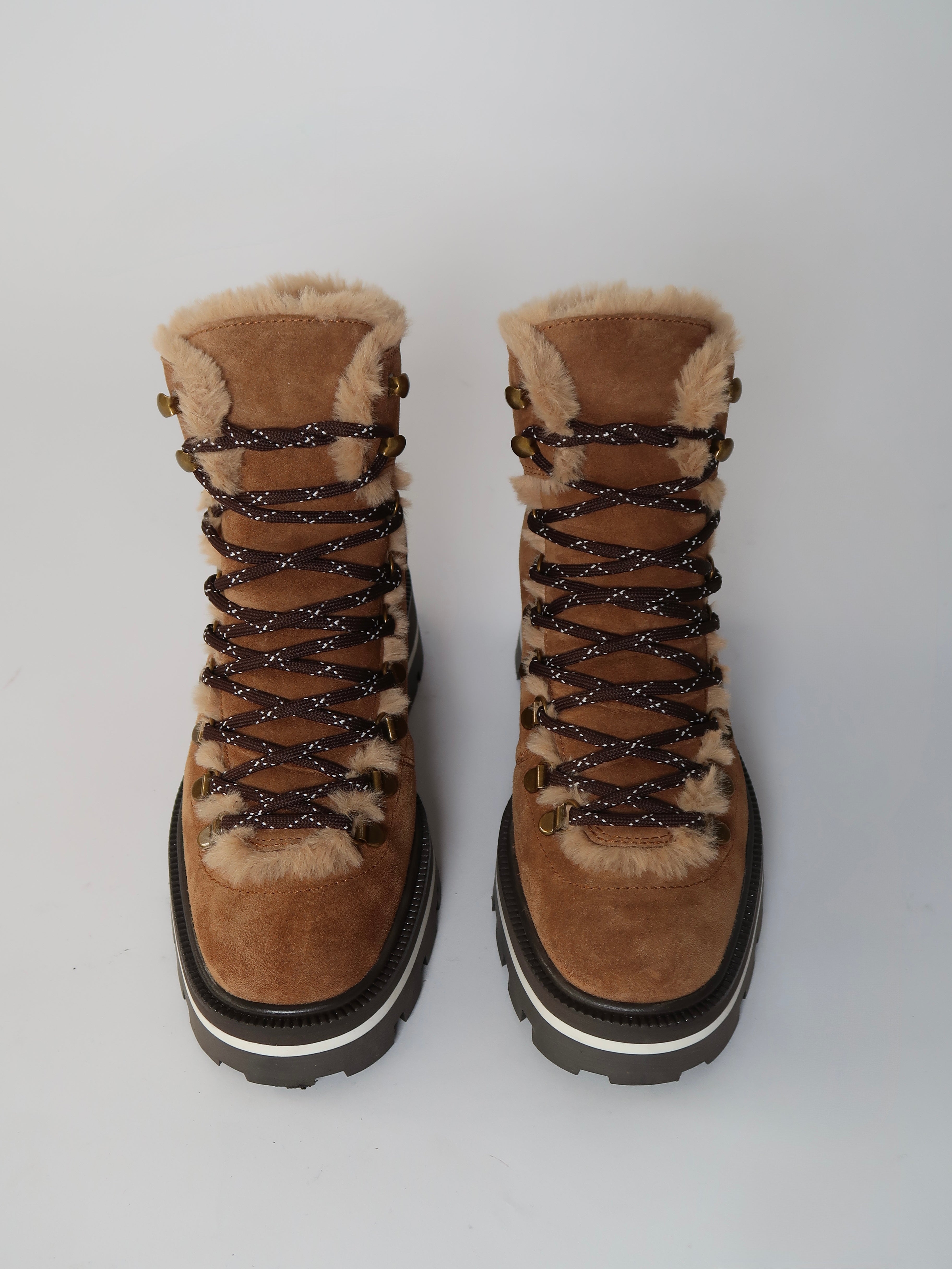 מגפוני טדי עשויים זמש בגוון חום בגימור בטנה במרקם פרוותי-שאגי רך. שרוכים בזיגזג משולבים באבזמים זהובים, סוליה מוגבהת ונוחה