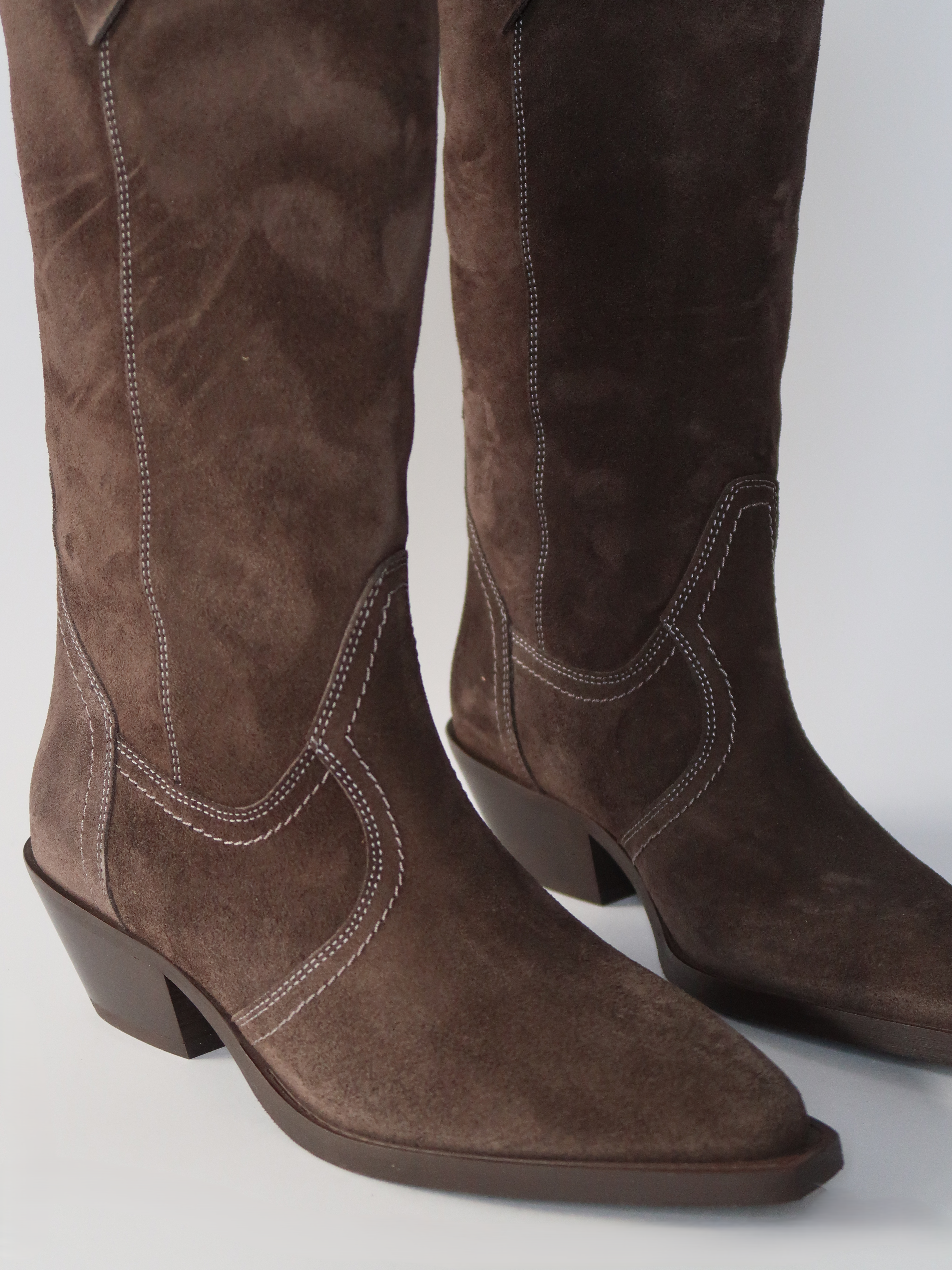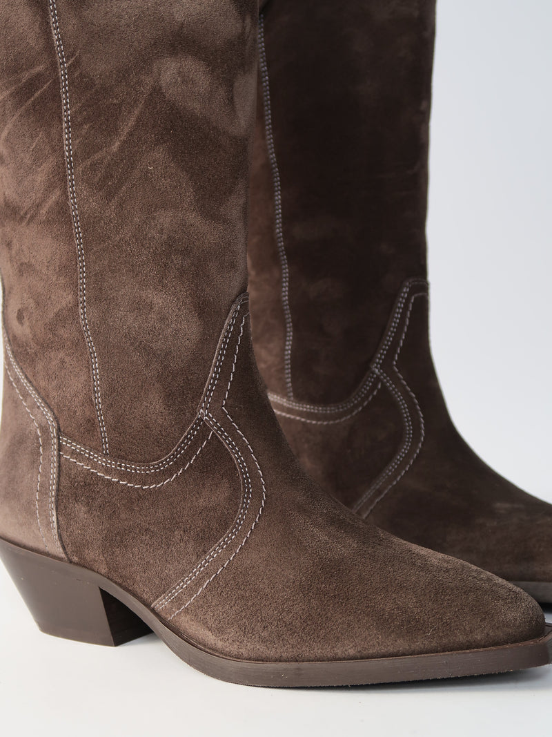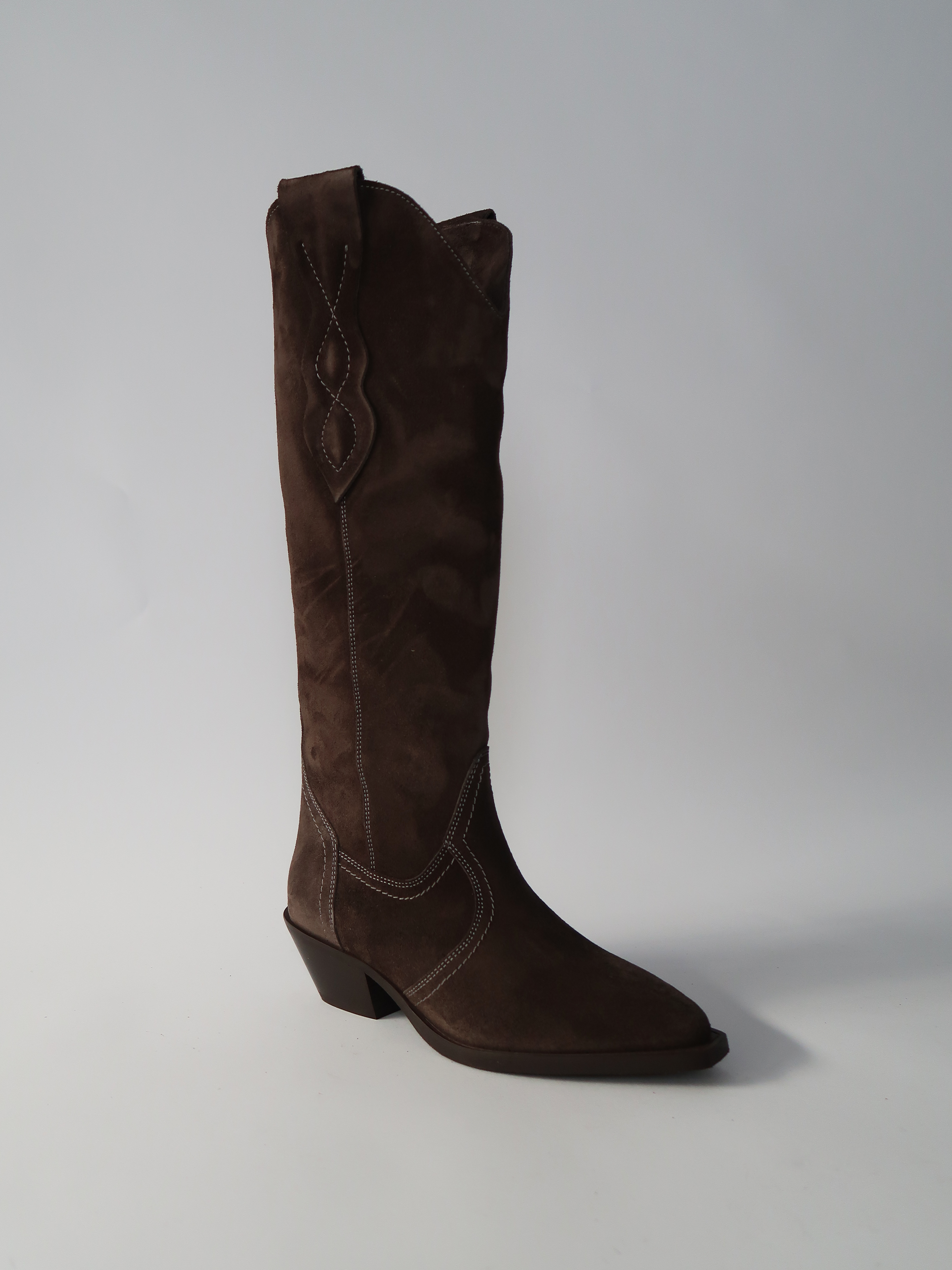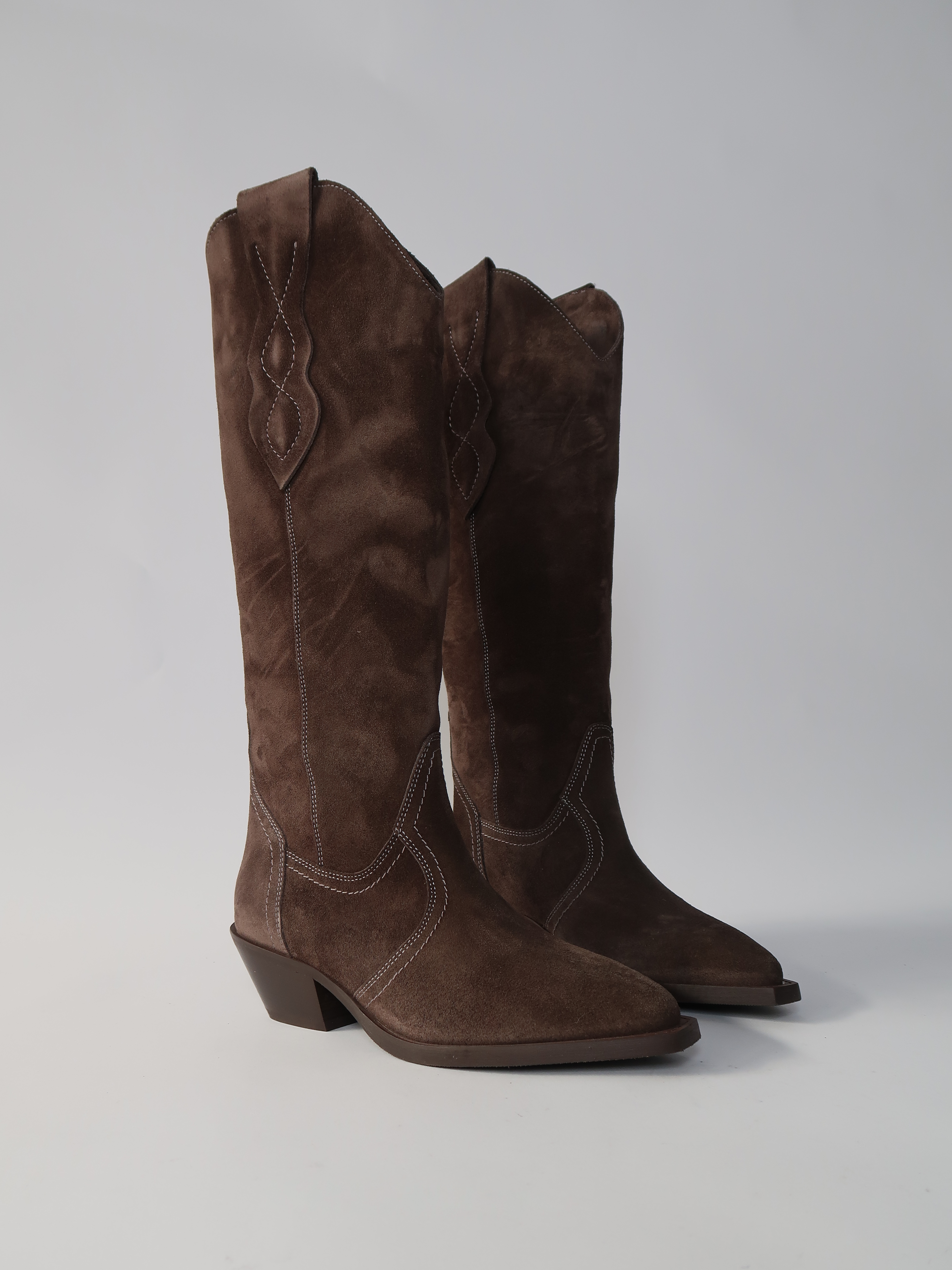 מגפי בוקרים עד הברך מזמש בגוון חום-אפרפר, עם מפתח מעוגל למעלה ותפרים מעודנים לבנים שמוסיפים אופי קלאסי של בוקרים. החרטום המחודד והעקב הרחב יוצרים קו אלגנטי שמאריך את הרגל, והגזרה הגבוהה מעניקה נוכחות מדויקת. *ללא רוכסן*
