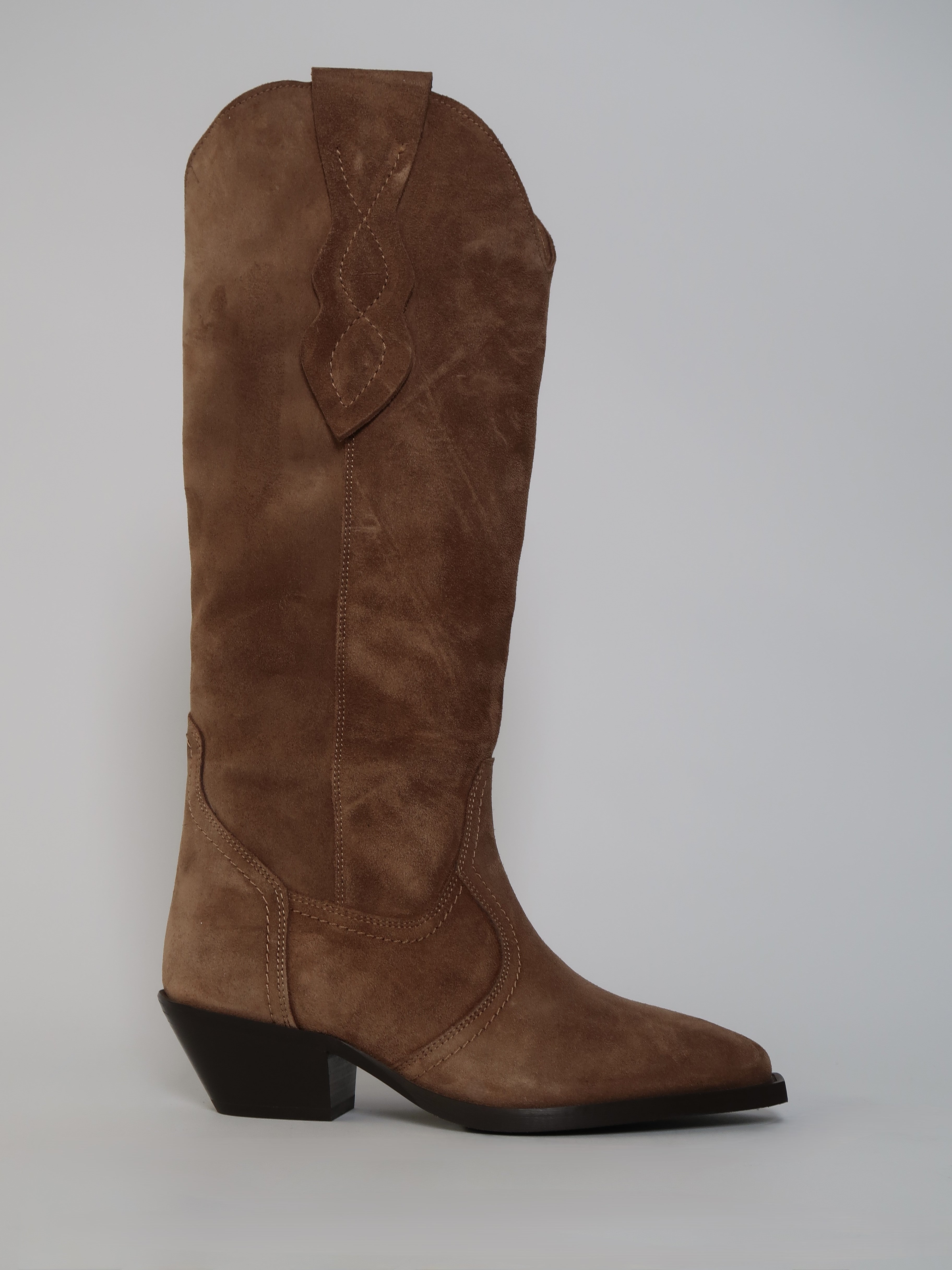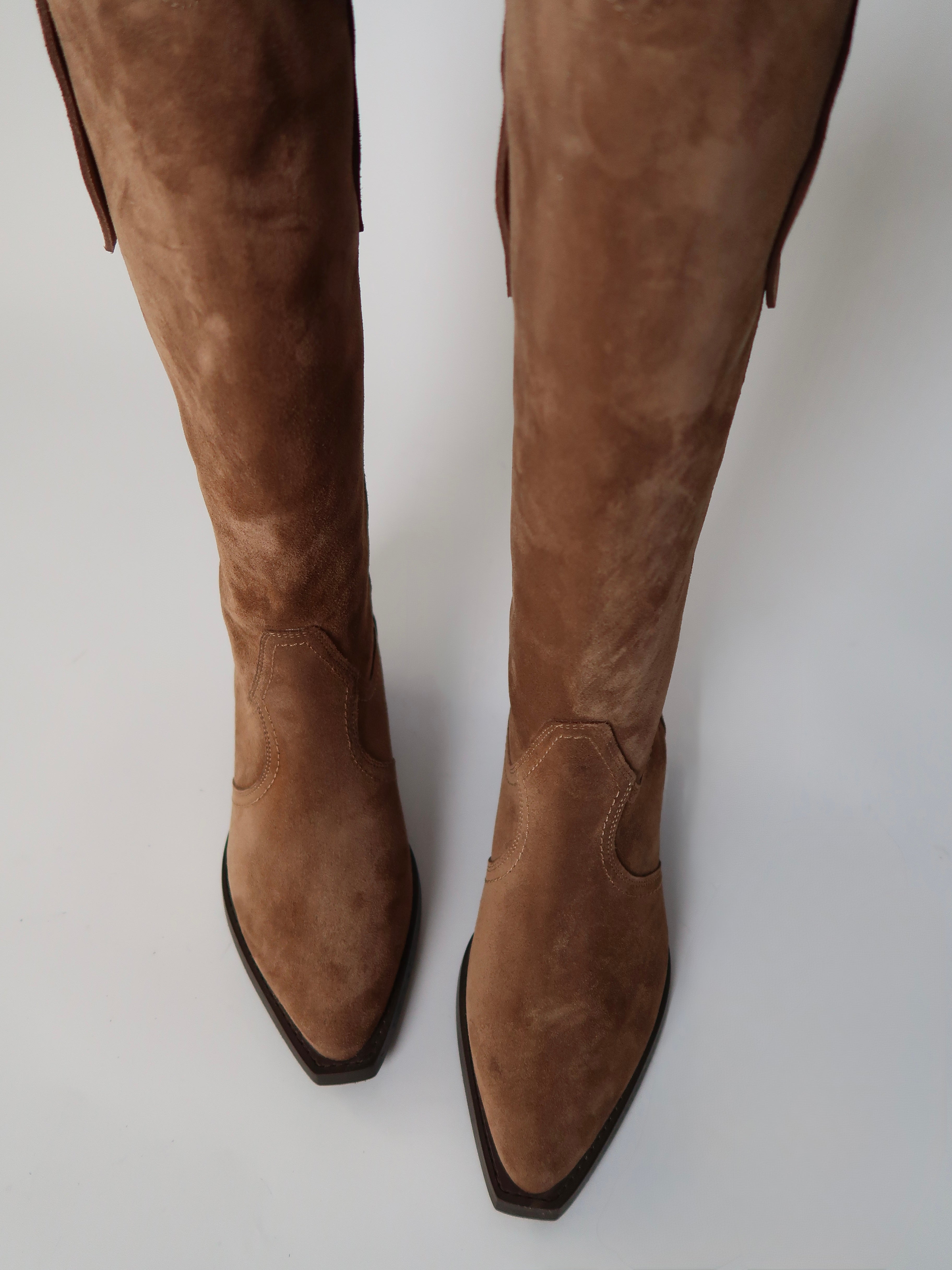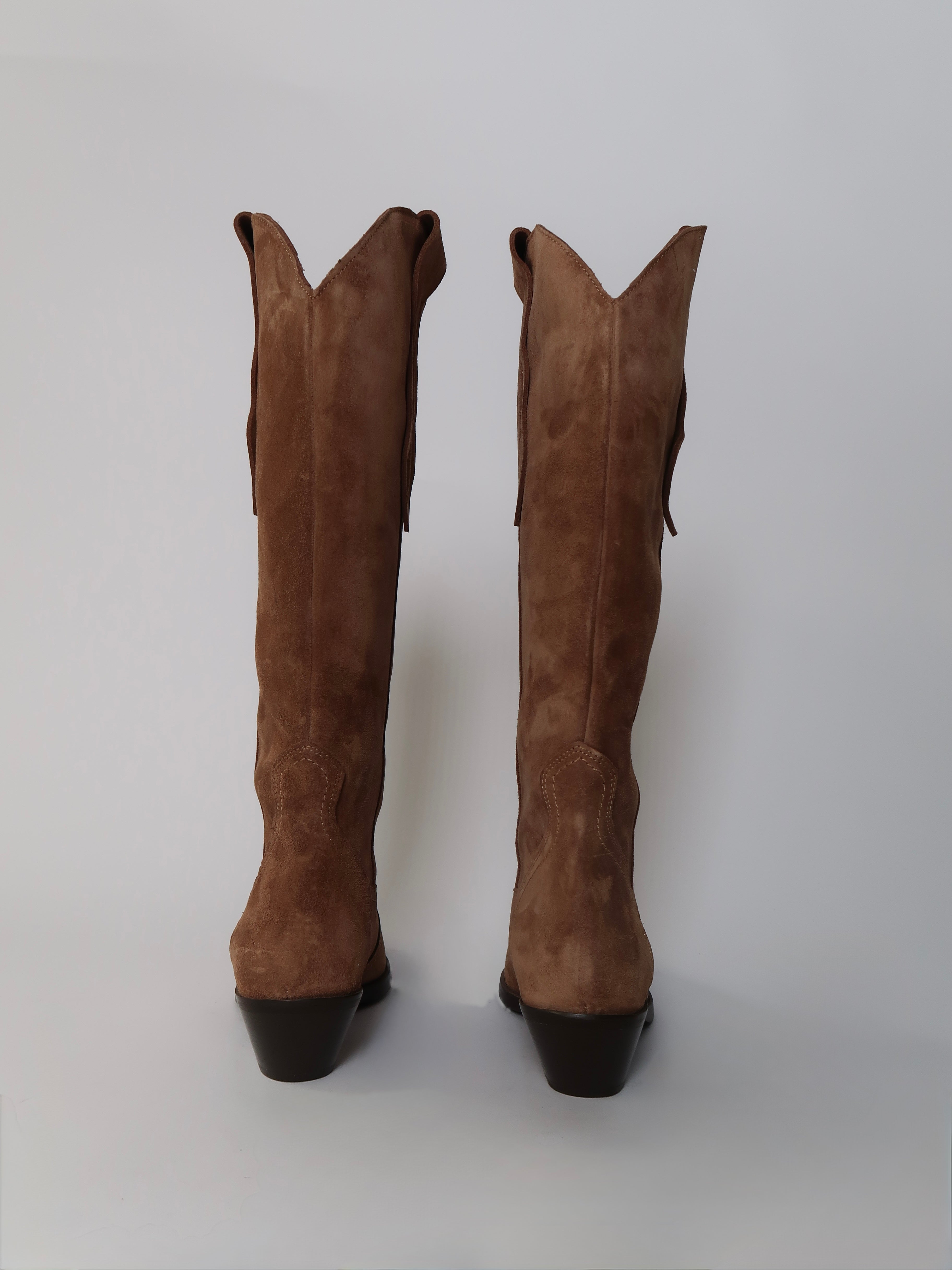 מגפי בוקרים עד הברך מזמש בגוון קאמל, עם מפתח מעוגל למעלה ותפרים מעודנים לבנים שמוסיפים אופי קלאסי של בוקרים. החרטום המחודד והעקב הרחב יוצרים קו אלגנטי שמאריך את הרגל, והגזרה הגבוהה מעניקה נוכחות מדויקת. *ללא רוכסן*
