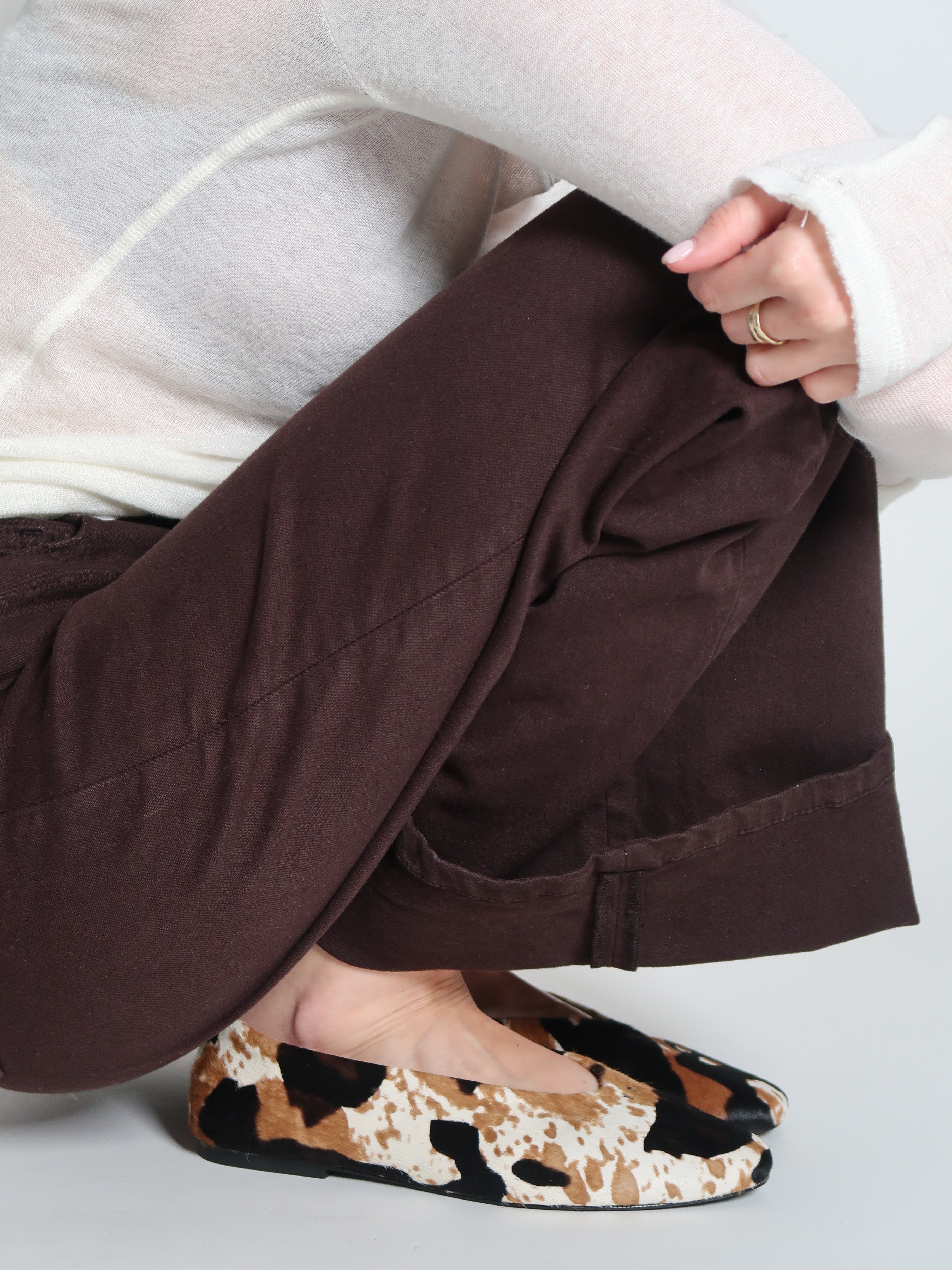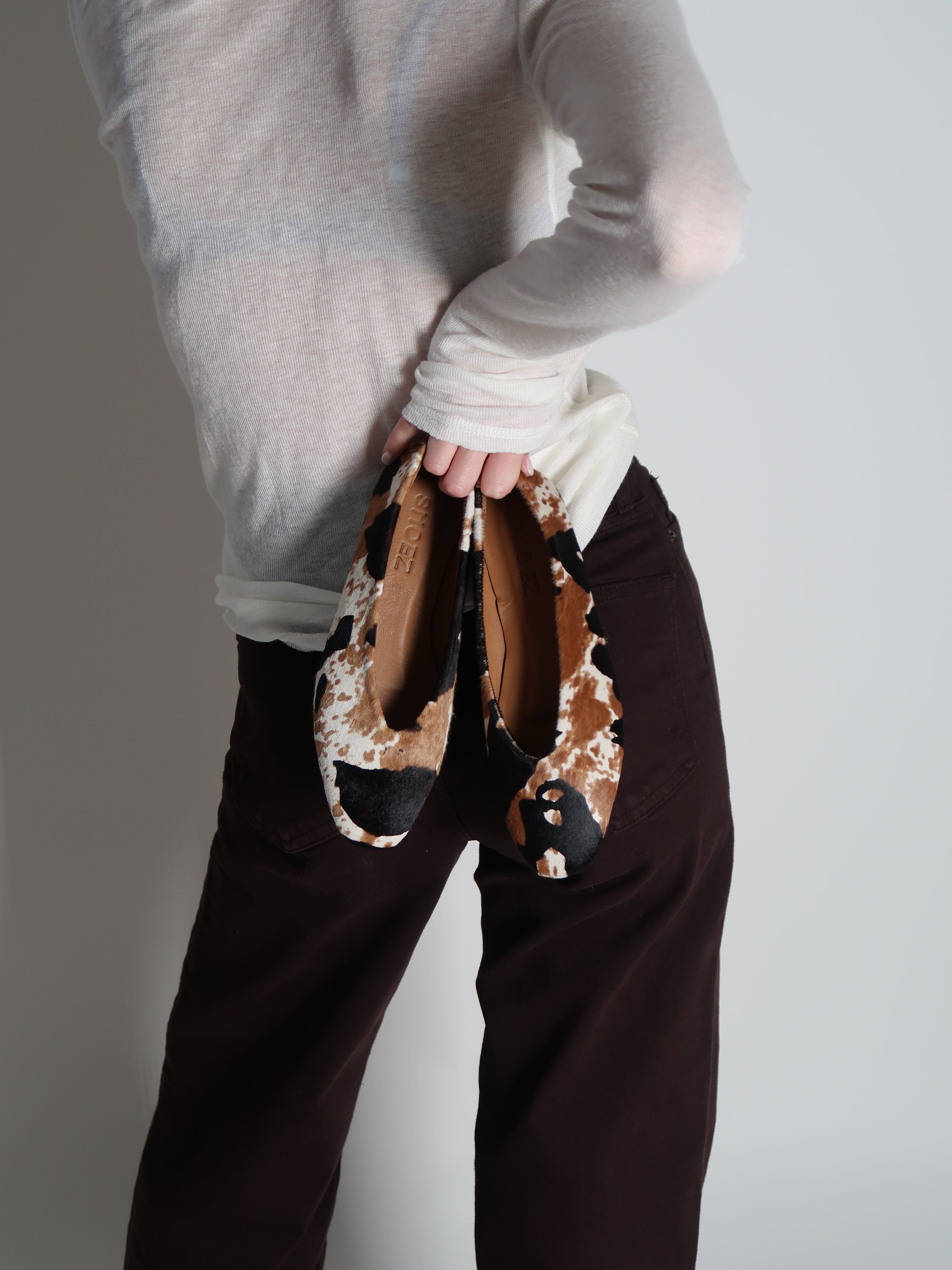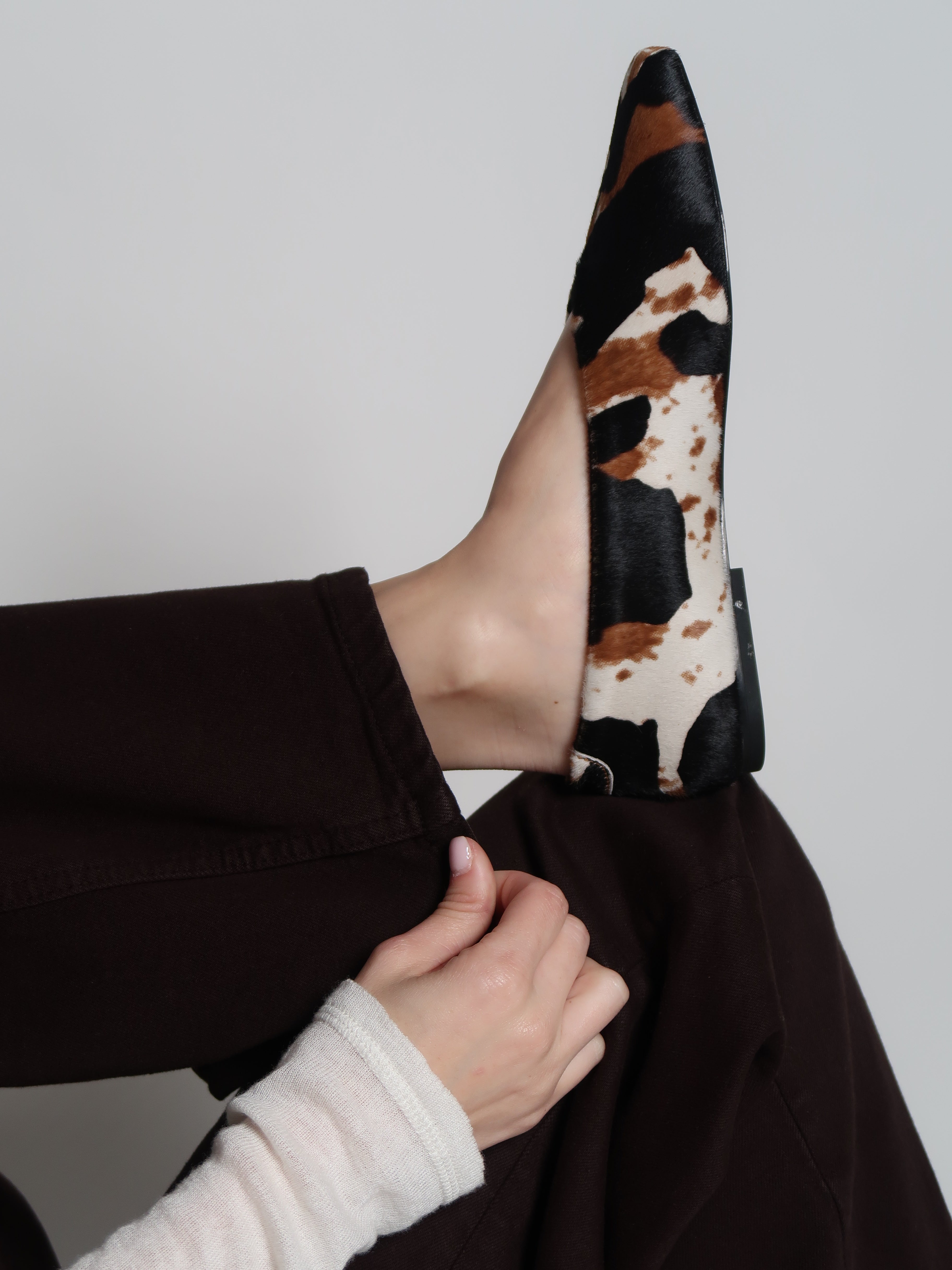 נעלי בובה מעור בפריט פוני פרה בגוונים שחור חום ולבן, למקסימום ייחודיות. הגזרה הרכה מחבקת את כף הרגל ומעניקה מראה נקי ונשי, מושלם ליום עבודה, בילוי בעיר או כל רגע שדורש שילוב של נוחות וסטייל.