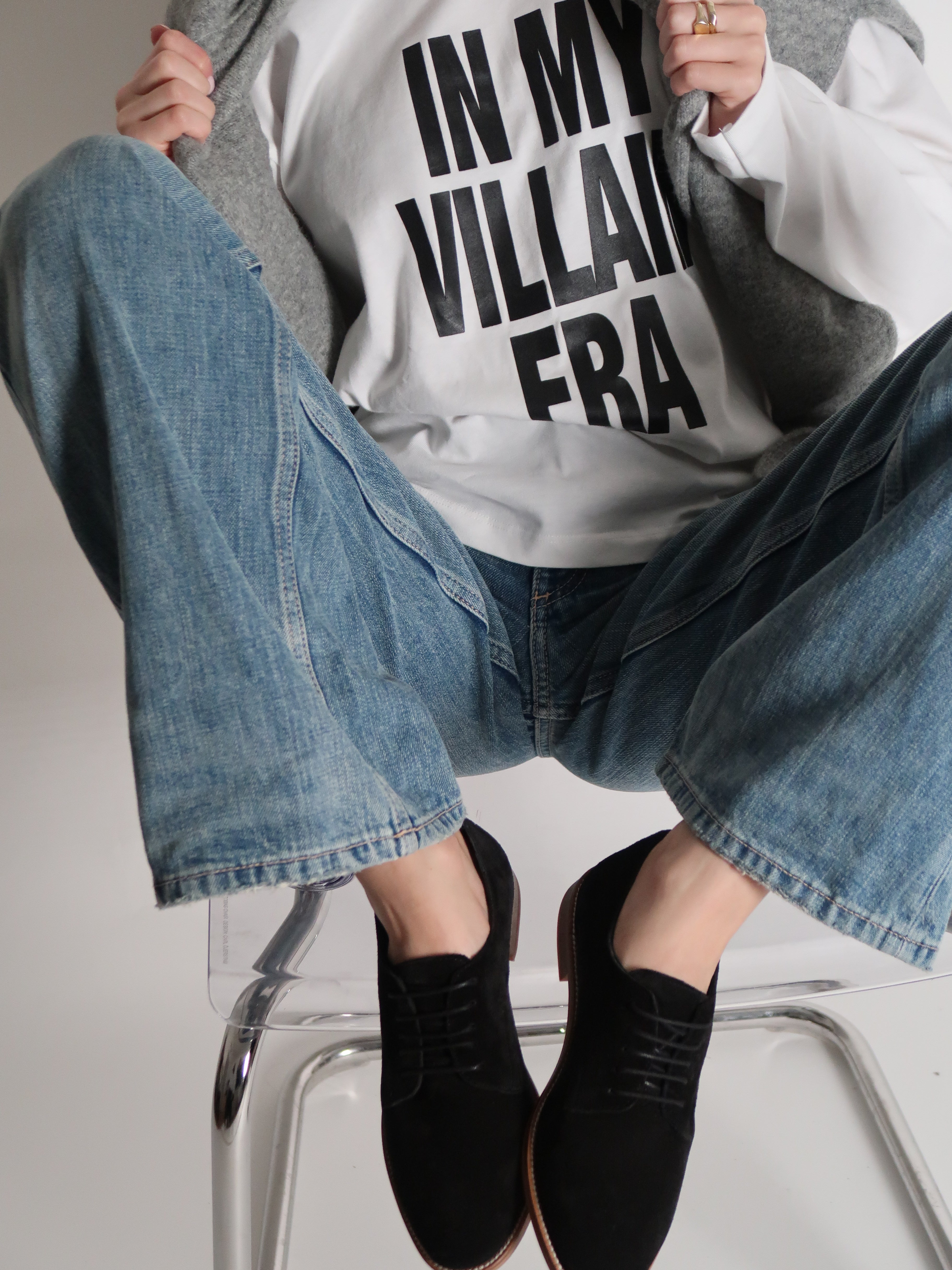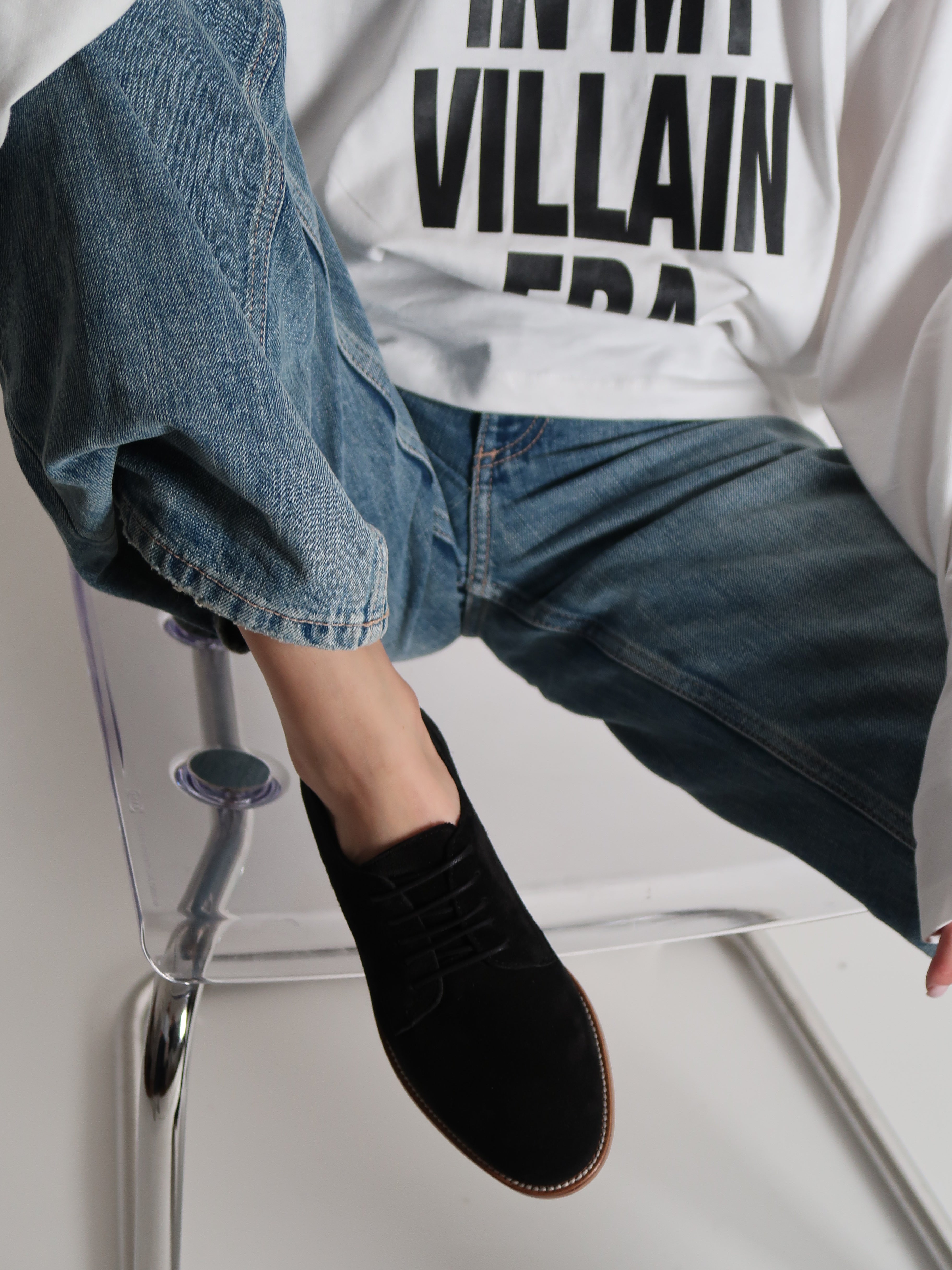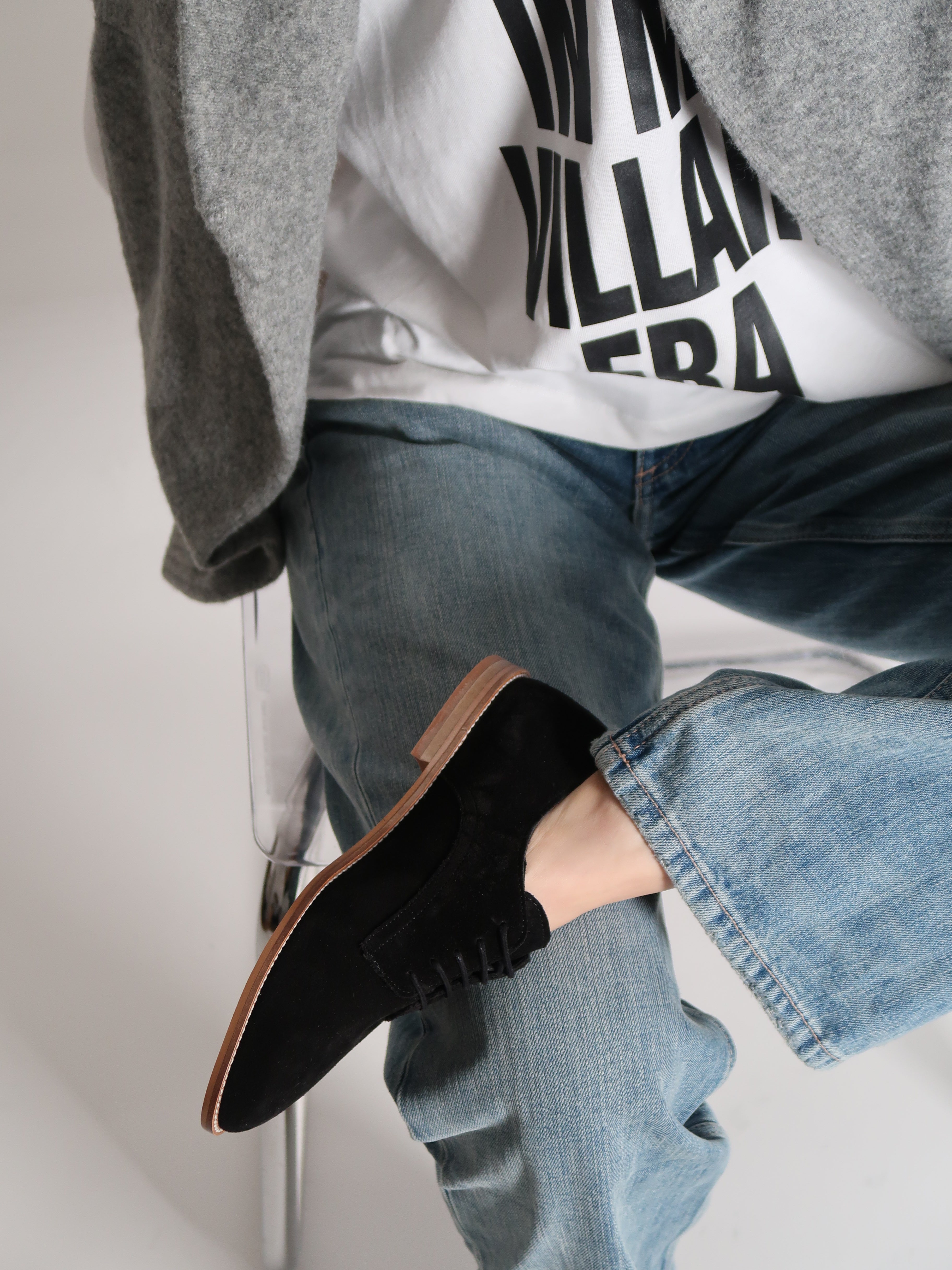 נעלי אוקספורד מזמש בצבע שחור, בעיצוב נקי עם שרוכים דקים וגימור רך ונעים למגע. הסוליה השטוחה מעניקה נוחות לאורך כל היום, והסגנון האלגנטי־יומיומי שלהן משתלב בקלות עם כל לוק - משמלה קלילה ועד ג’ינס קלאסי.