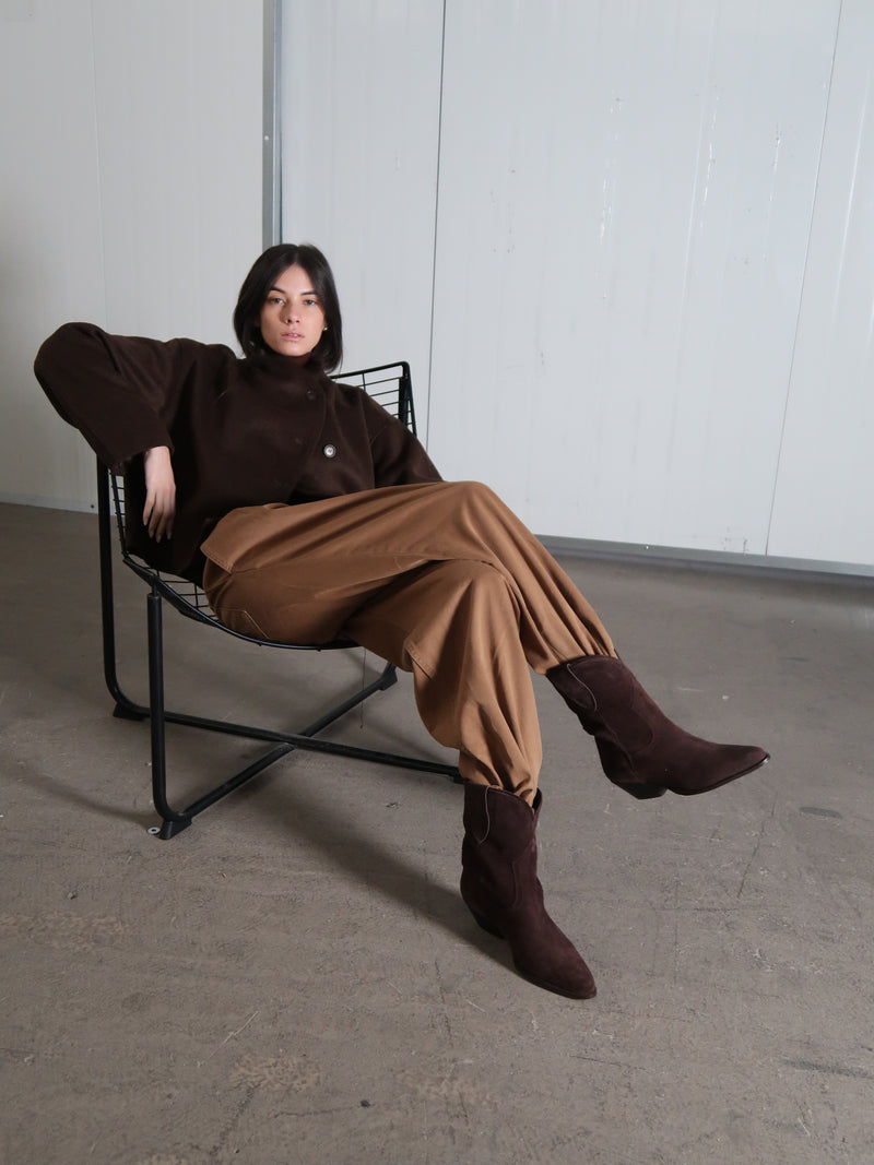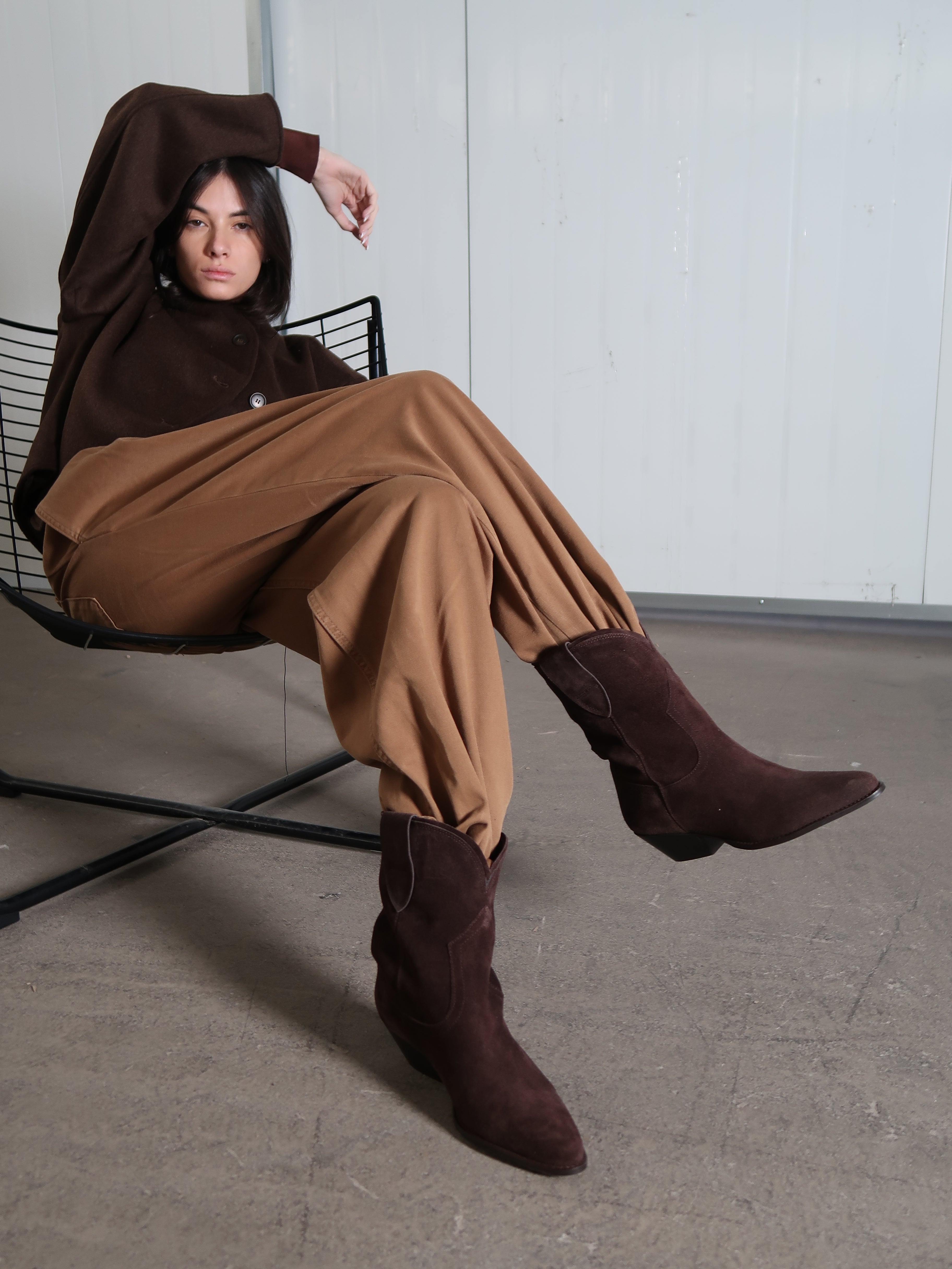 מגפוני בוקרים מזמש בגוון חום שוקולד, עם צללית נקיה וחרטום מחודד שמדגישים את הקו הקלאסי של הדגם. מראה מאוזן ונעים ליום-יום, עם נוכחות שקטה שמתאימה כמעט לכל שילוב.
