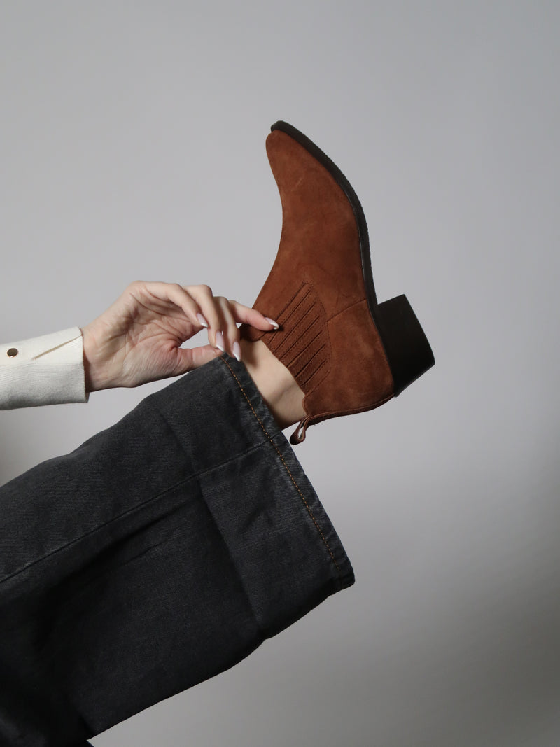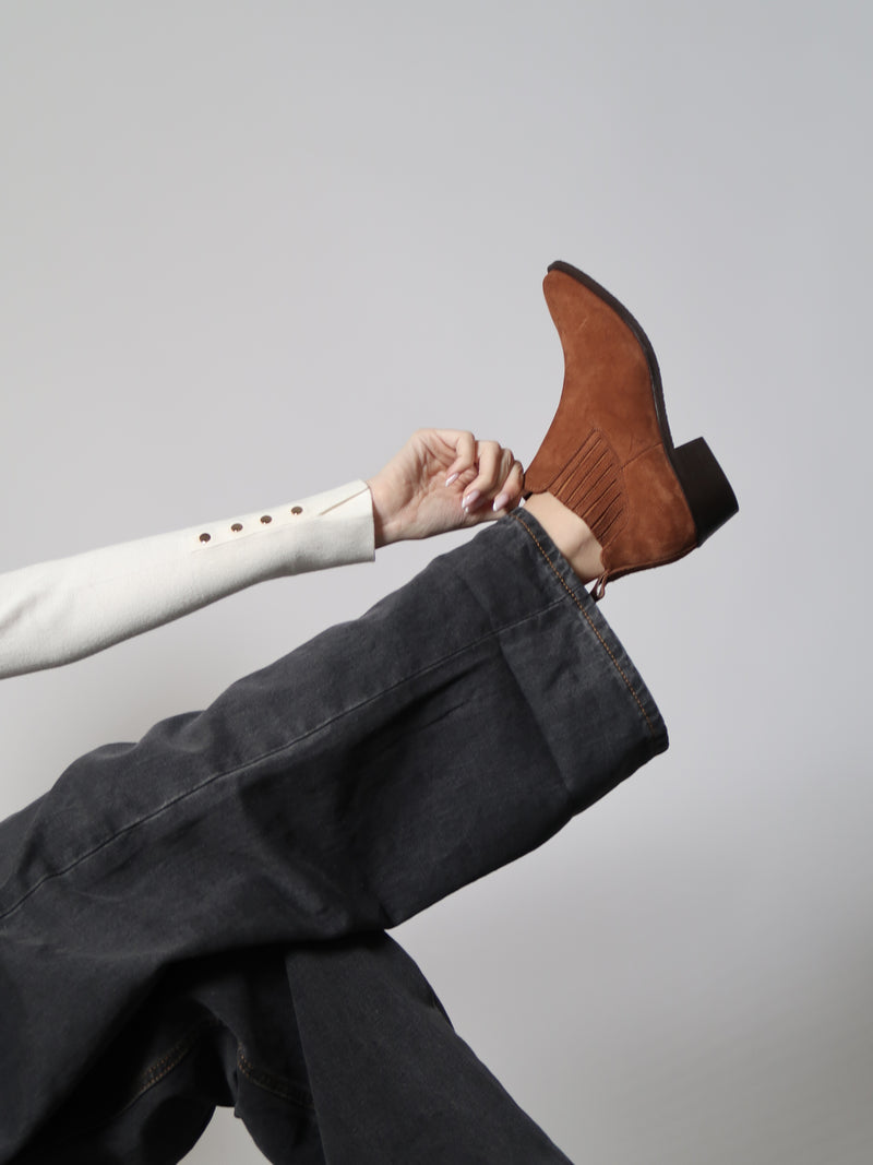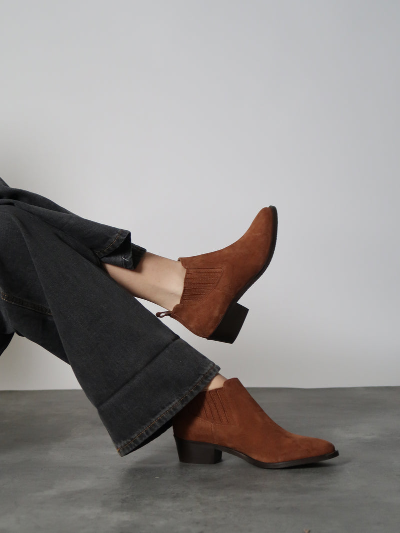 מגפוני בוקרים מזמש חום בגזרה נמוכה, עם גומי צדדי ותפרים עדינים שמוסיפים עומק מבלי להעמיס. החרטום המחודד והעקב הנמוך יוצרים מראה מאוזן ונקי - כזה שנוח ליום-יום אבל עדיין שומר על קו אלגנטי וברור.