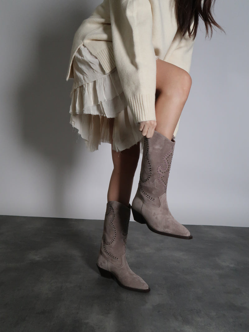 Sand-toned suede cowboy boots, with a pointed toe and a sturdy, comfortable heel. The black leather is decorated with silver studs that create an elegant geometric pattern, adding a unique touch full of character. A perfect combination of rugged classics and modernity, one that will work both during the day with jeans and at night with a dress or skirt. *No zipper