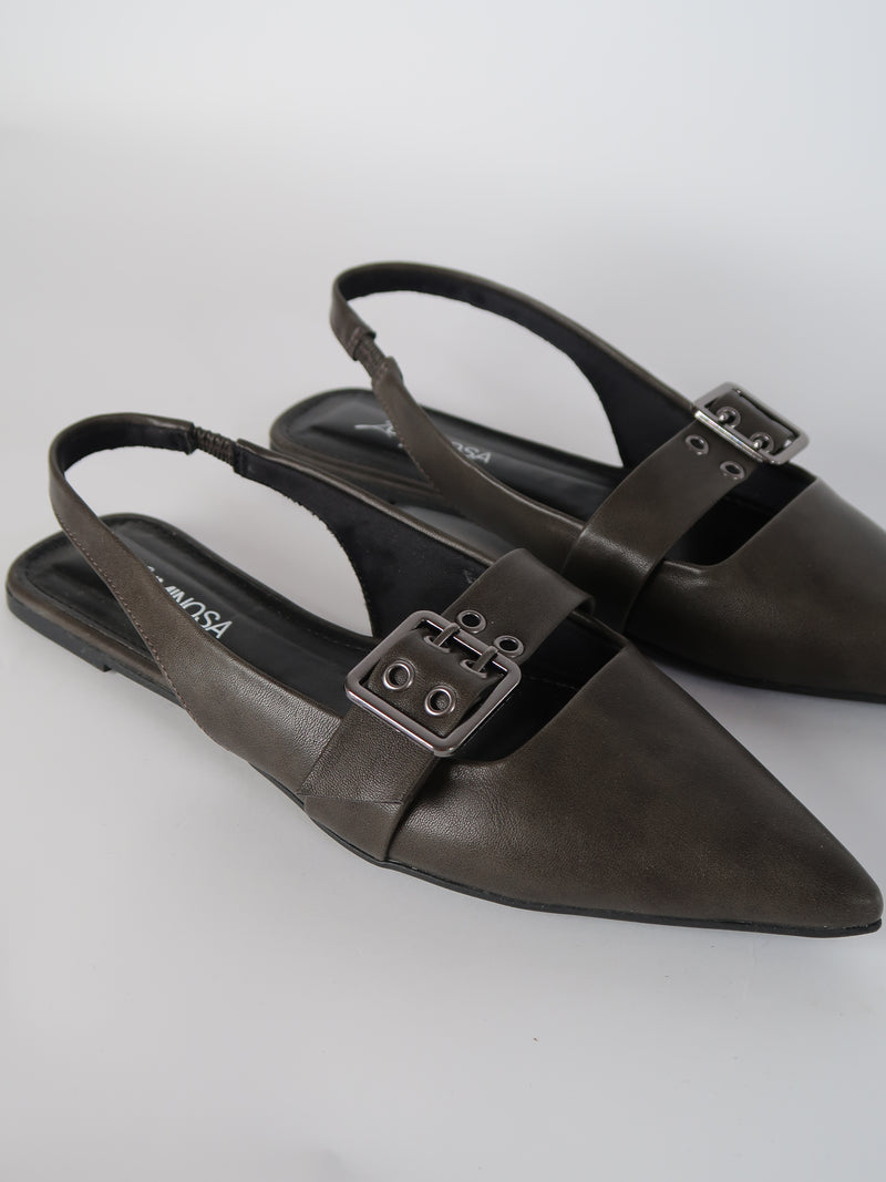 נעלי סירה שטוחות מחודדות מקדימה בגוון אפור כהה; רצועה קדמית עם אבזם כסוף, ורצועה לקרסול עם גומי אלסטי להתאמה מושלמת. מתאימה ליום במשרד או לערב עם ג'ינס – הבחירה האולטימטיבית למראה מחודד ונשי.