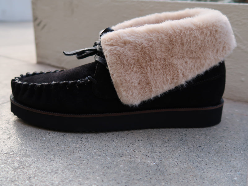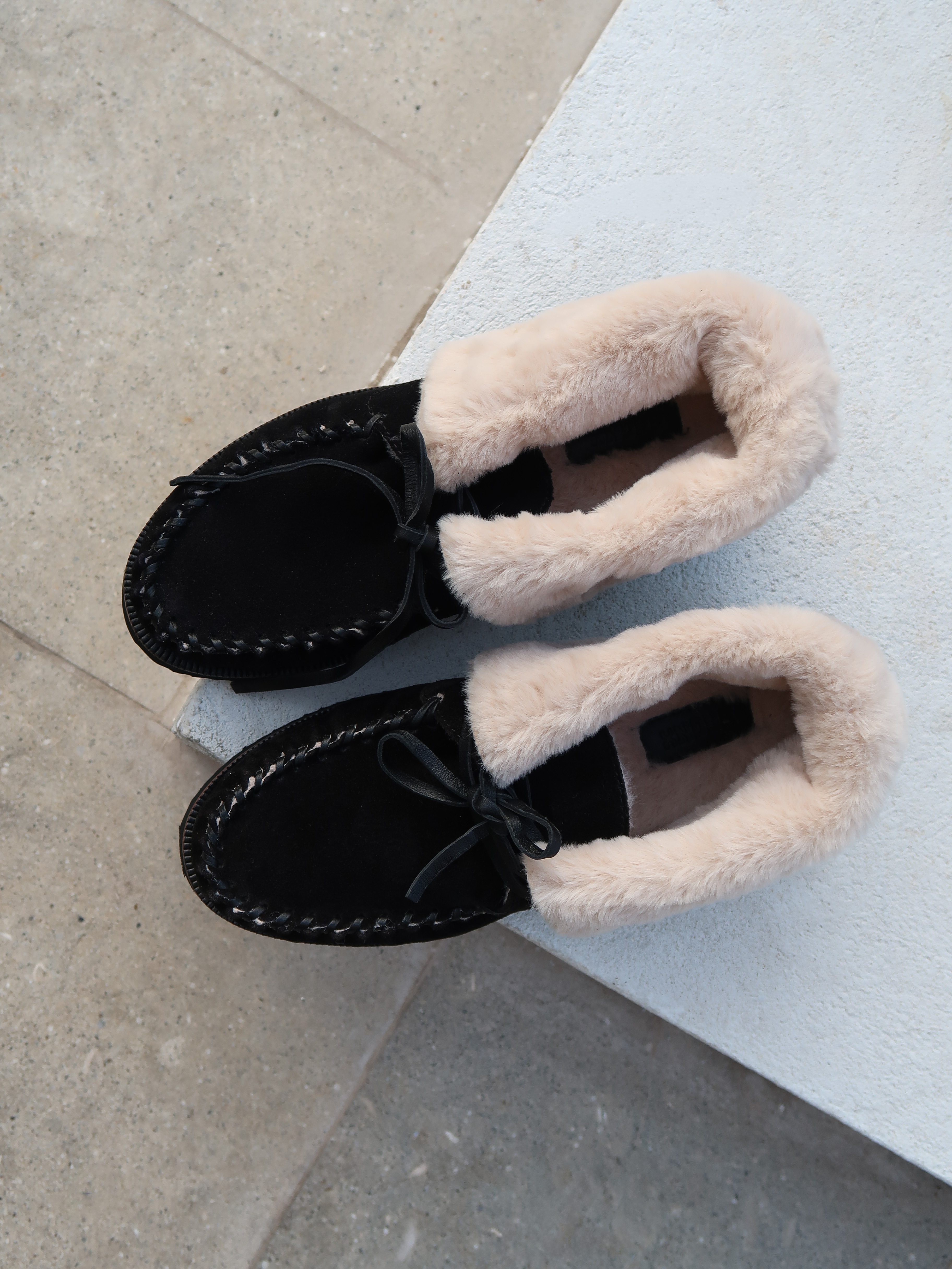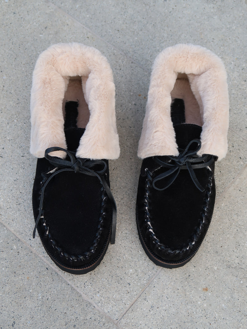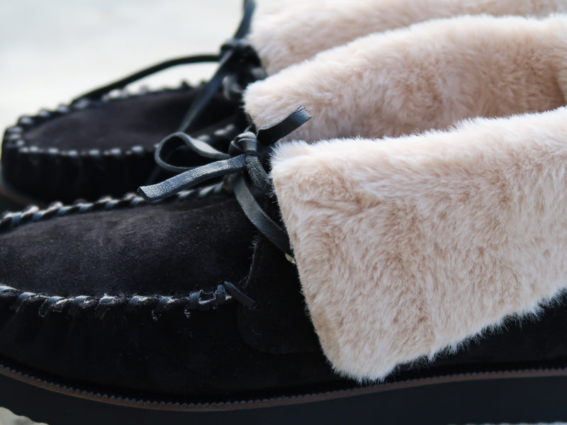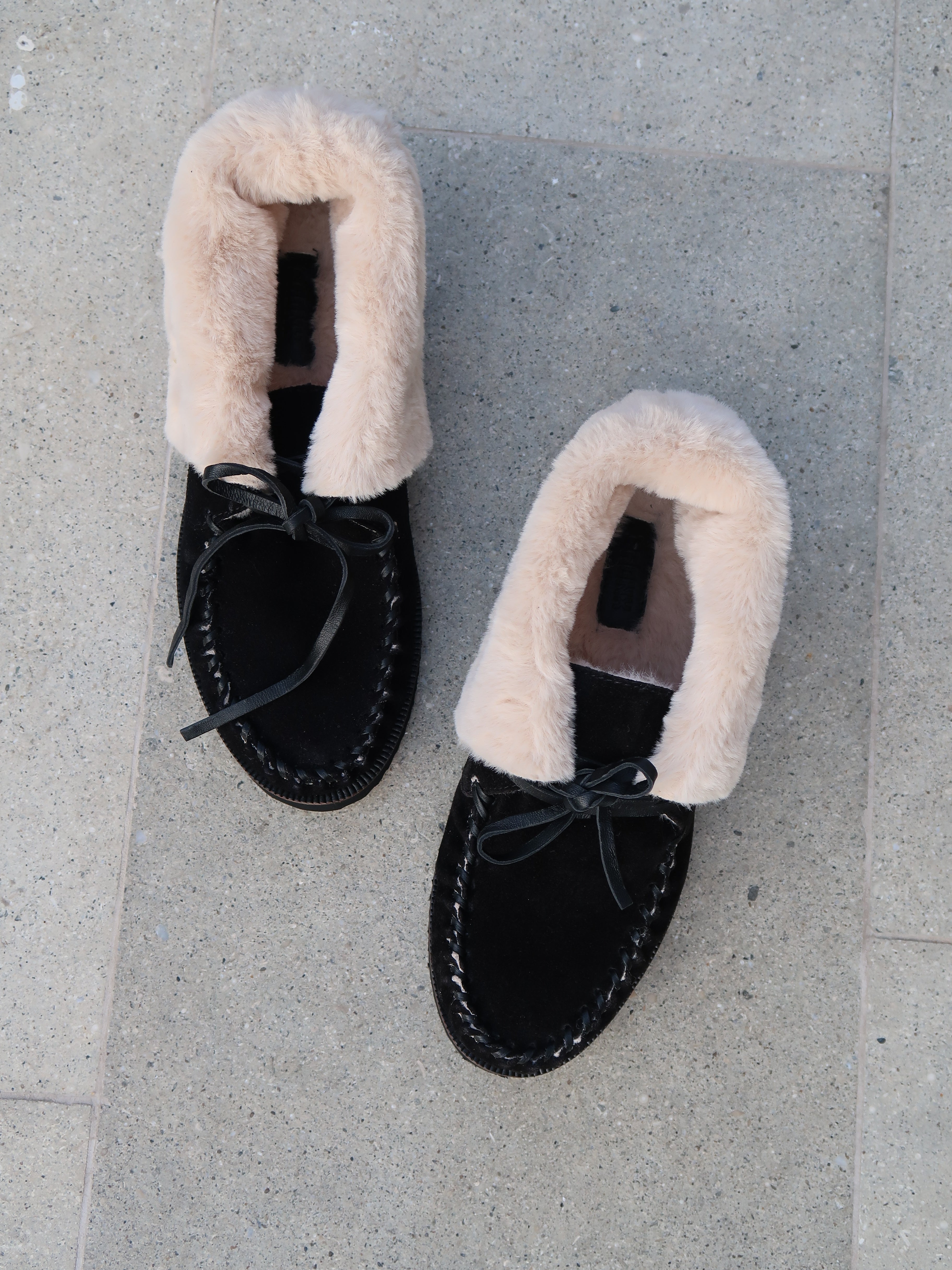 A warm and luxurious moccasin for a perfect winter look. Made of soft black suede with a high-quality white fur trim that folds over the ankle to create a perfect cozy look. The upper features a unique hand stitch, and a flat, comfortable sole for walking on a cold day. This model manages to combine home comfort with urban style – for a huggable winter look, one you won't want to take off.