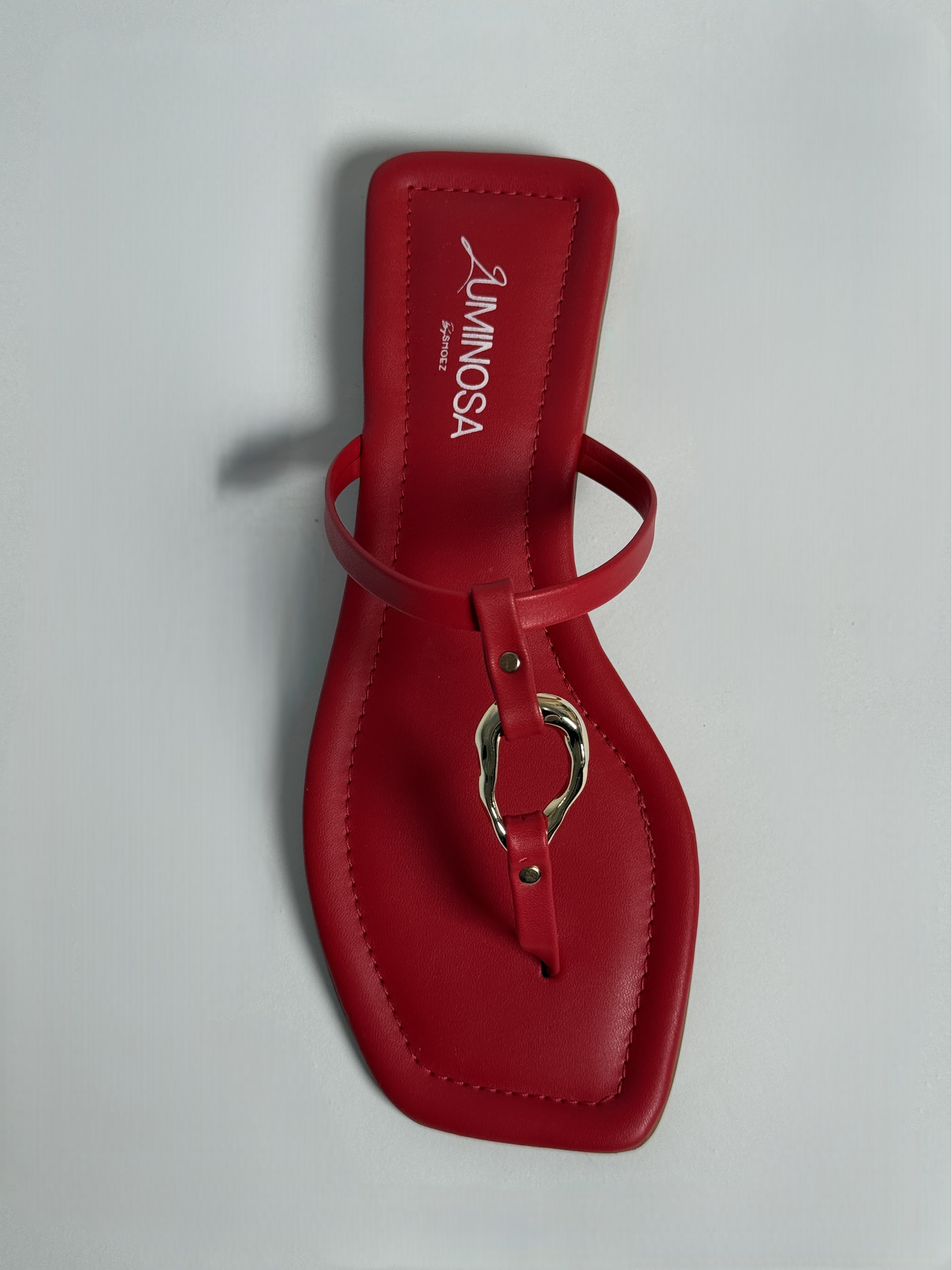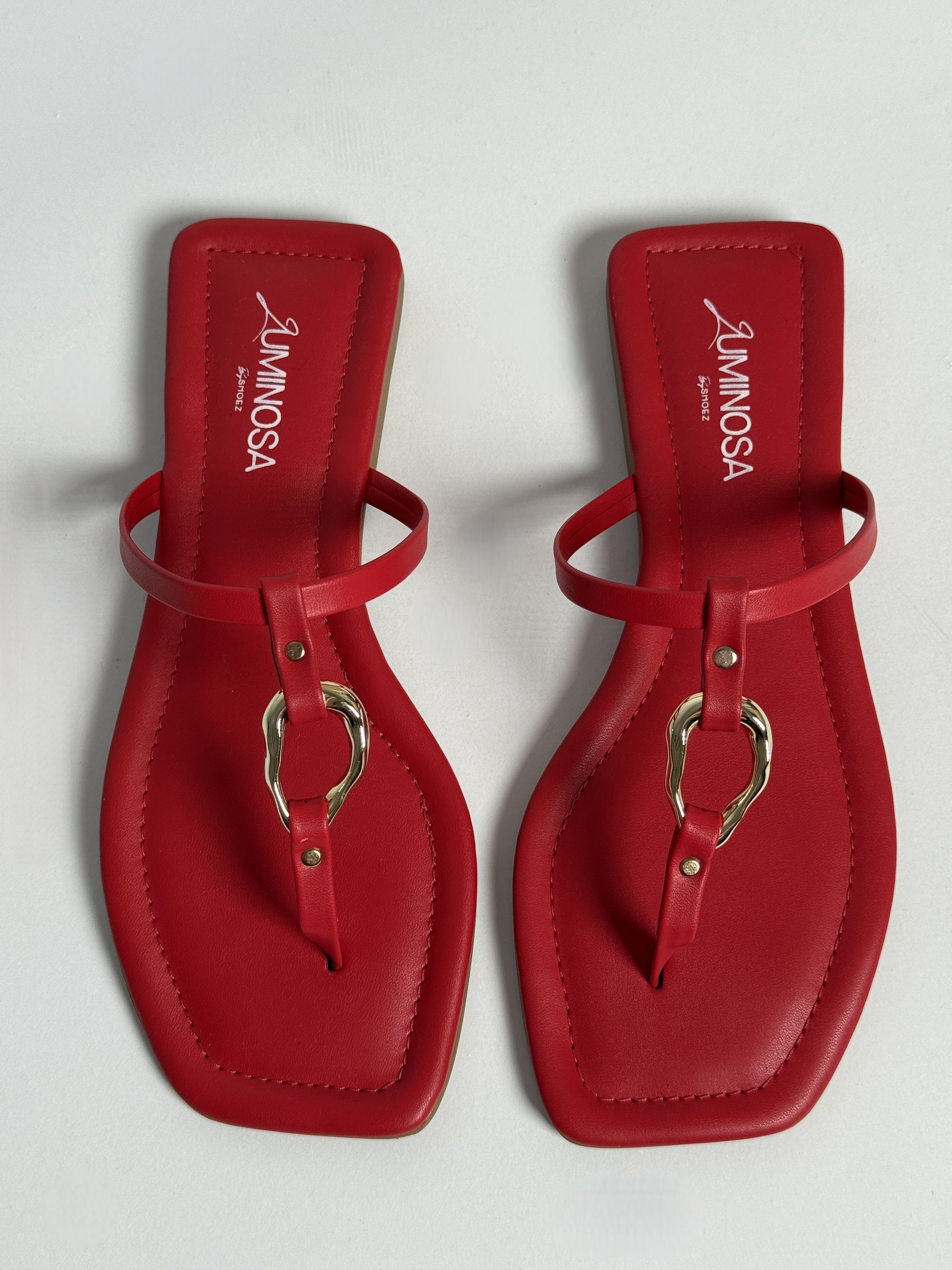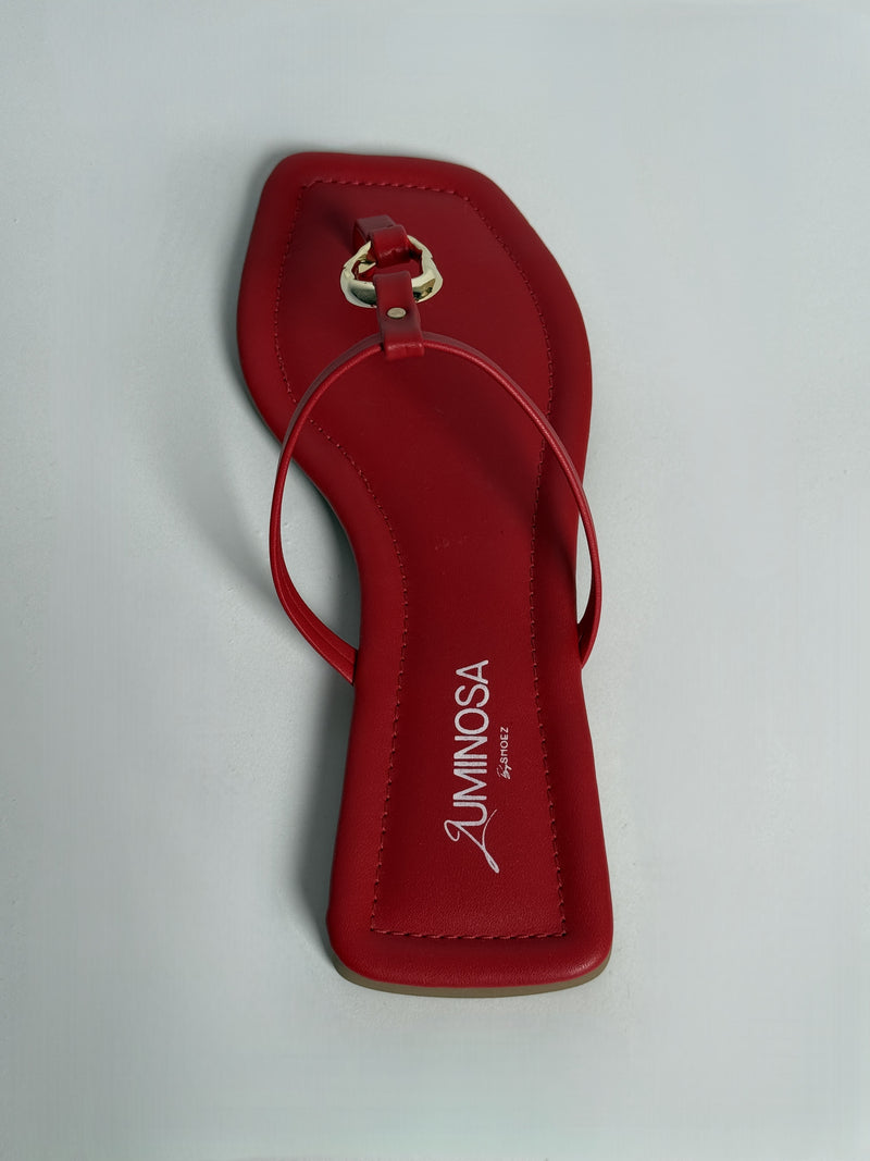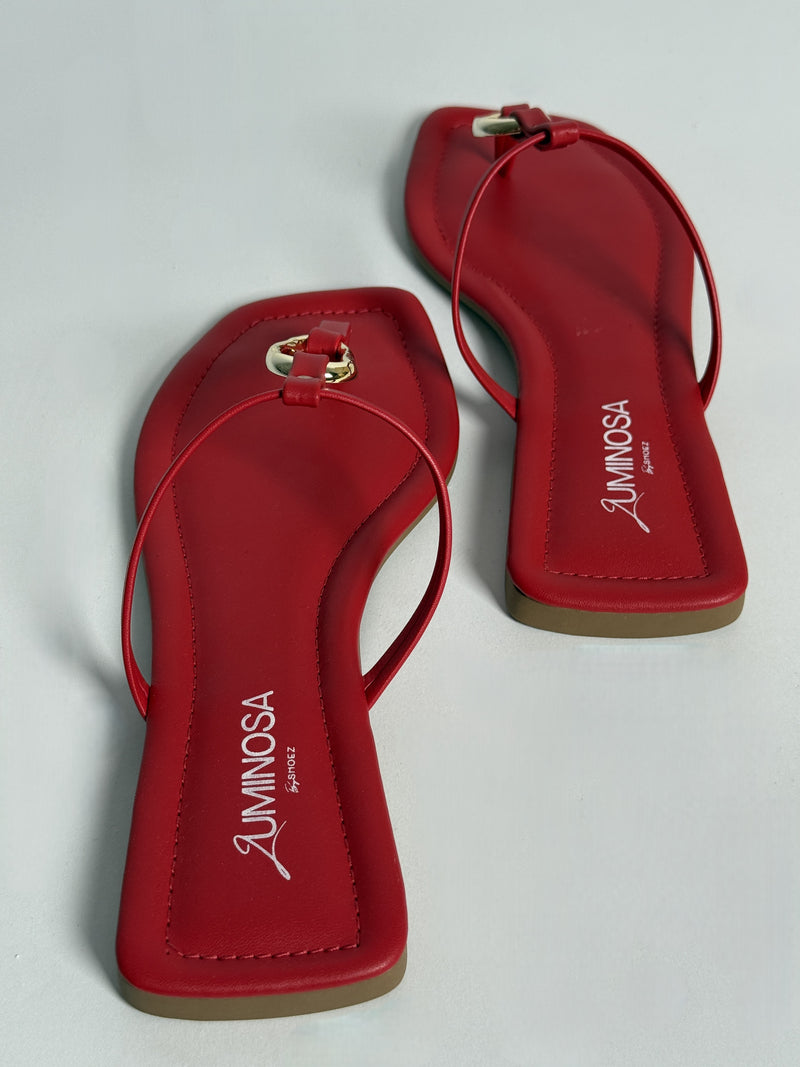 כפכפי אצבע שטוחים בצבע אדום, סיומת מלבנית מלפנים ומאחור, שתי רצועות דקות ובמרכזן אלמנט זהוב אלגנטי לקישוט דגם שמשדרג ברגע את האאוטפיט