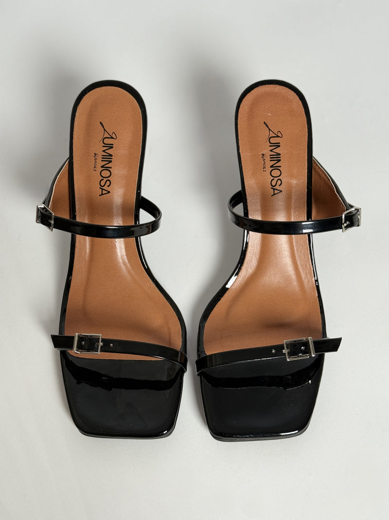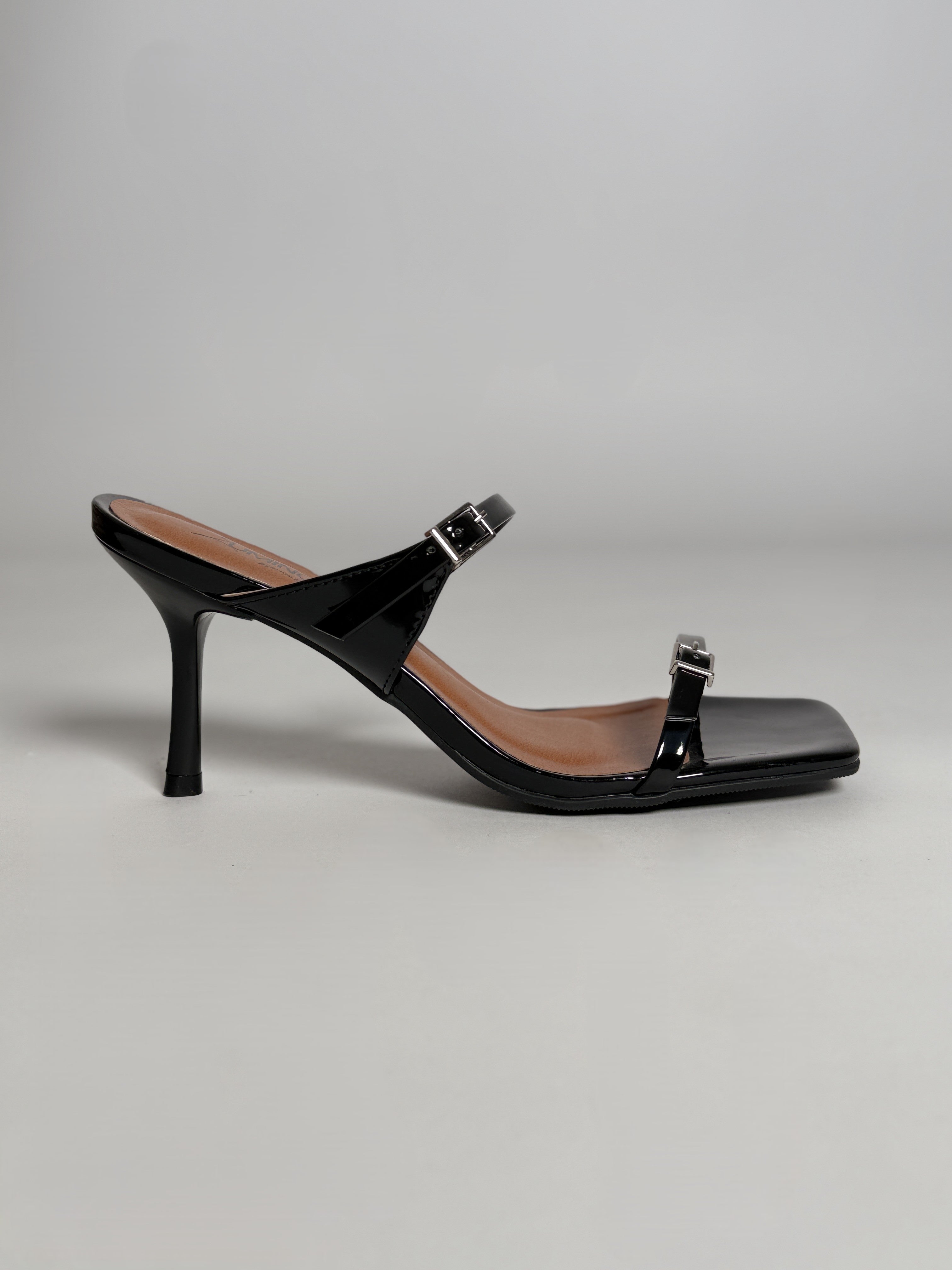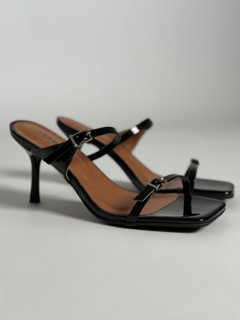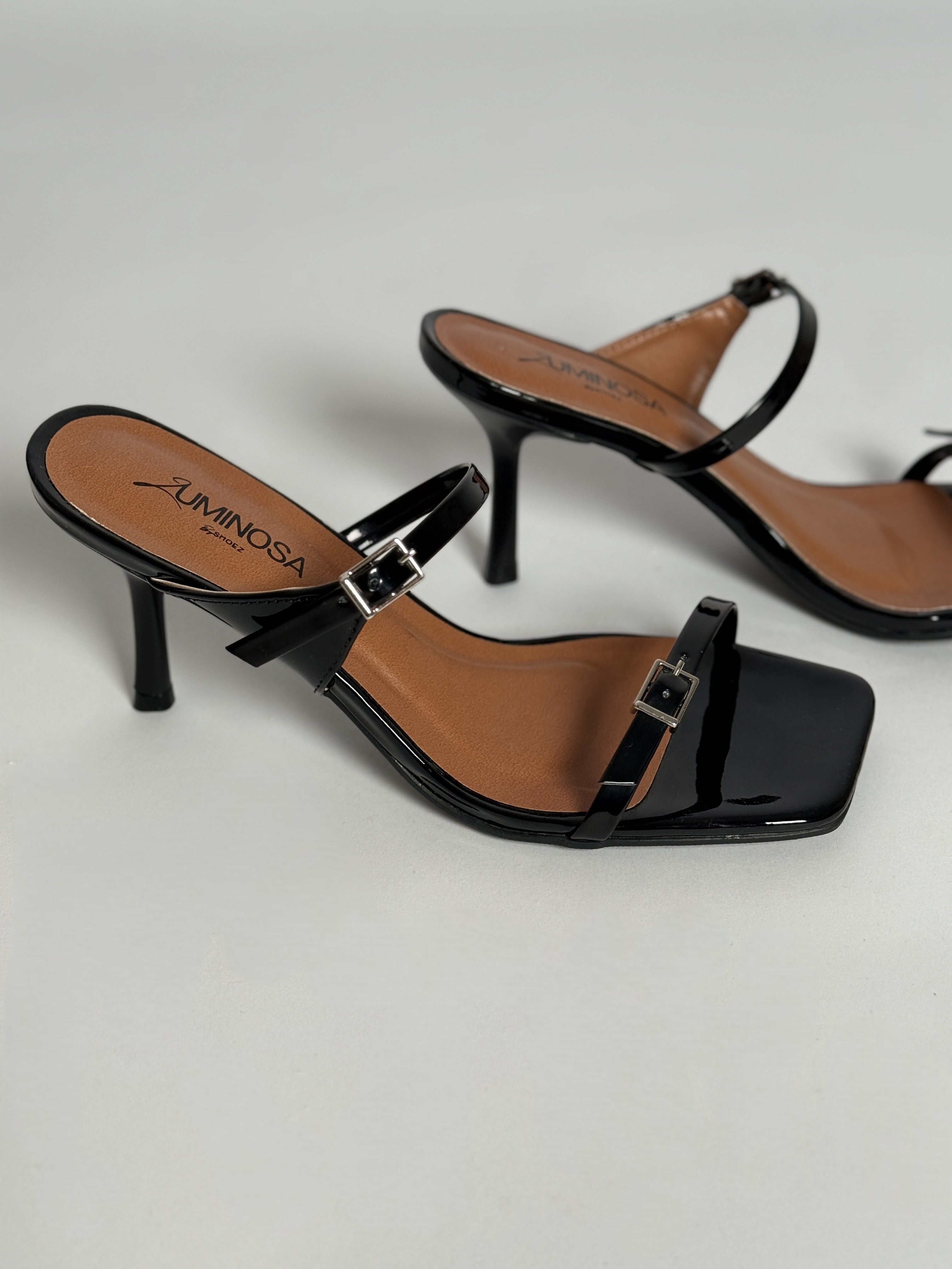 נעלי עקב בצבע שחור בגימור מבריק, עם שתי רצועות דקות מעוצבות ואבזמים קטנים להשלמת הלוק. השילוב בין העיצוב האלגנטי לקווים הנקיים הופך אותן לפריט חובה לכל אירוע.