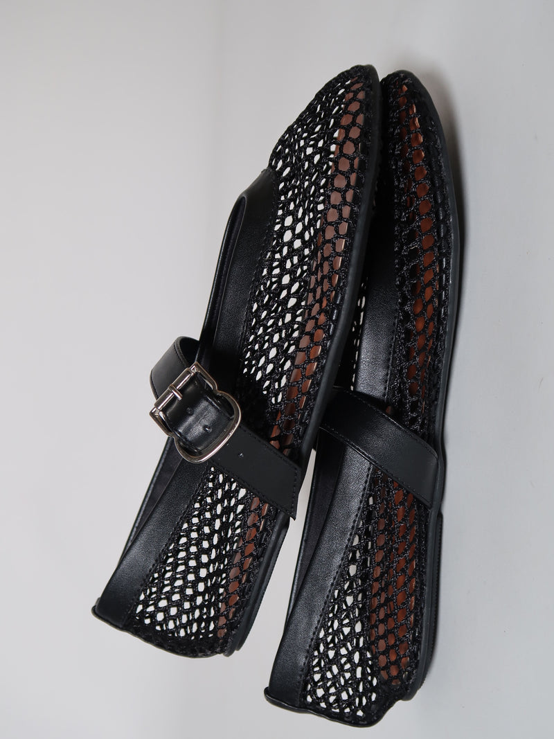 נעלי בובה בצבע שחור, עשויות מרשת אוורירית המעניקה מראה קליל. רצועת אבזם מתכווננת המבטיחה התאמה מושלמת. חזית מעוגלת וסוליה שטוחה לנוחות מקסימלית