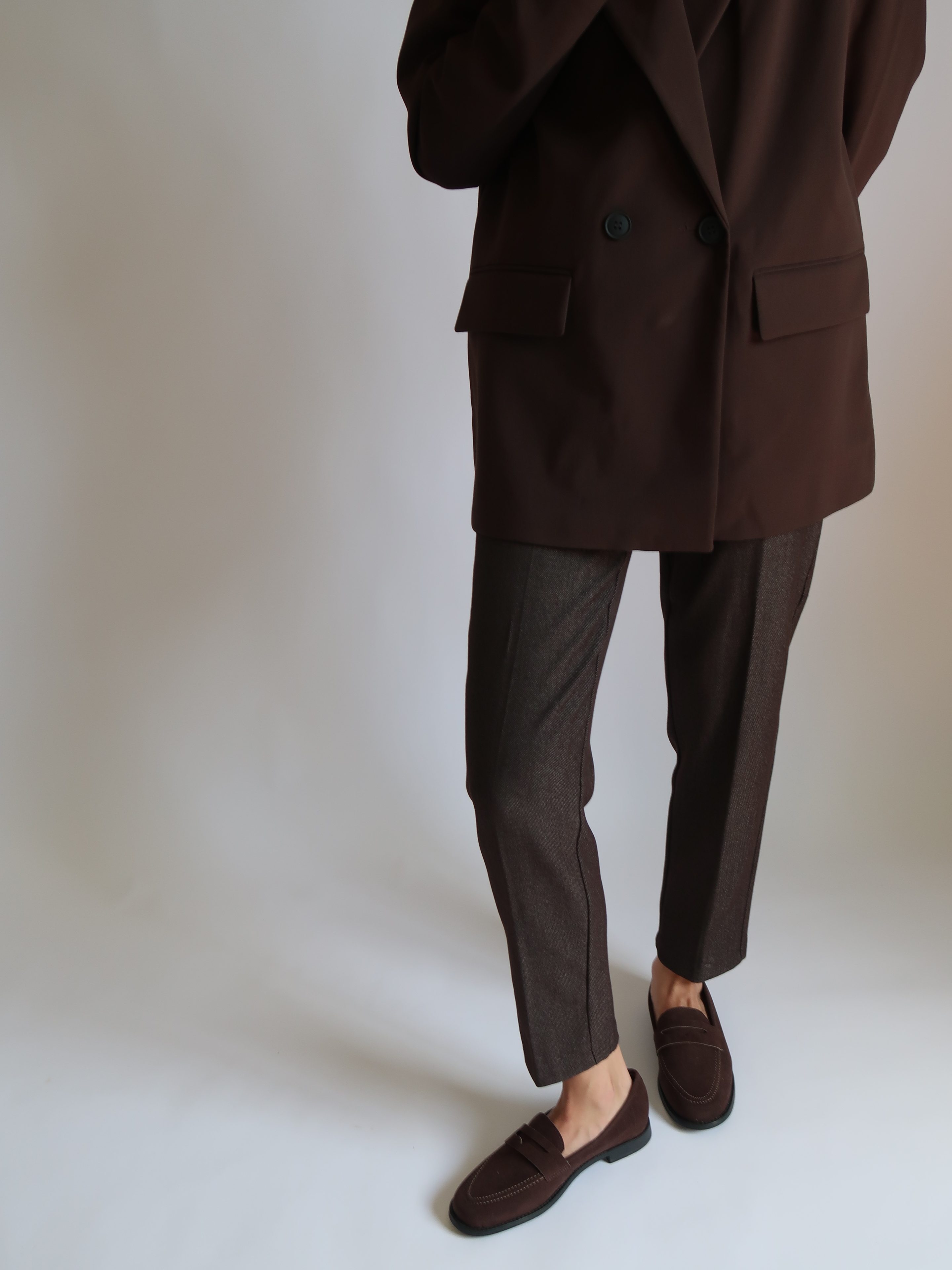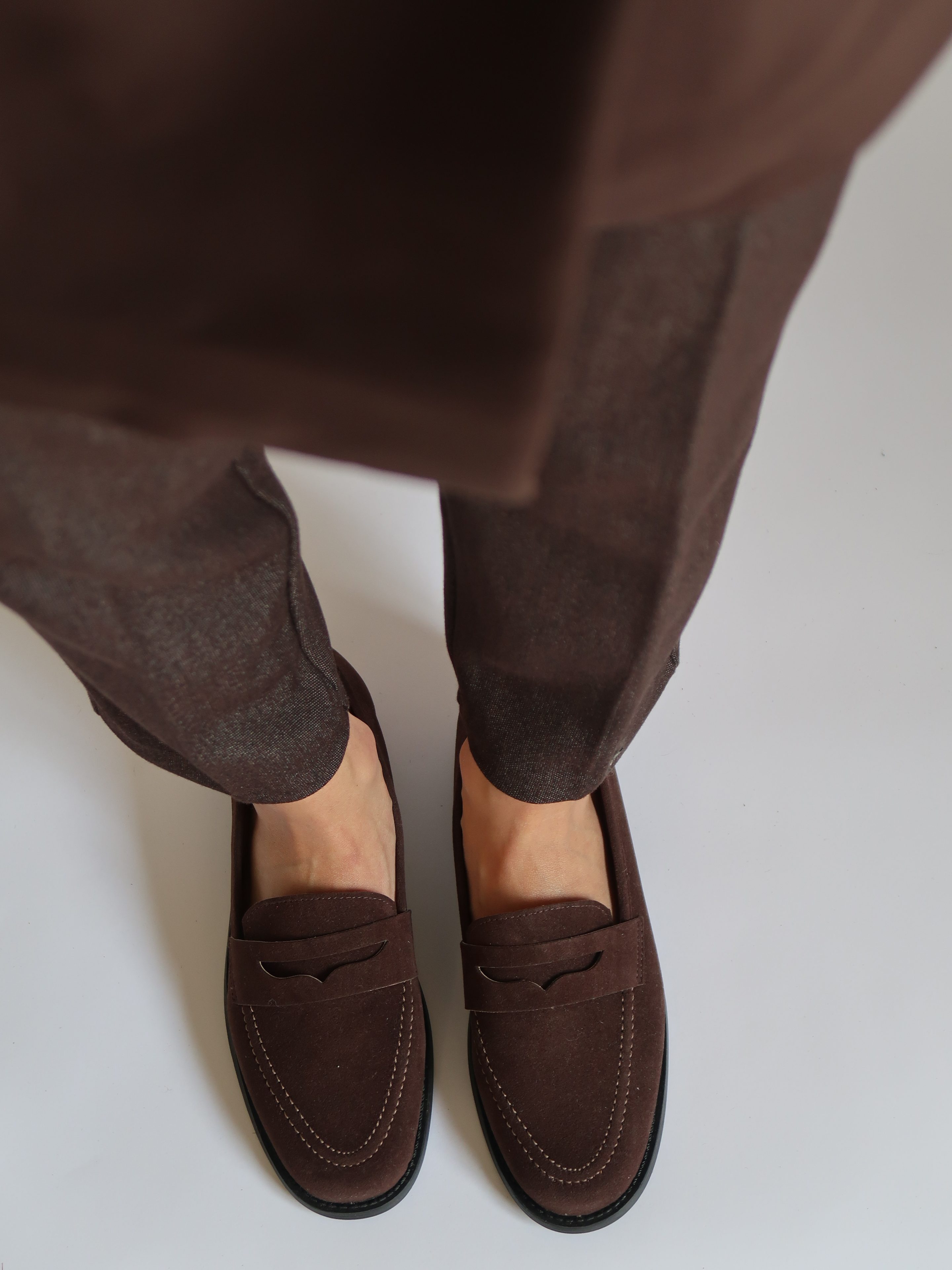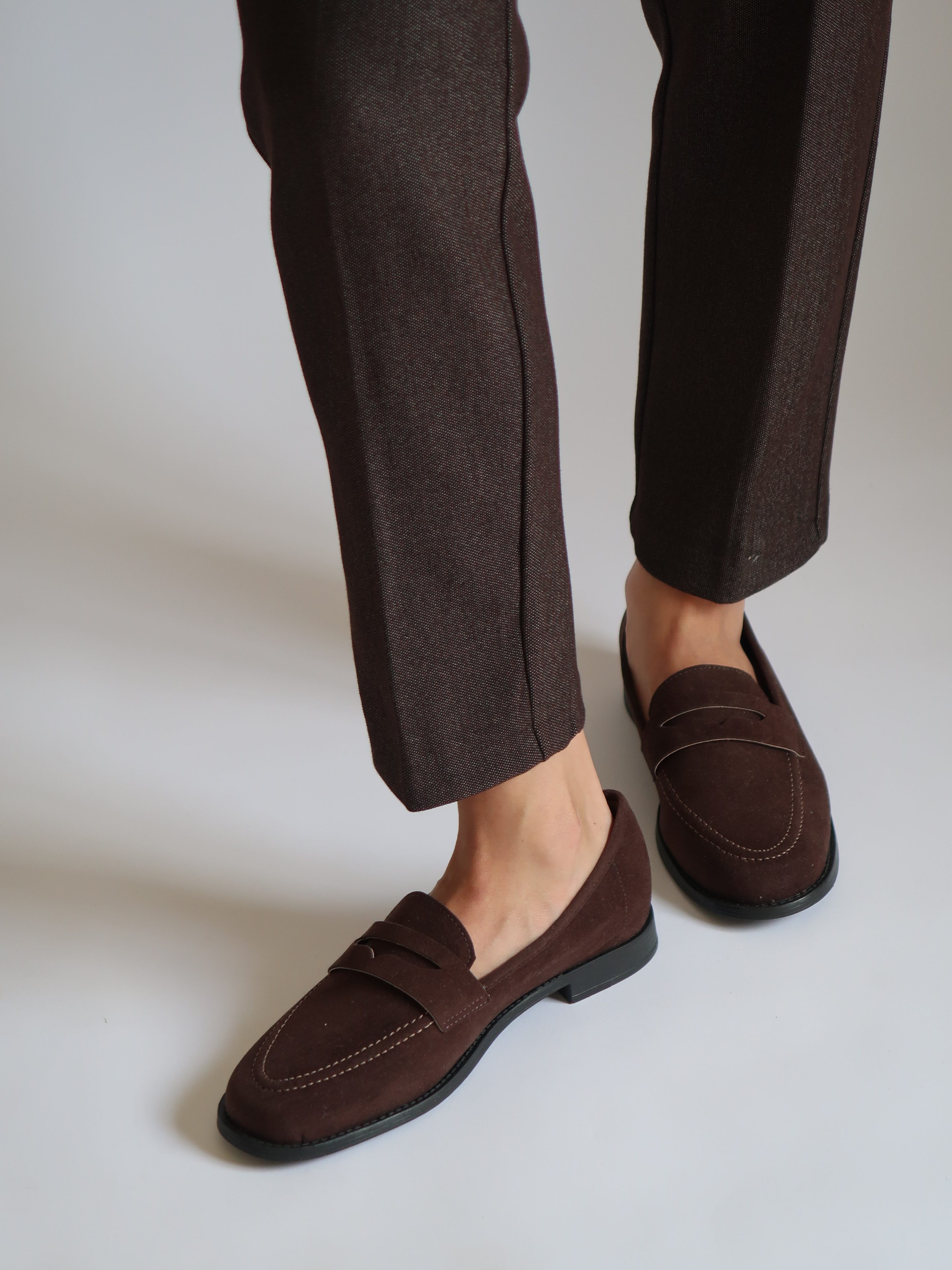 נעלי אוקספורד בגוון חום כהה בטקסטורת זמש, בגזרה קלאסית על-זמנית. מעוגלים מקדימה עם תיפור בהיר ורצועה רוחבית בצבע תואם; סוליה קלה בצבע שחור. דגם ורסטילי שמתאים גם ליום עבודה ייצוגי וגם ללוק ערב אלגנטי.