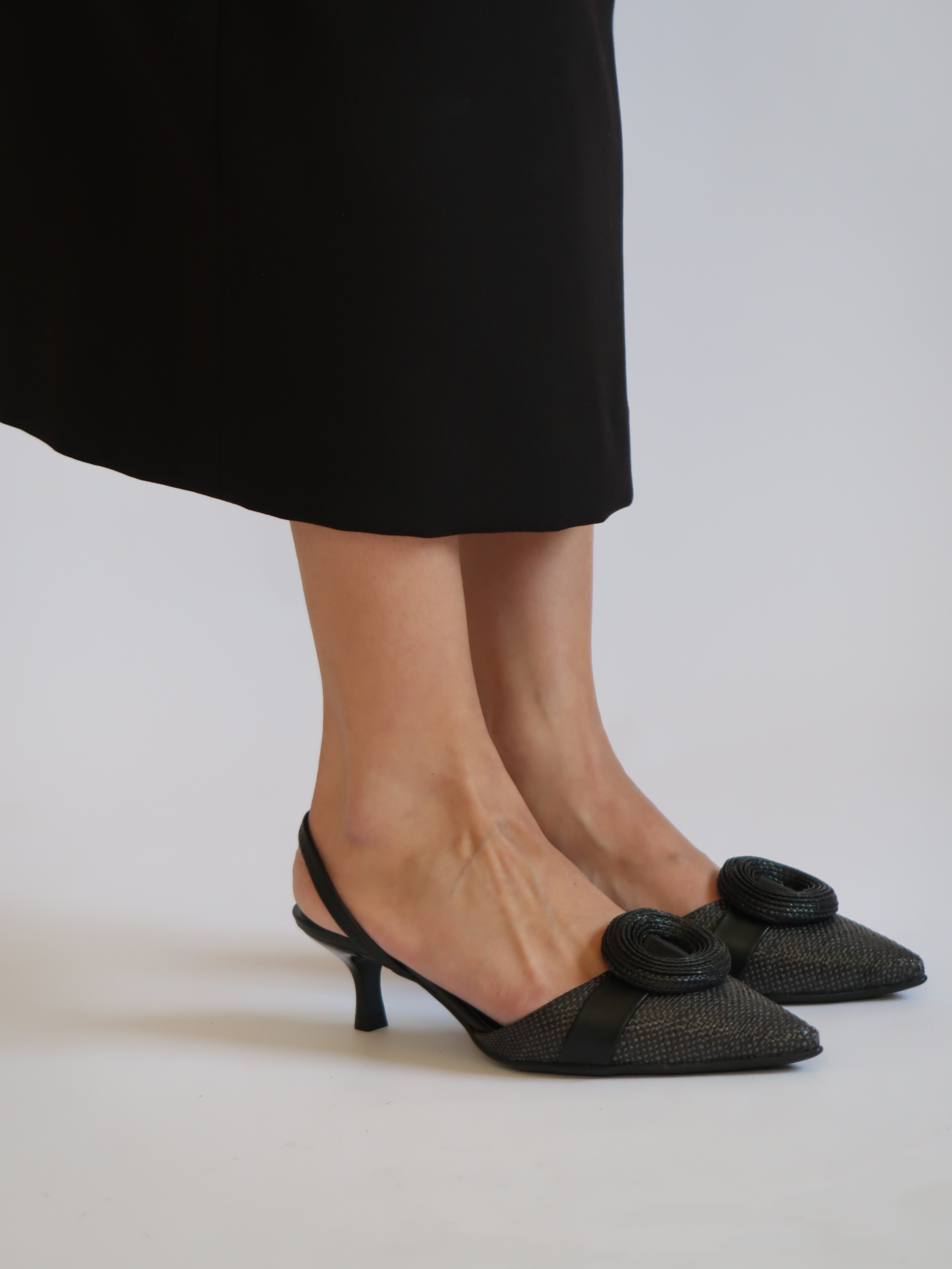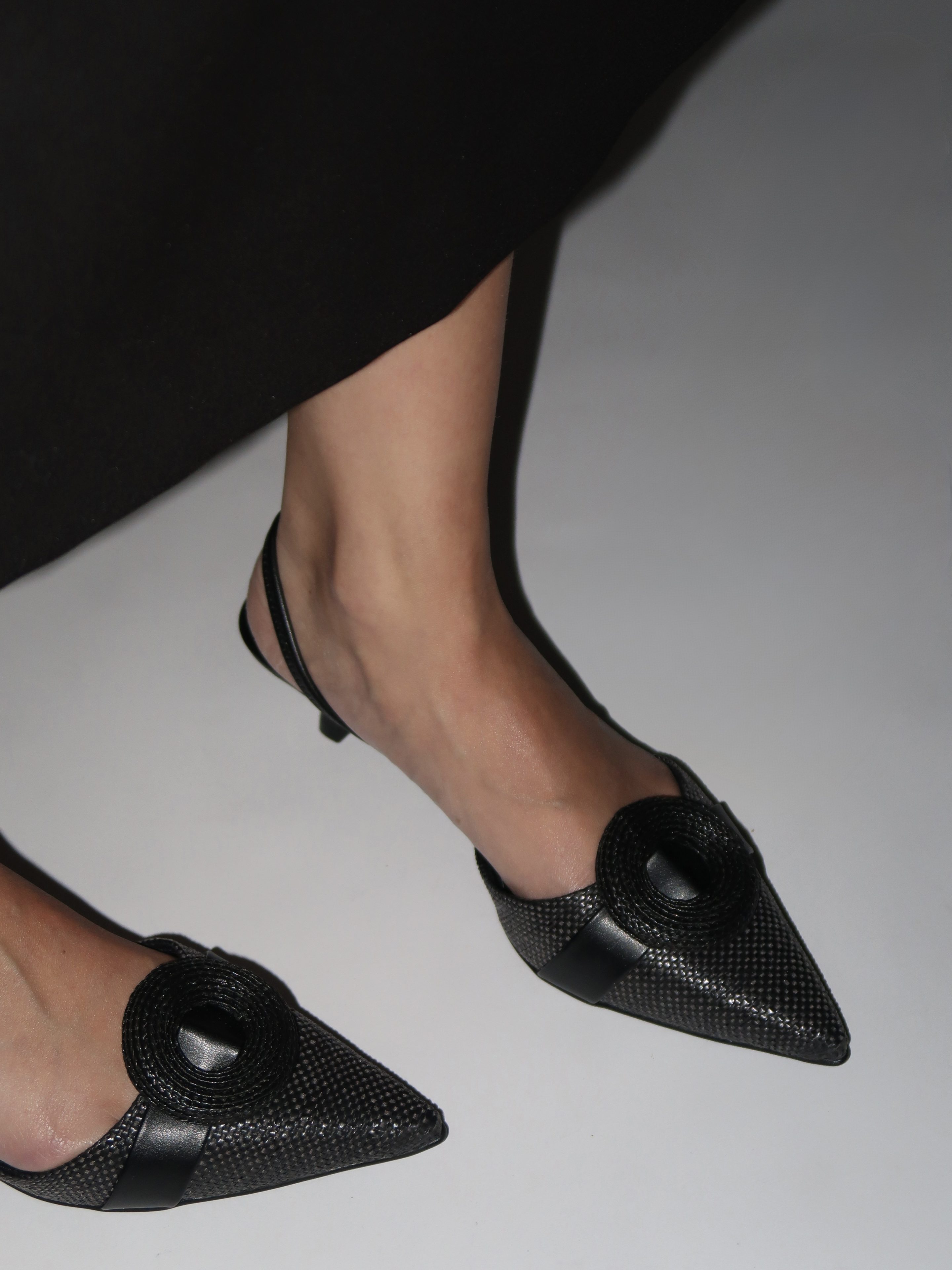 נעלי סירה שחורות מחודדות עם רצועת Slingback אלגנטית מאחור, בעיצוב טקסטורה עדינה של ראטן. החזית מעוטרת באלמנט עגול שזור ומרשים, שמוסיף טאץ’ ייחודי ללוק. עקב קטן ונוח לשימוש יומיומי או לאירועים. שילוב מושלם בין קלאסיות לבין אמירה אופנתית.
