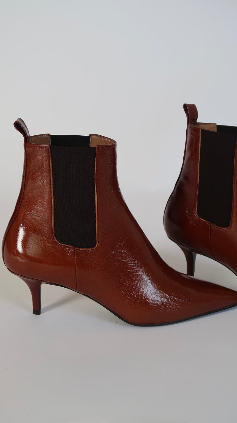 מגפונים בגובה קרסול מעור רך בגוון חום עשיר בגימור מבריק, עם גומי צדדי ולולאת אחיזה לנעילה קלה ונוחה. החוד המעוצב והעקב הדק יוצרים קווים נקיים ומדויקים, והגזרה הקצרה מעניקה מראה אלגנטי וקליל שמתאים גם ליום וגם לערב.