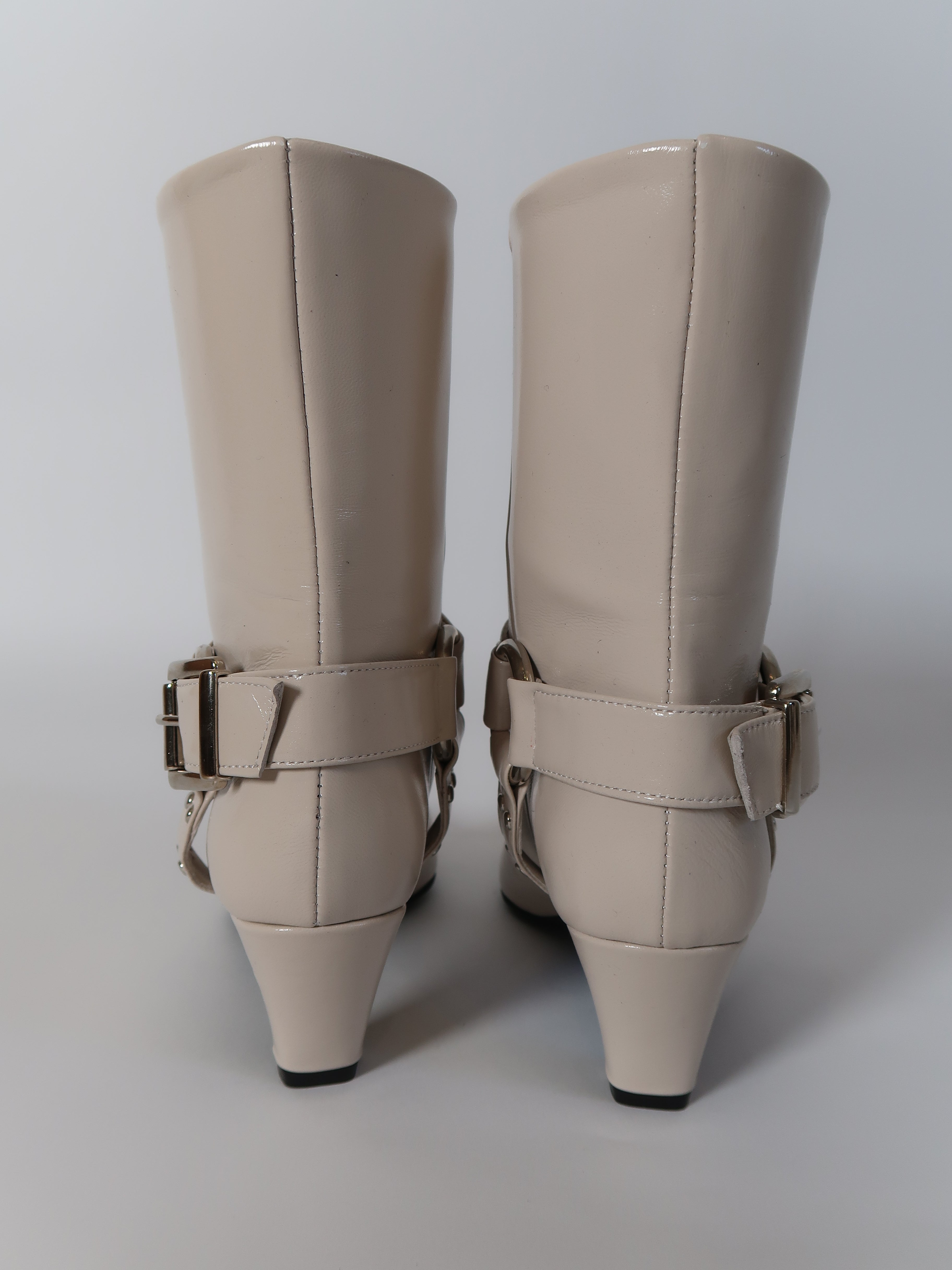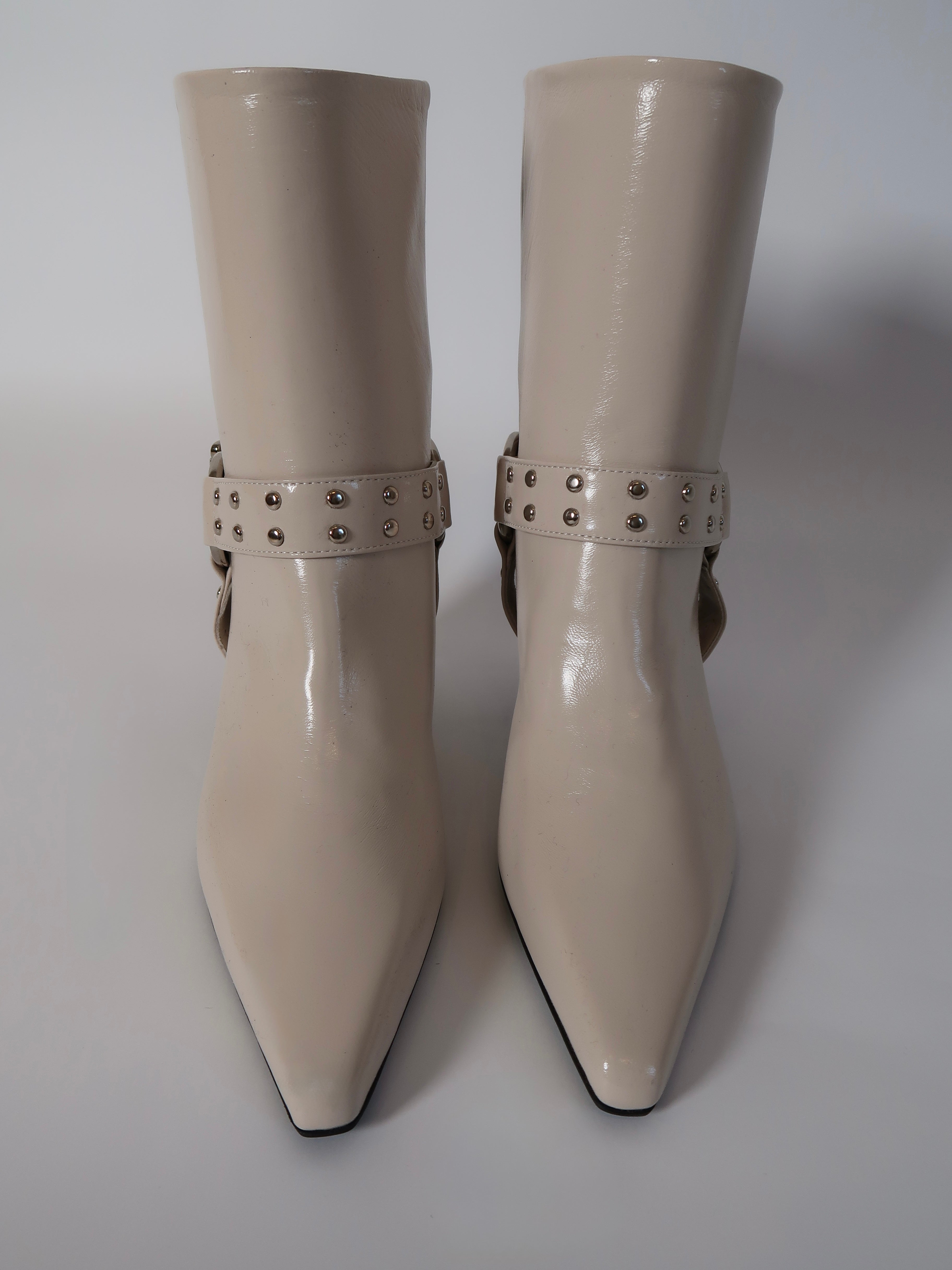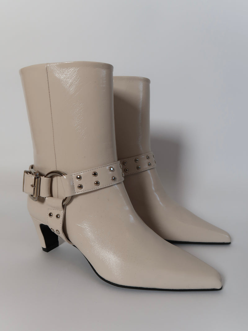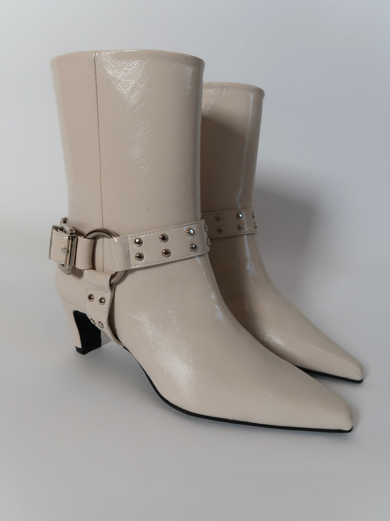 מגפונים מעור בגוון קרם בגימור מבריק. גזרה מחודדת עם רצועת אבזם רחבה ועיטורי ניטים כסופים בסגנון בוקרים. עקב מדויק וקלאסי שמוסיף מראה חד בלי להתאמץ. שילוב של רוק-שיק אלגנטי וקו נקי — מושלם לאאוטפיטים שמבקשים נוכחות מדויקת.
