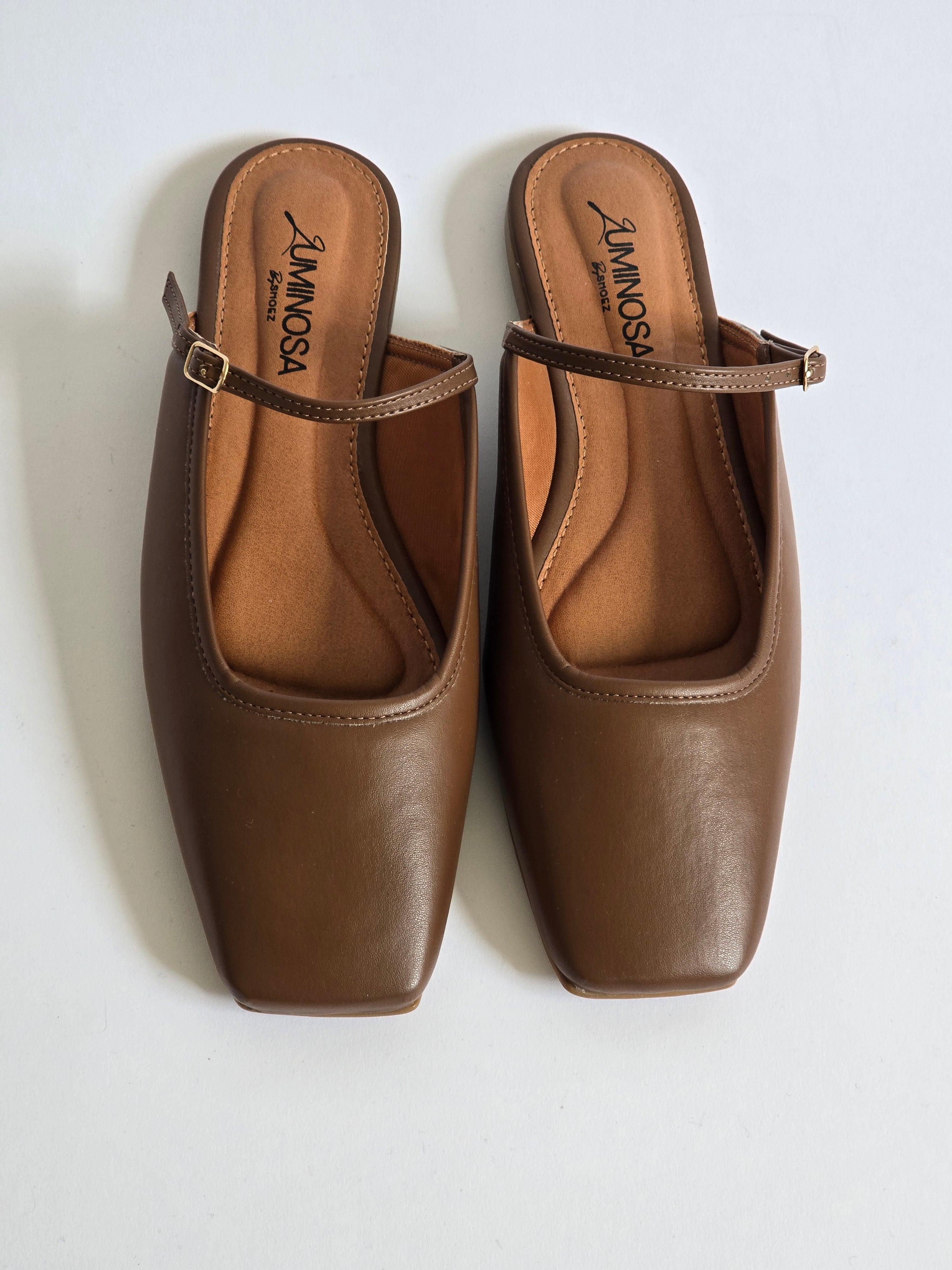 נעלי סירה שטוחות בצבע חום עם מפתח מלבני פתוחות מאחורה, רצועה לרוחב הרגל עם אבזם זהוב . שילוב בין נוחות לסטייל אורבני – מושלם למראה יומיומי מתוחכם או ללוק ערב קליל.
