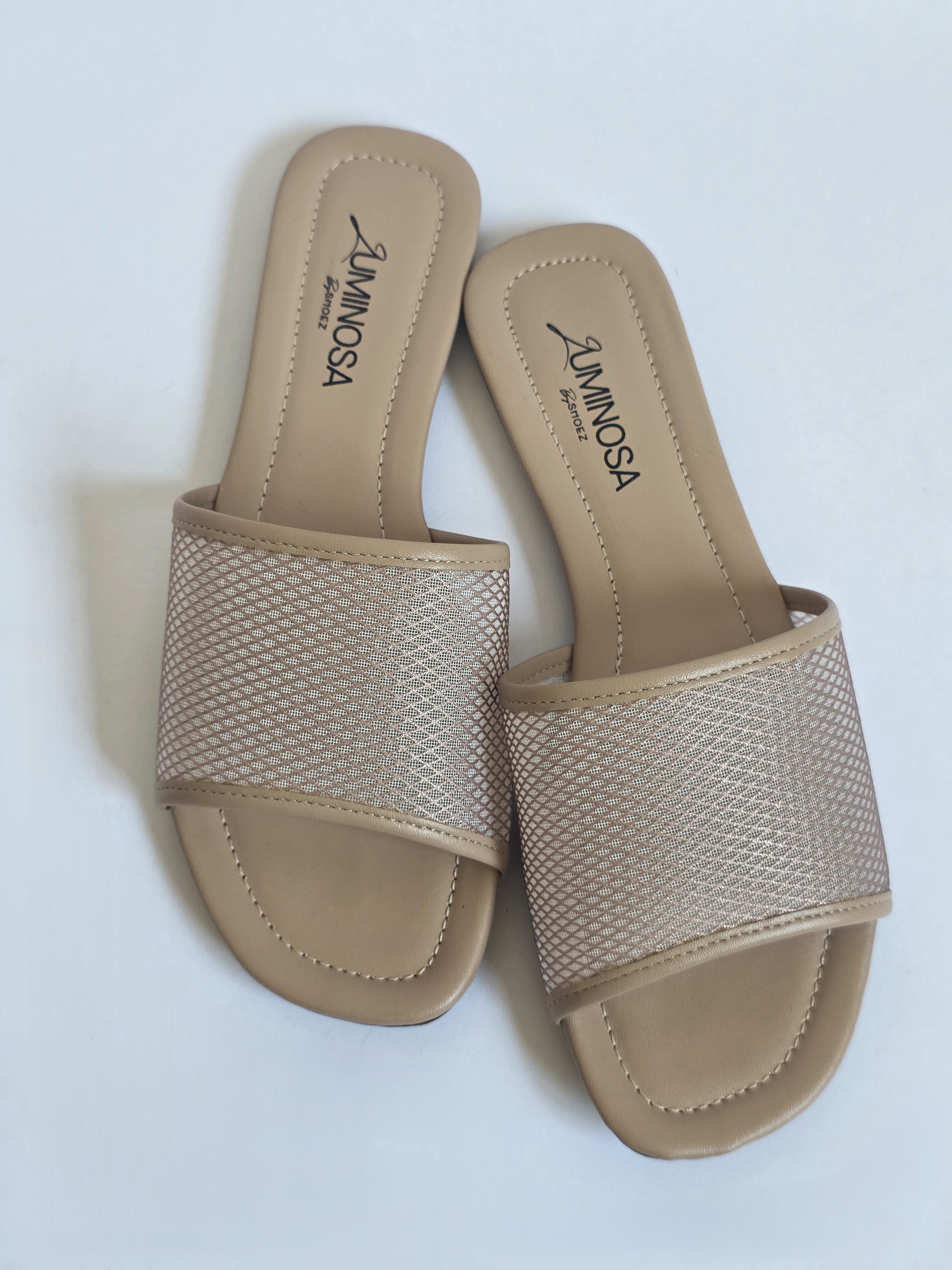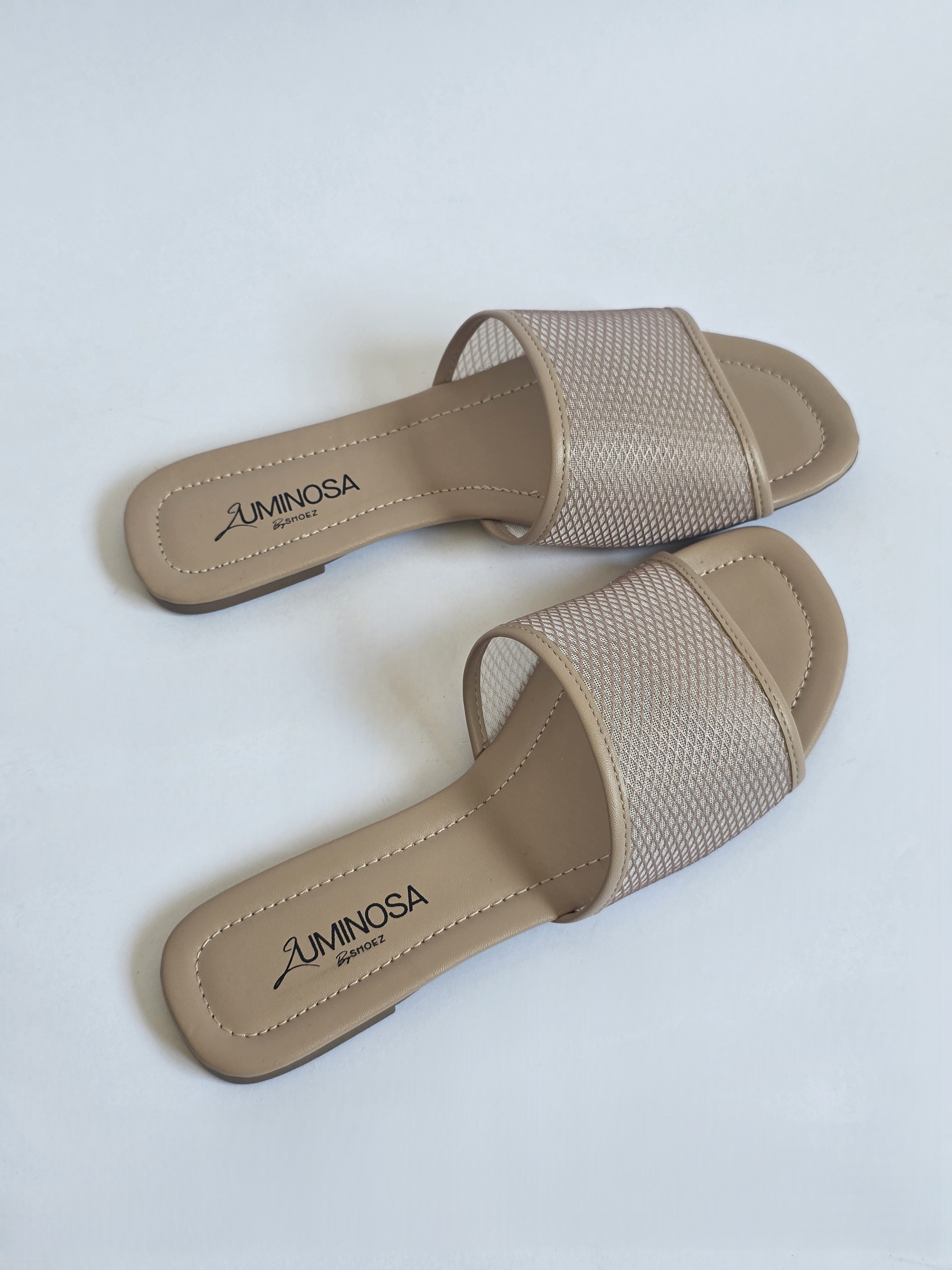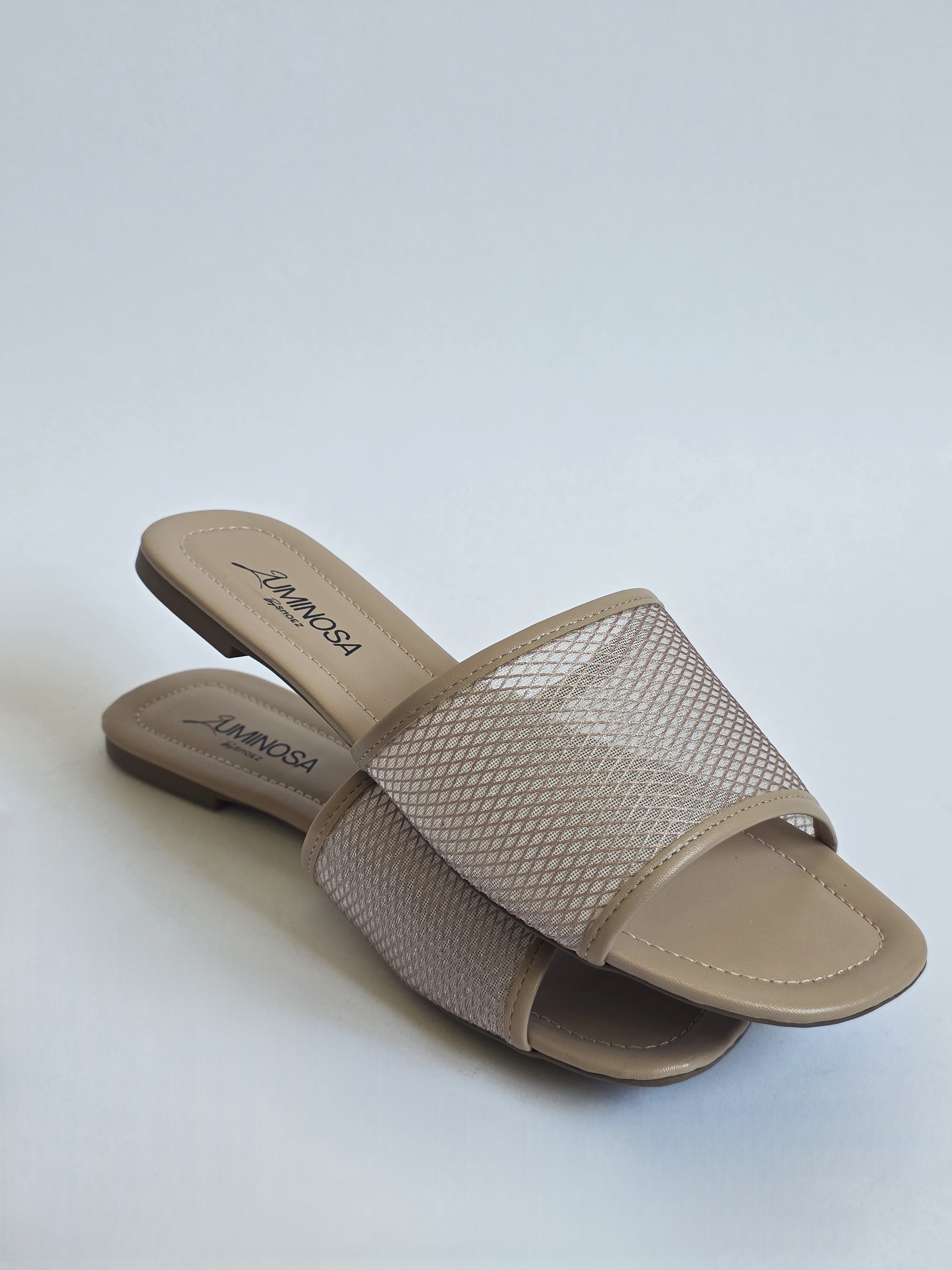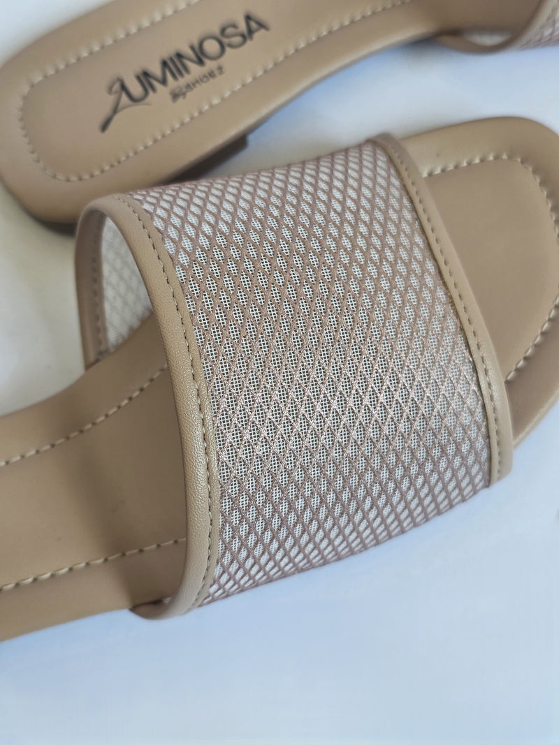 כפכפים שטוחים בגוון ניוד עם רצועה קדמית רחבה מרשת שקפקפה; סוליה רכה ושטוחה, מושלמות לשימוש יום- יומי