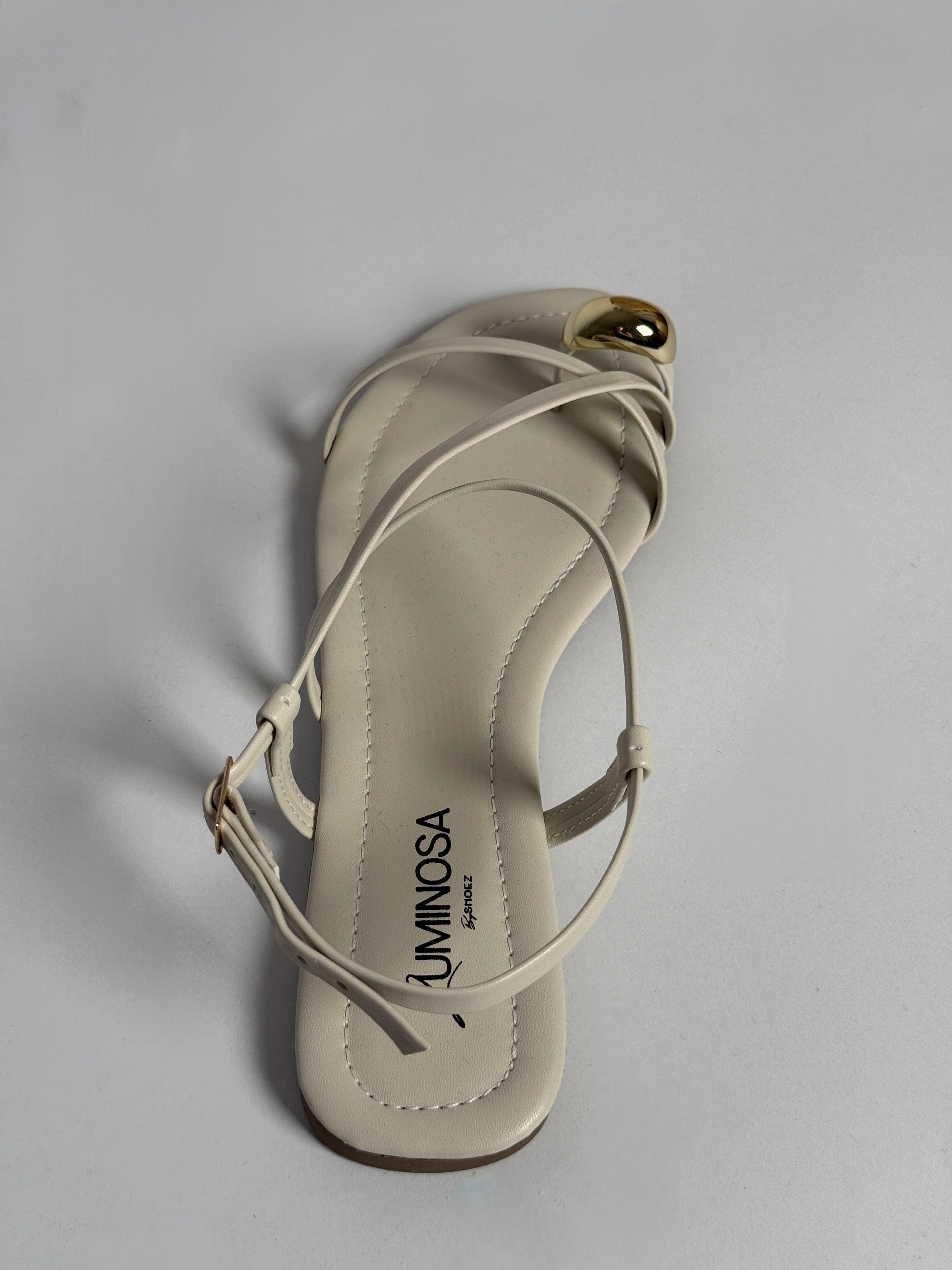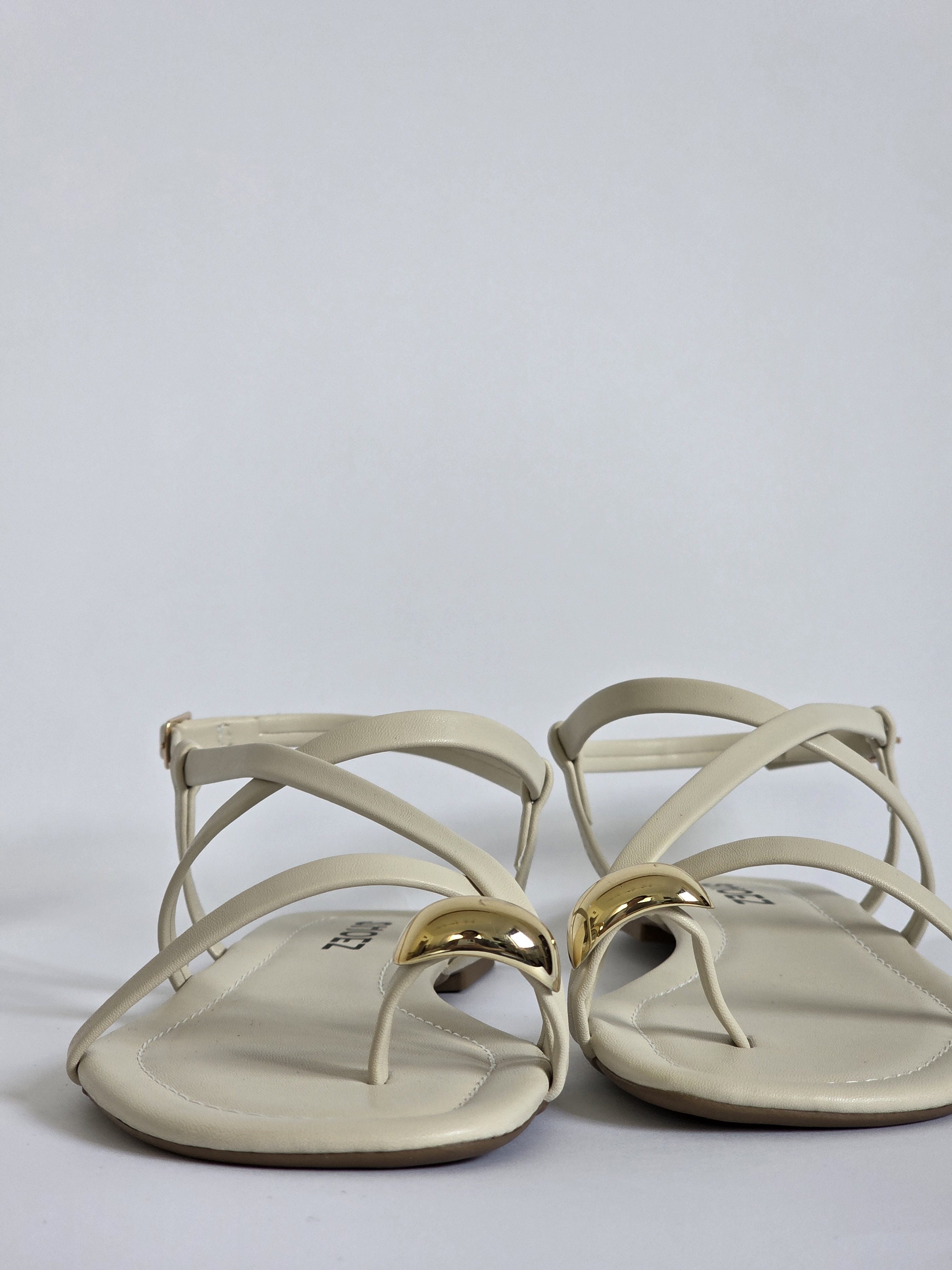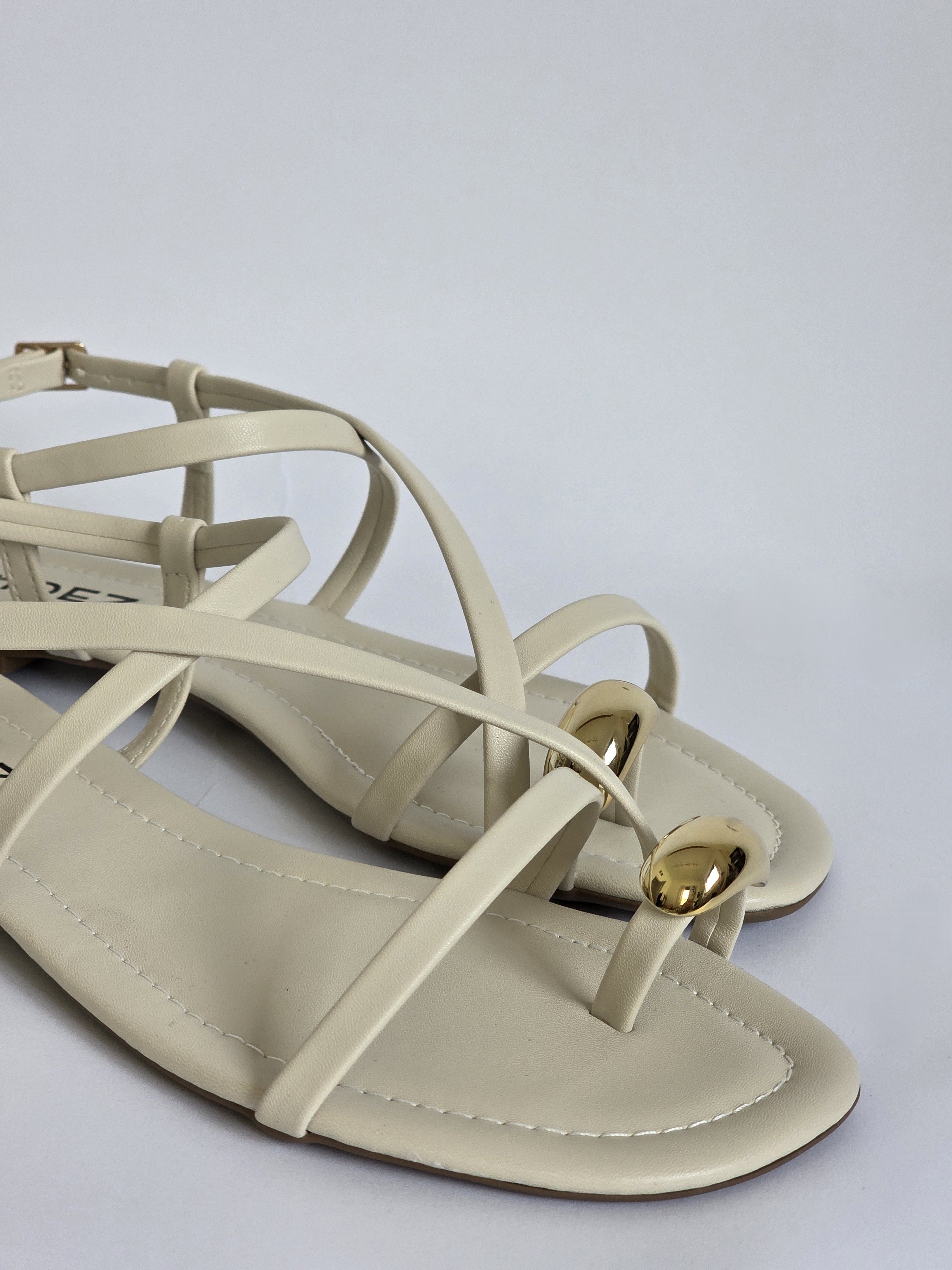 סנדלי אצבע שטוחים בצבע שמנת עם רצועות דקות בעיצוב מינימליסטי ונקי ועיטור מתכת ייחודי זהוב ואלגנטי על הבוהן. הרצועה האחורית כוללת אבזם מתכוונן לנוחות והתאמה מושלמת. אידיאליים לשימוש יומיומי ולמראה קייצי ואלגנטי *דגם קל וגמיש במיוחד