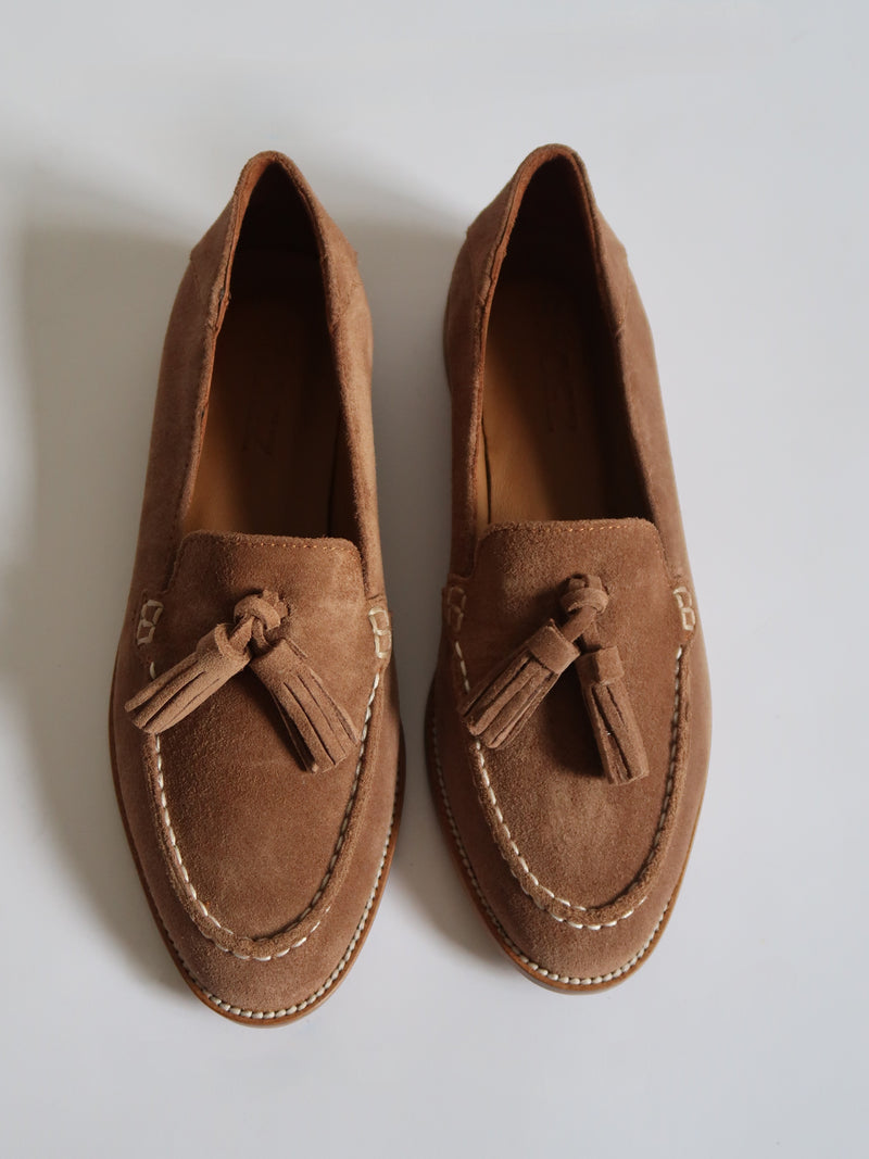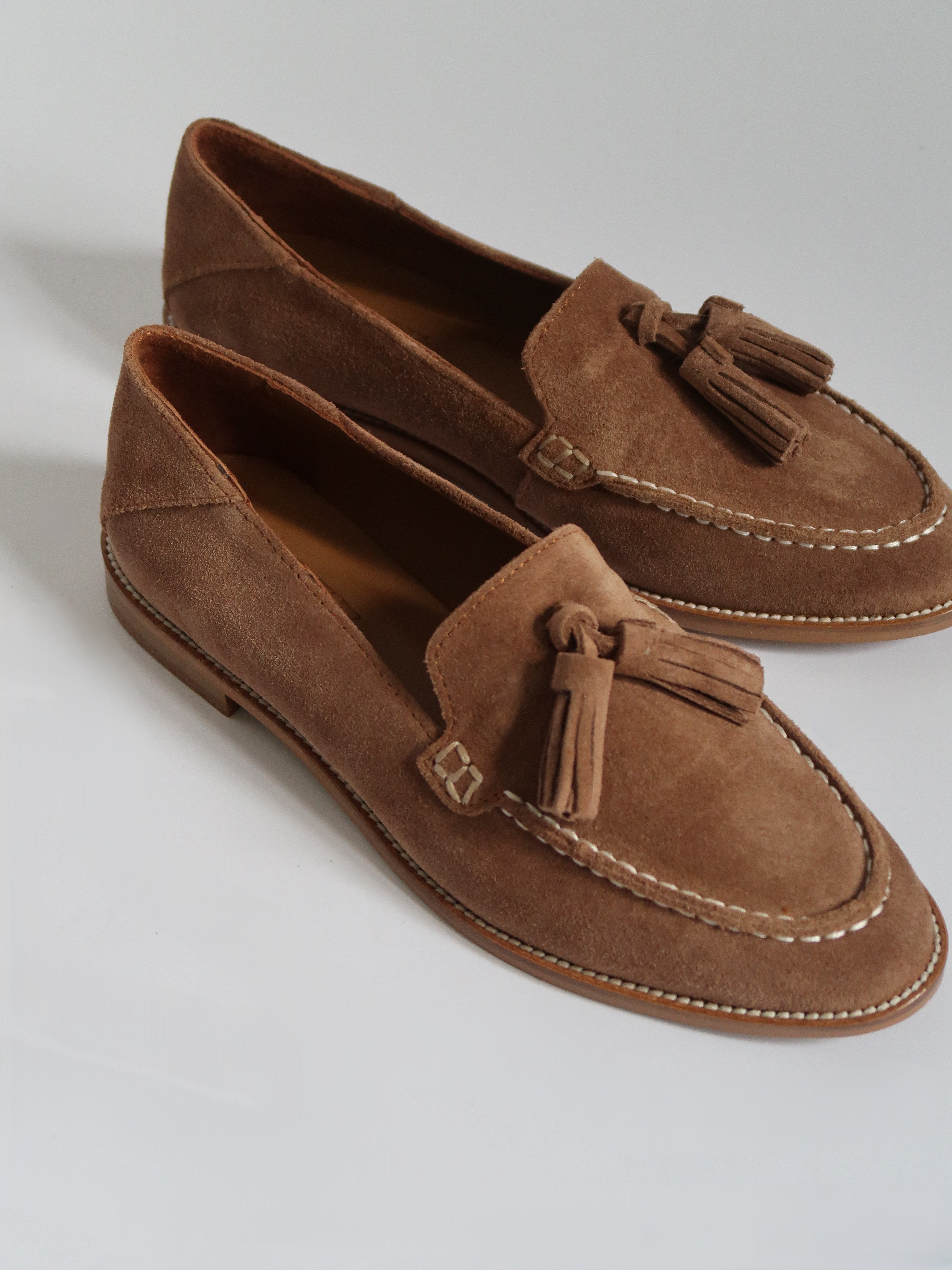 מוקסינים שטוחים מזמש רך בגוון קאמל, בעיצוב קלאסי ומינימליסטי שמשדר אלגנטיות נינוחה. בחזית - קישוט קשר עם גדילים עדינים, שמוסיף טאץ’ קלאסי ומוקפד. מתאימה בקלות ללוק משרד מתוחכם או סטייל קז’ואל עם טוויסט.