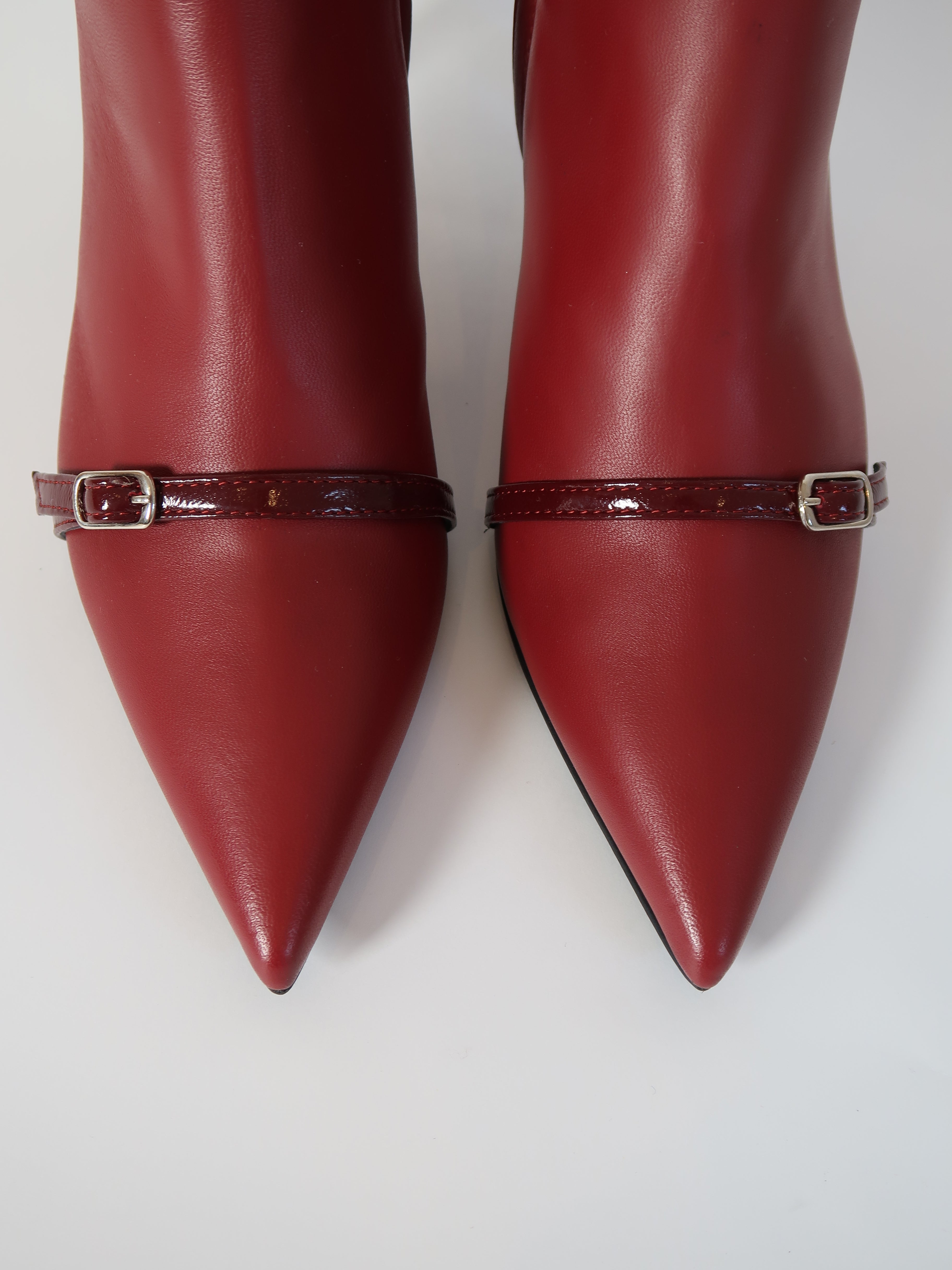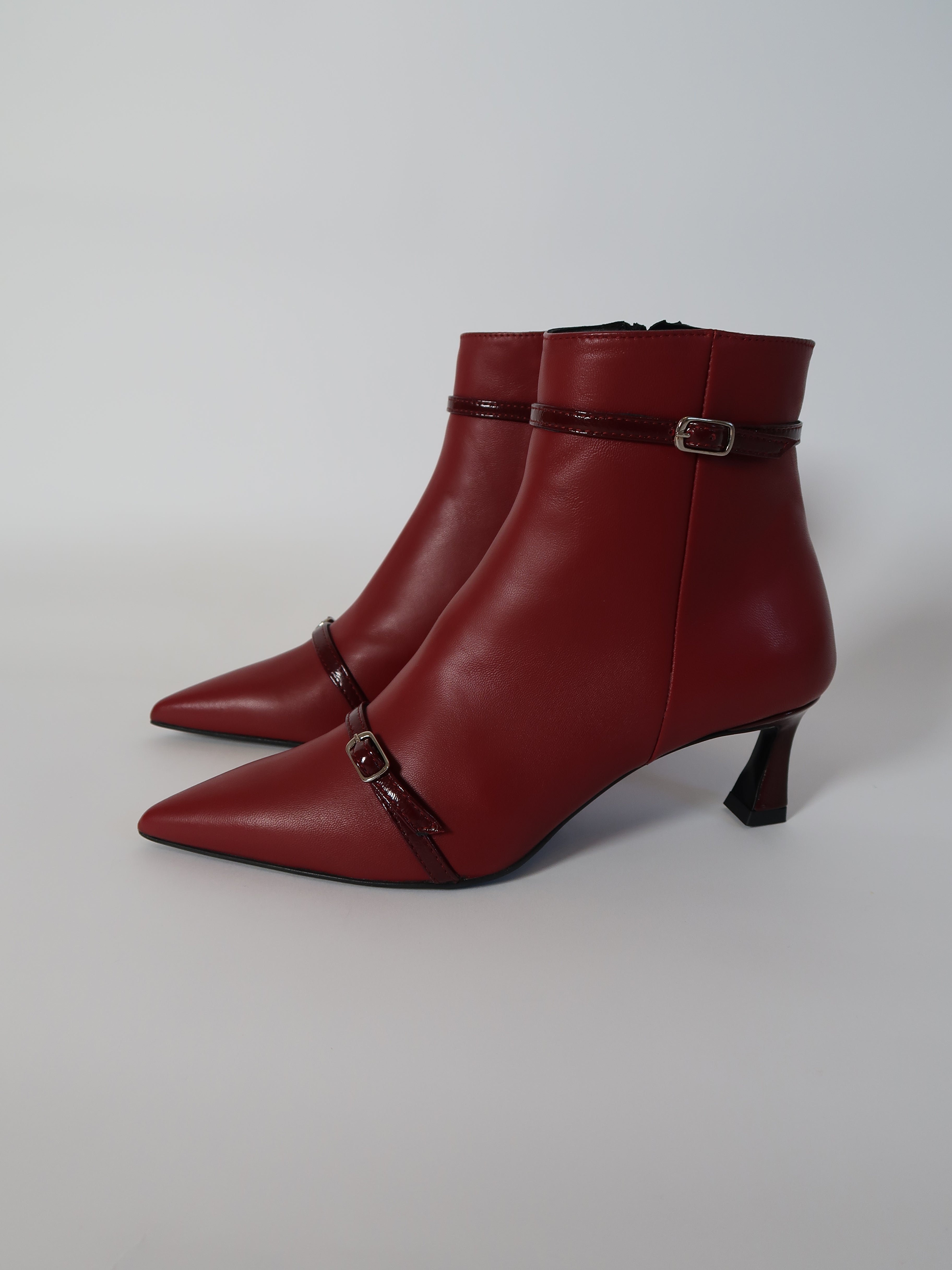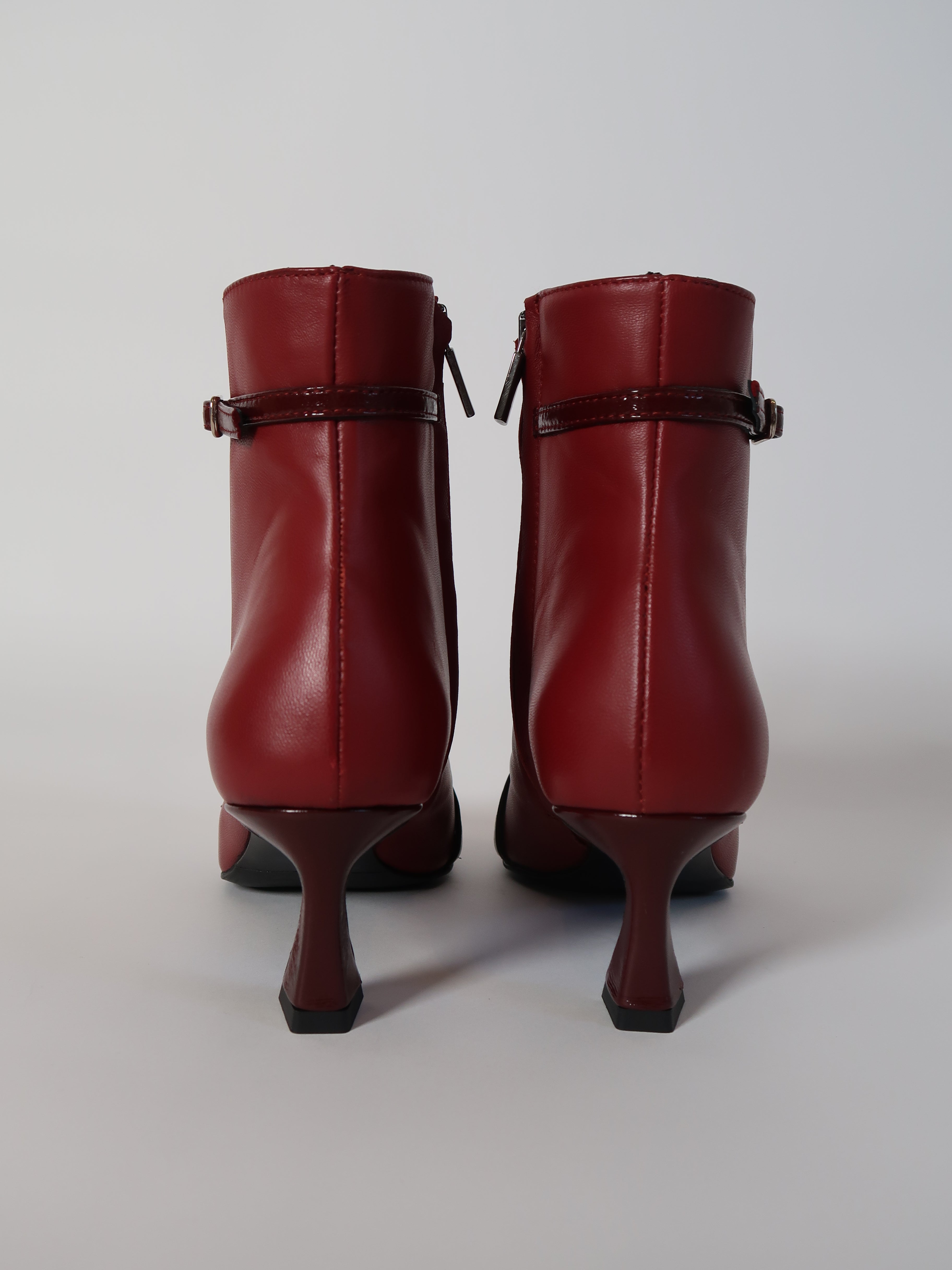 מגפונים קצרים מעור בעיצוב קלאסי ויוקרתי בגוון בורדו . סיומת מחודדת מלפנים עם עקב יציב בצבע תואם; רוכסן בצד הפנימי לנעילה קלה, דיטייל של רצועה דקה עם אבזם כסוף סביב הקרסול ובחזית, מוסיף טאץ' מתוחכם ומרשים