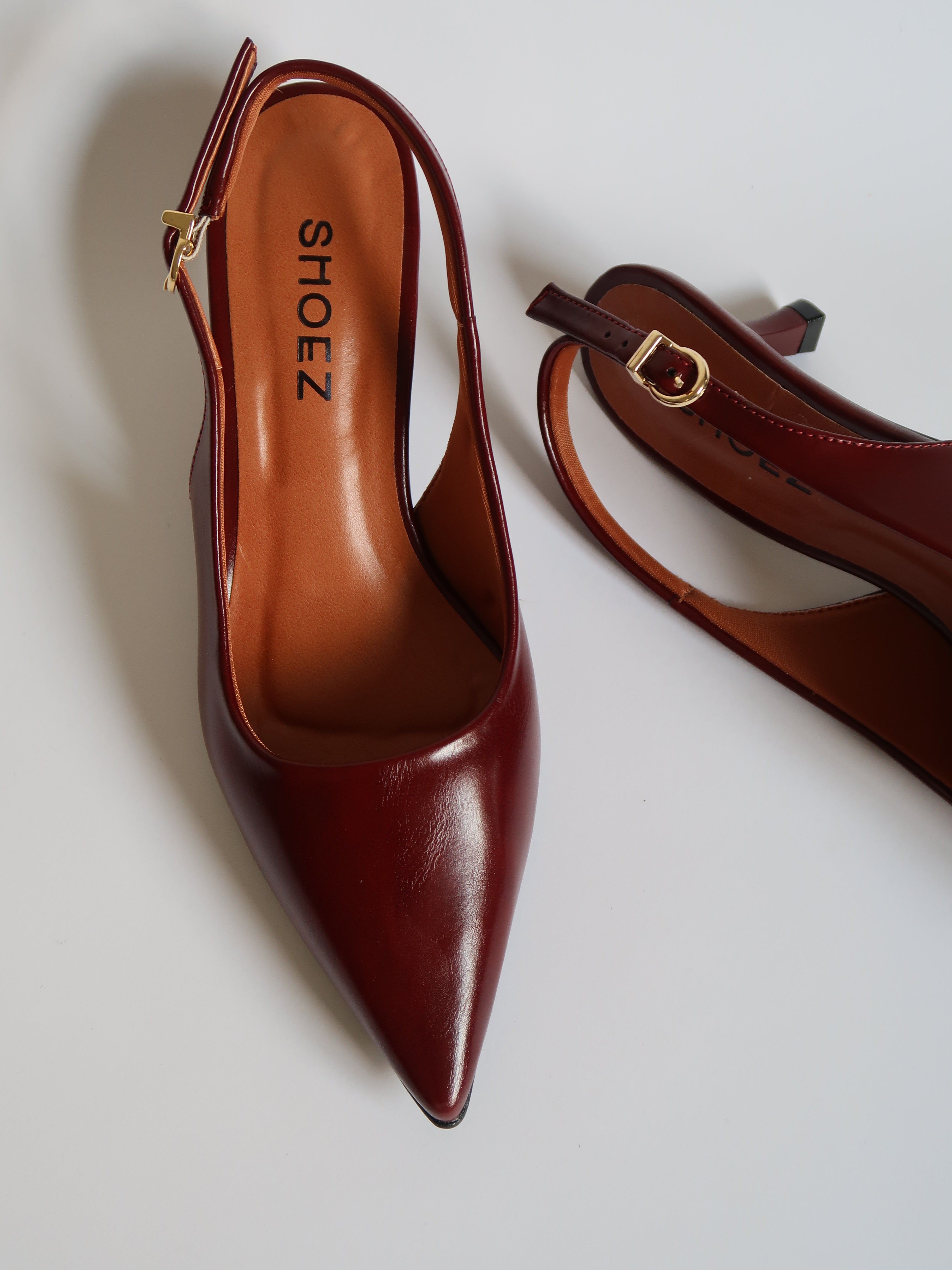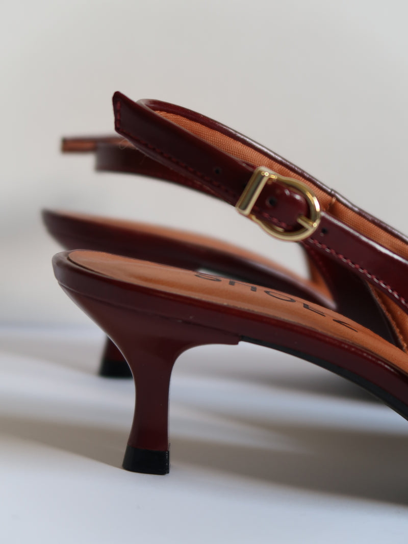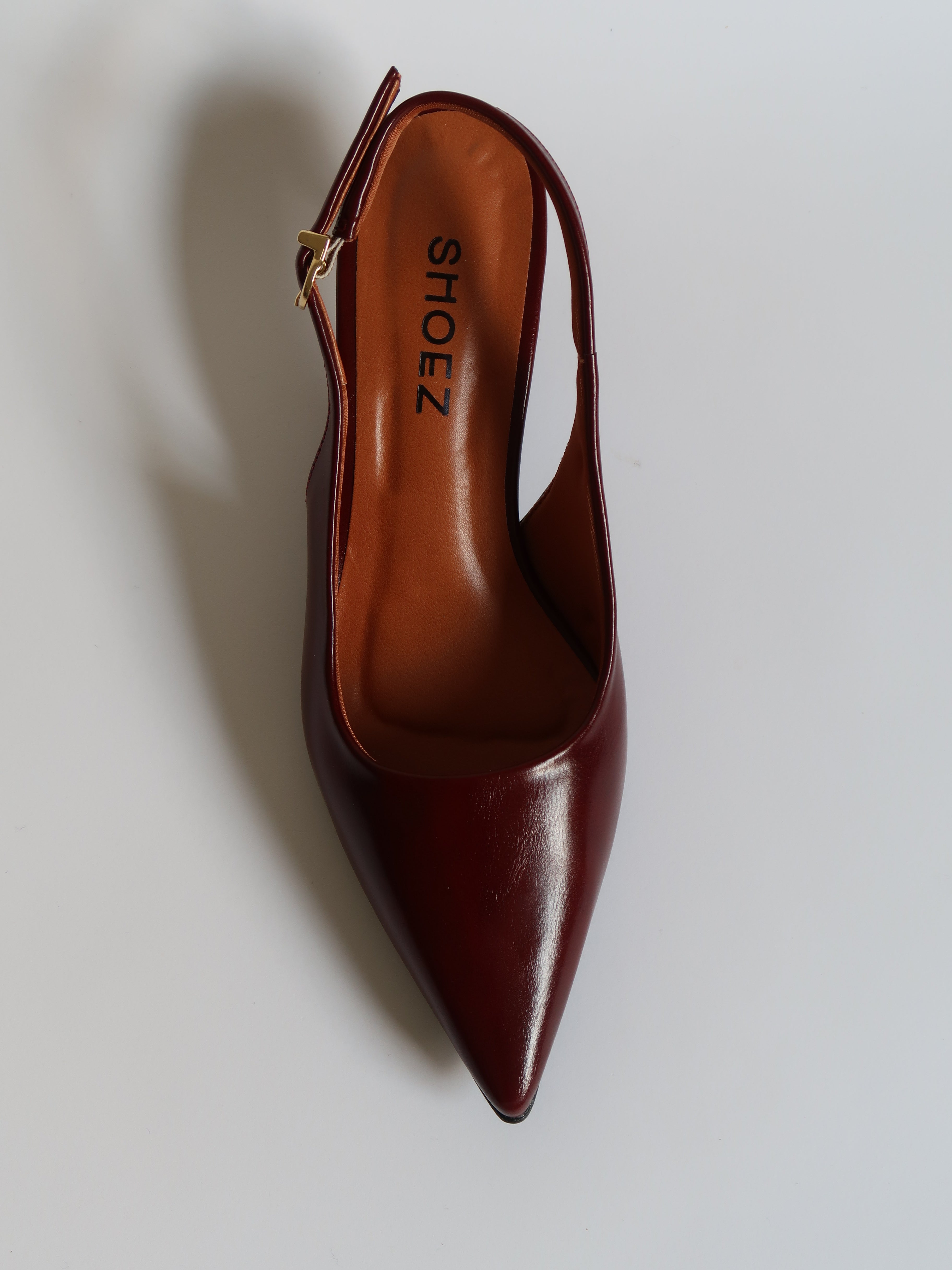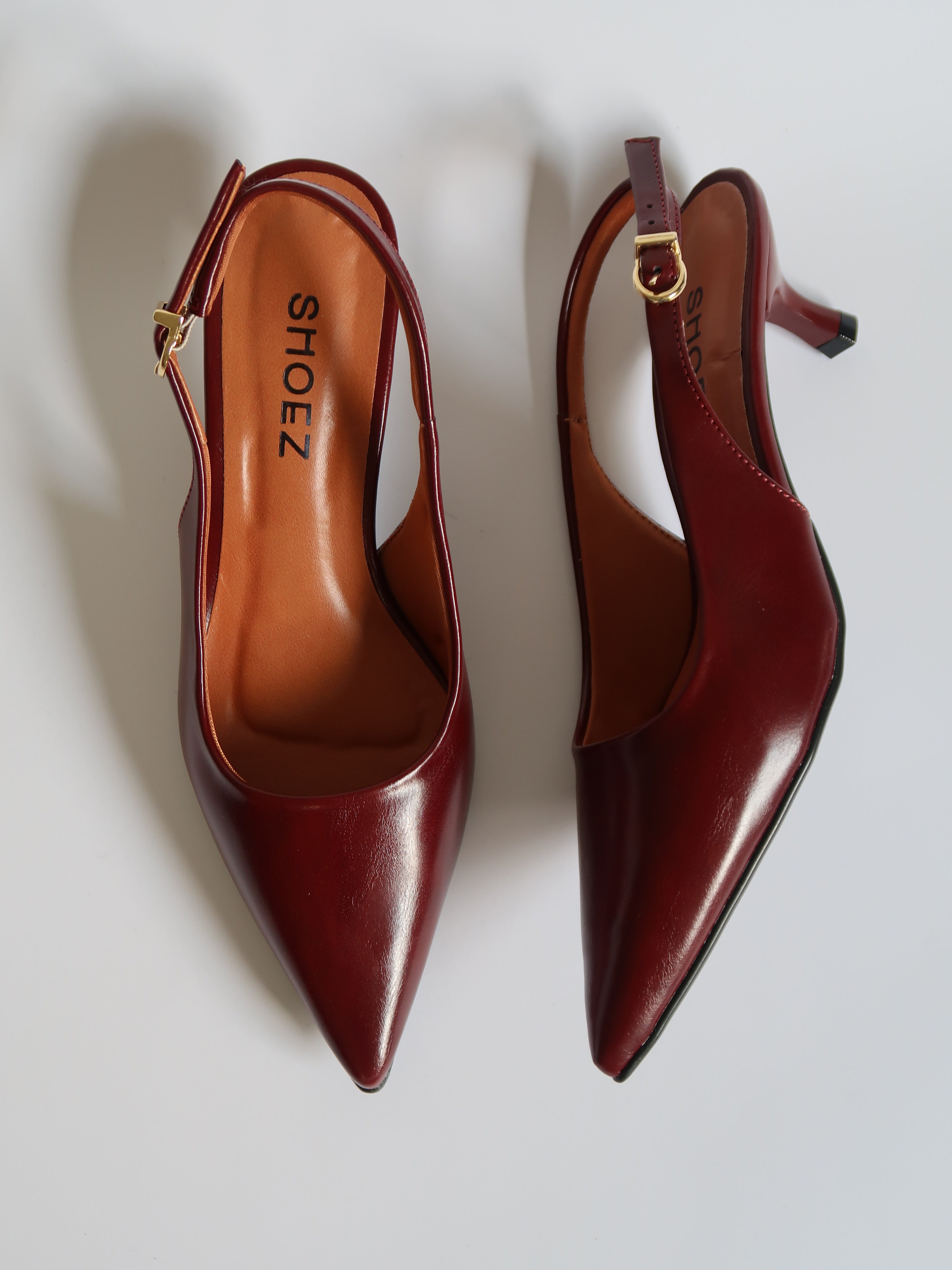 נעלי עקב בגוןן בורדו עם מפתח מחודד ורצועה קרסול אחורית עם סגירה עם אבזם