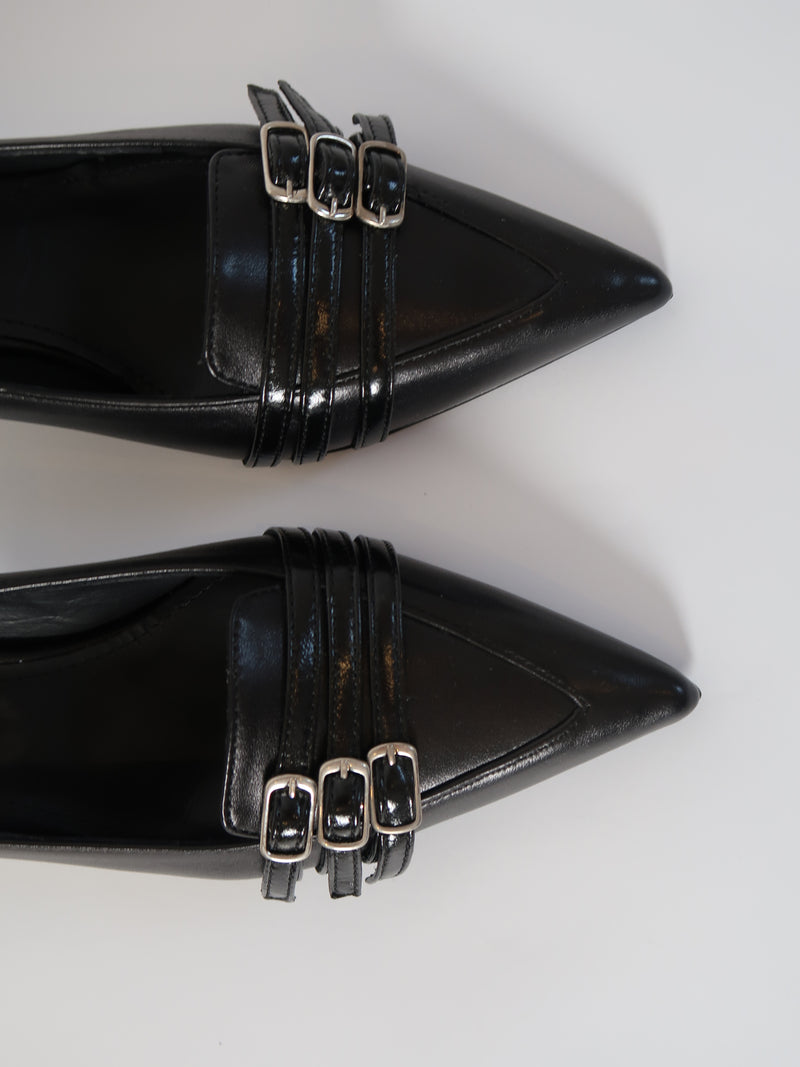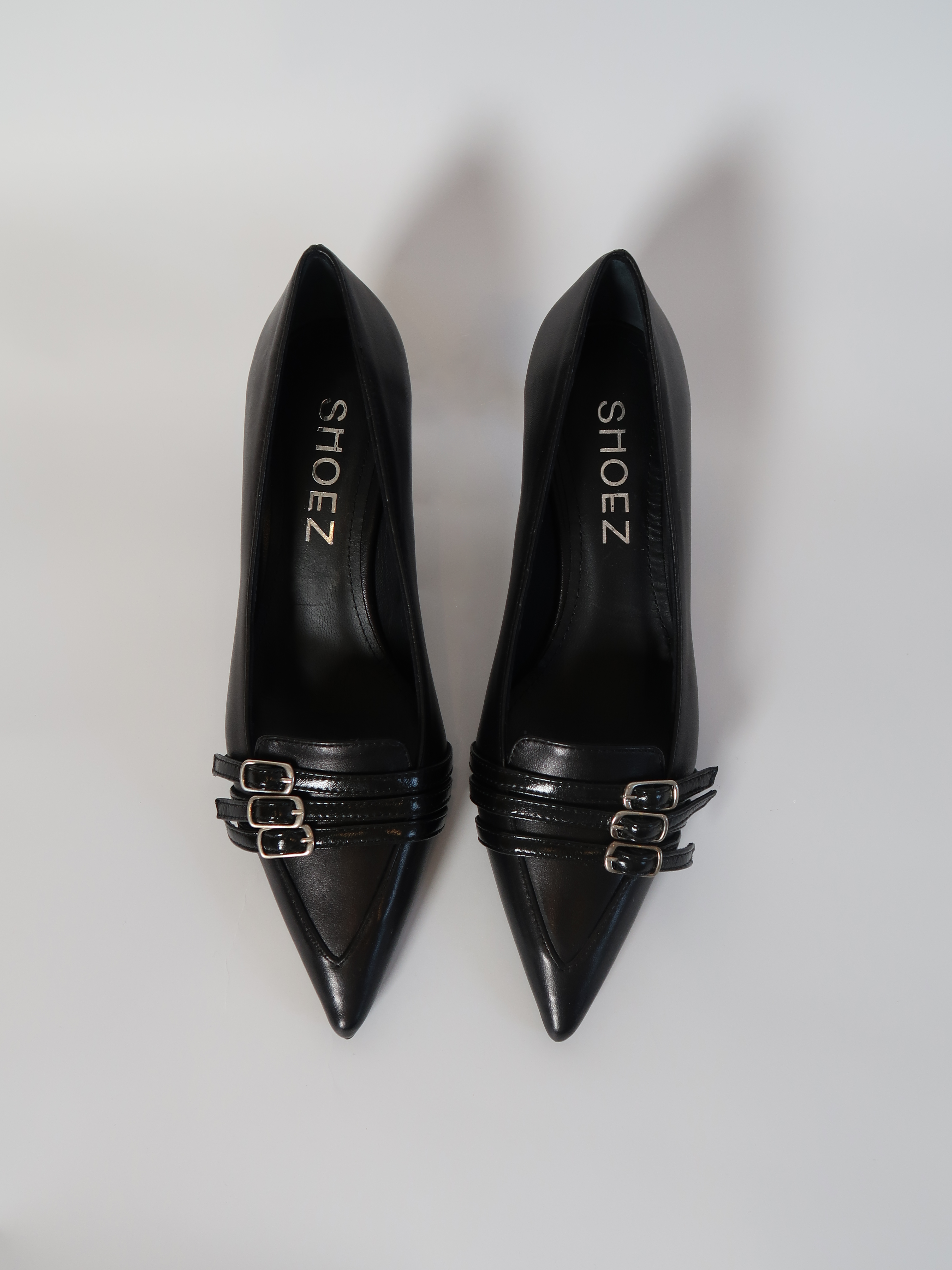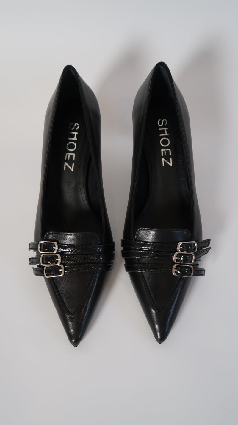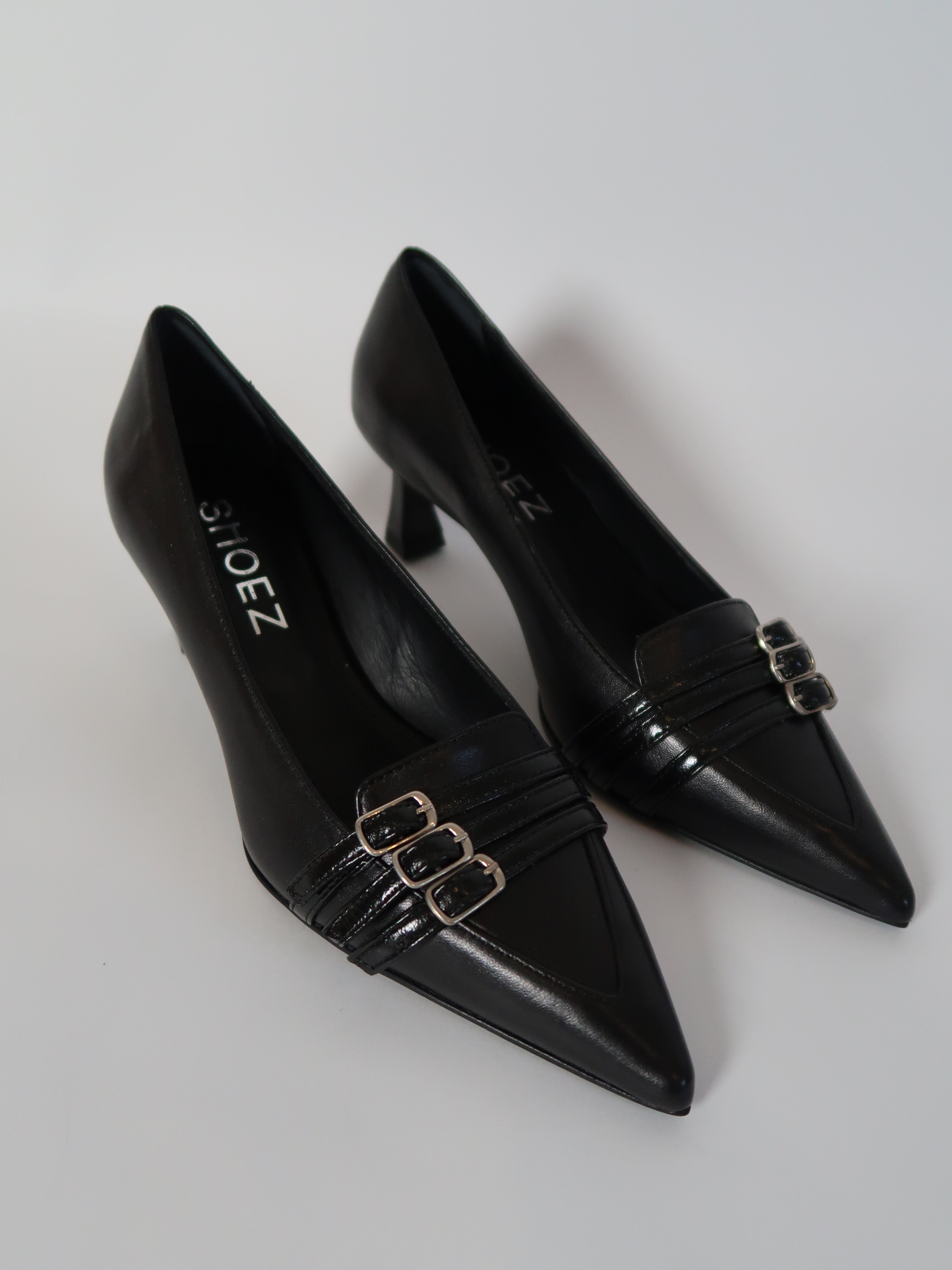נעלי סירה מעור רך בגוון שחור, עיצוב קלאסי עם מפתח בגזרת אוקספורד ועקב יציב ונוח, סיומת מחודדת, שלוש רצועות בחזית בגימור מבריק וסגירת אבזם בצבע כסף שמעניק מראה נשי ומתוחכם מבלי לוותר על נוחות. דגם שמשתלב עם כל לוק – מהמשרד ועד ערב, ומרגיש תמיד נכון.