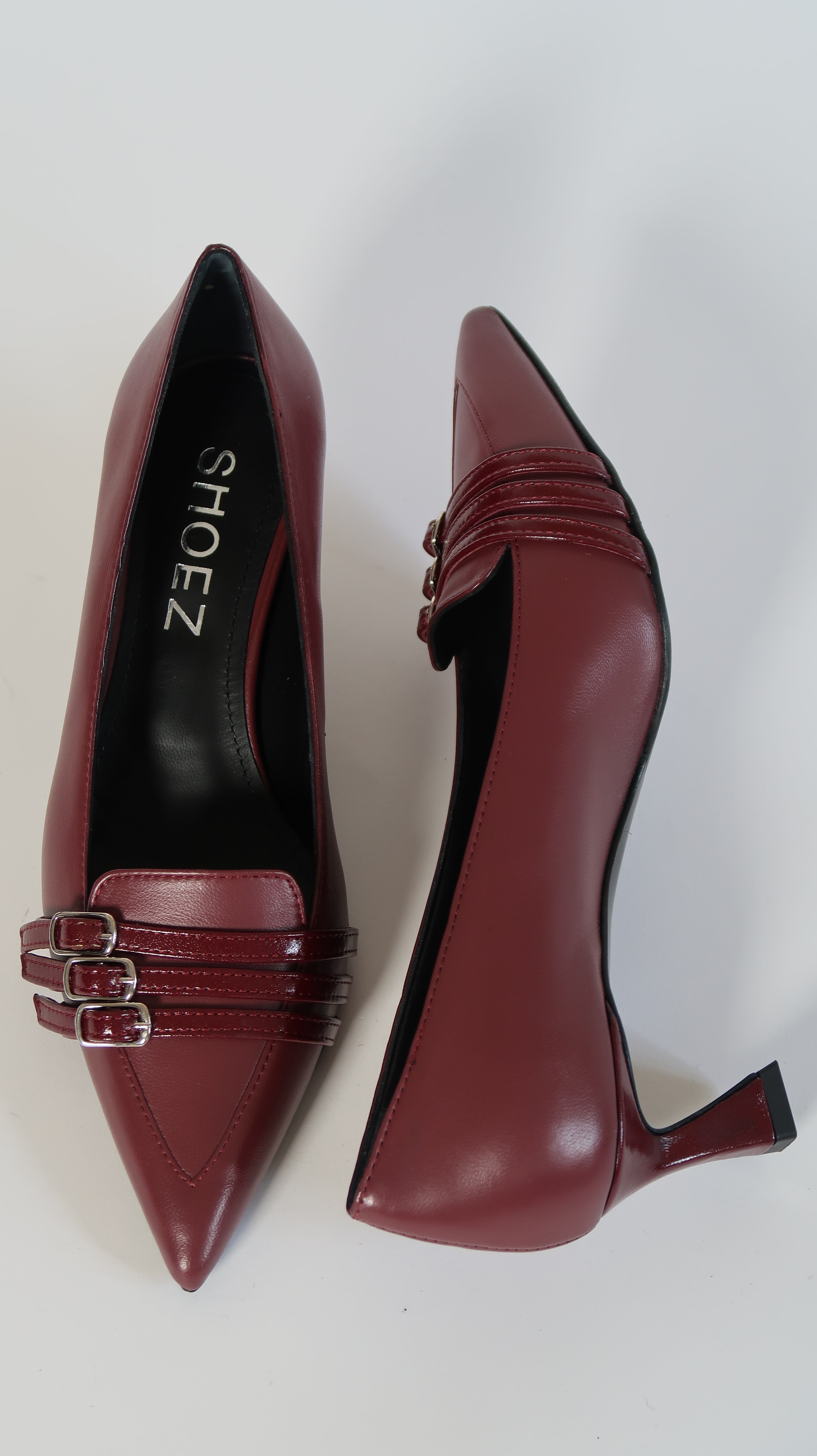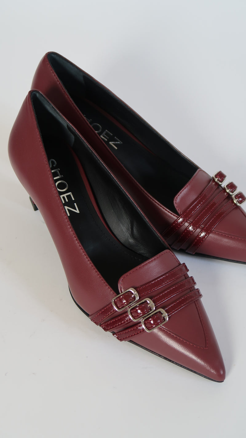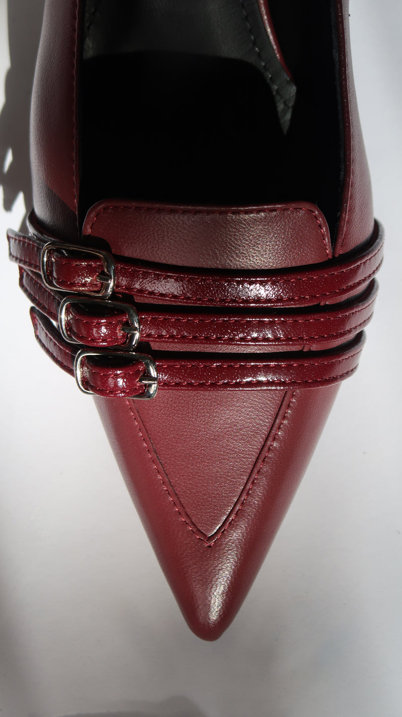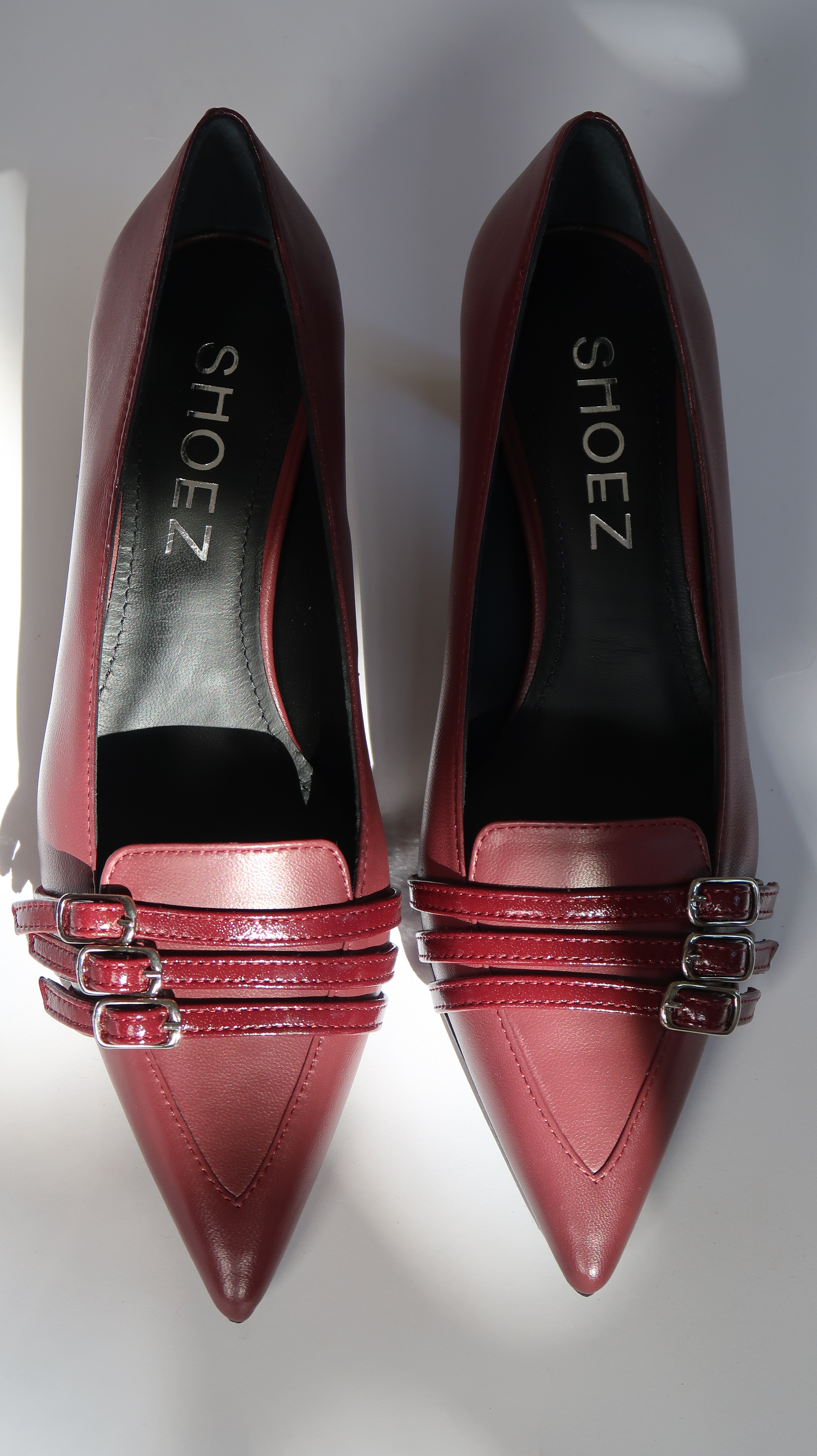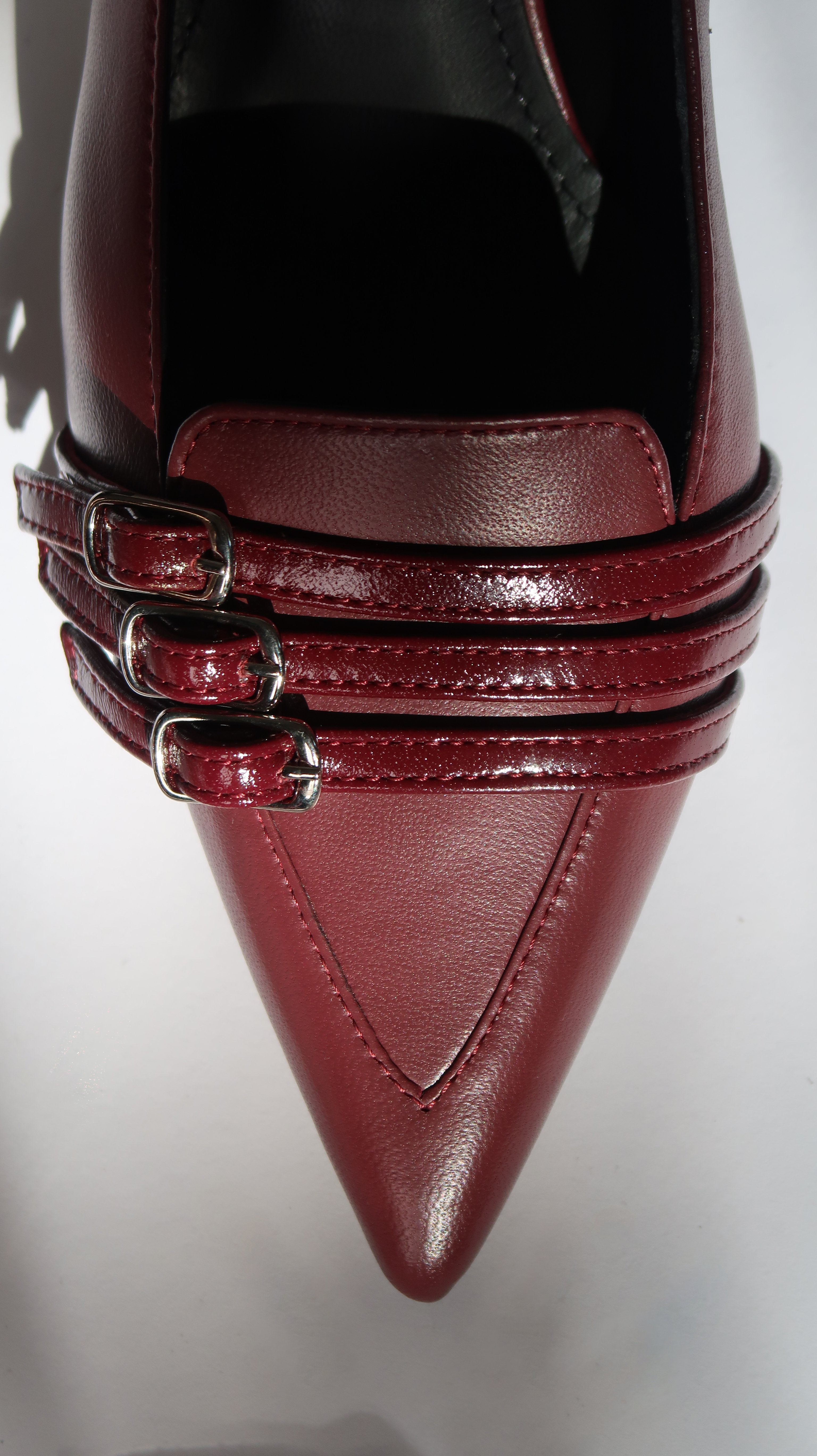 נעלי סירה מעור רך בגוון בורדו, עיצוב קלאסי עם מפתח בגזרת אוקספורד ועקב יציב ונוח, סיומת מחודדת, שלוש רצועות בחזית בעור מבריק וסגירת אבזם בצבע כסף שמעניק מראה נשי ומתוחכם מבלי לוותר על נוחות. דגם שמשתלב עם כל לוק – מהמשרד ועד ערב, ומרגיש תמיד נכון.