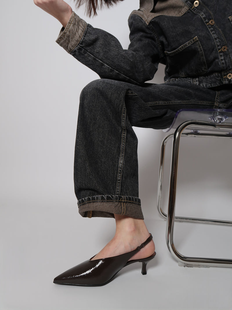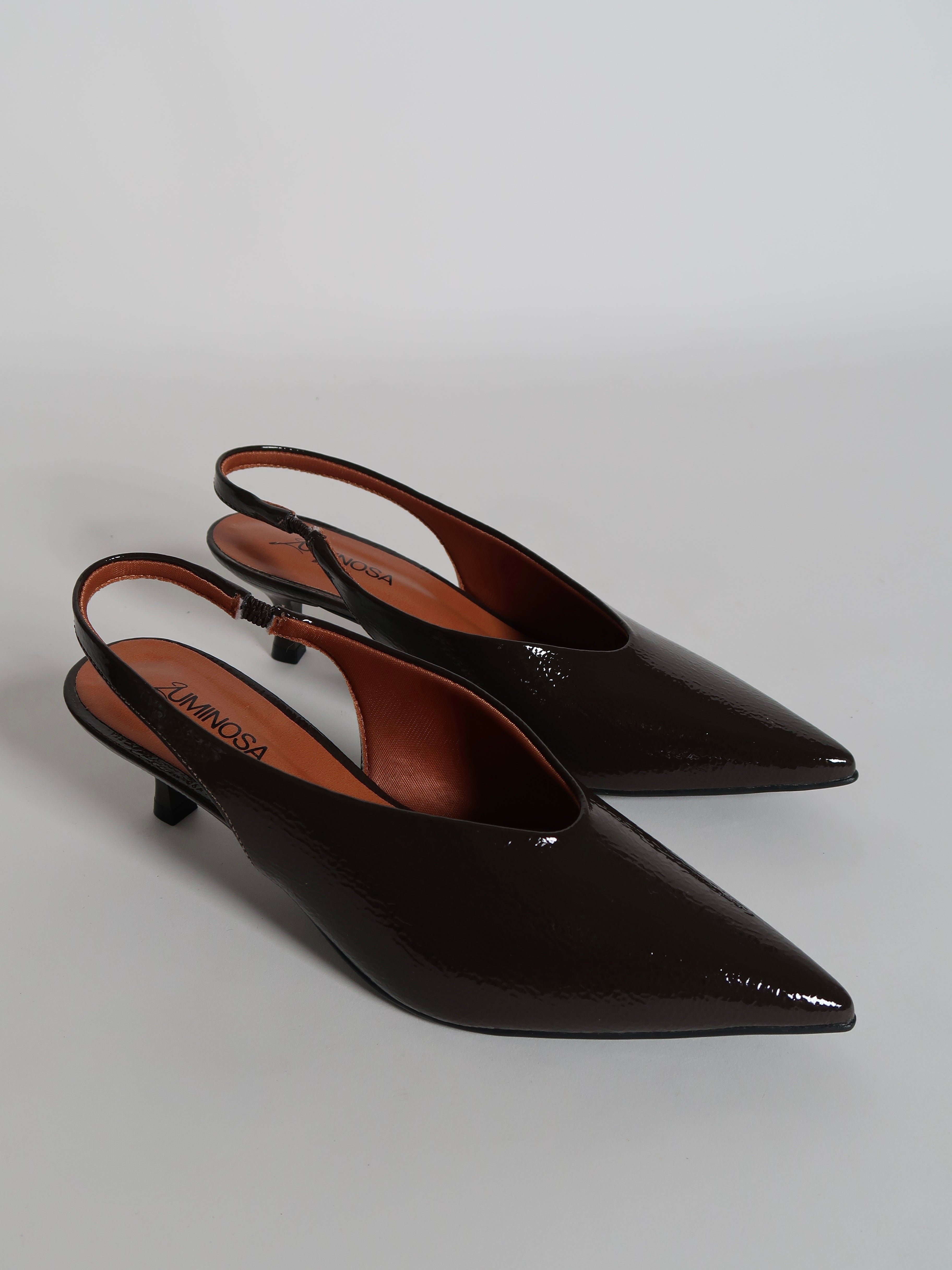 נעלי סירה בצבע חום כהה בגימור מבריק ורך, בעלות קידומת מחודדת ורצועת עקב עם סגירת גומי. העיצוב המחודד מעניק מראה אלגנטי ומעודן, דגם שמשלב בין קלאסיקה לנגיעה מודרנית